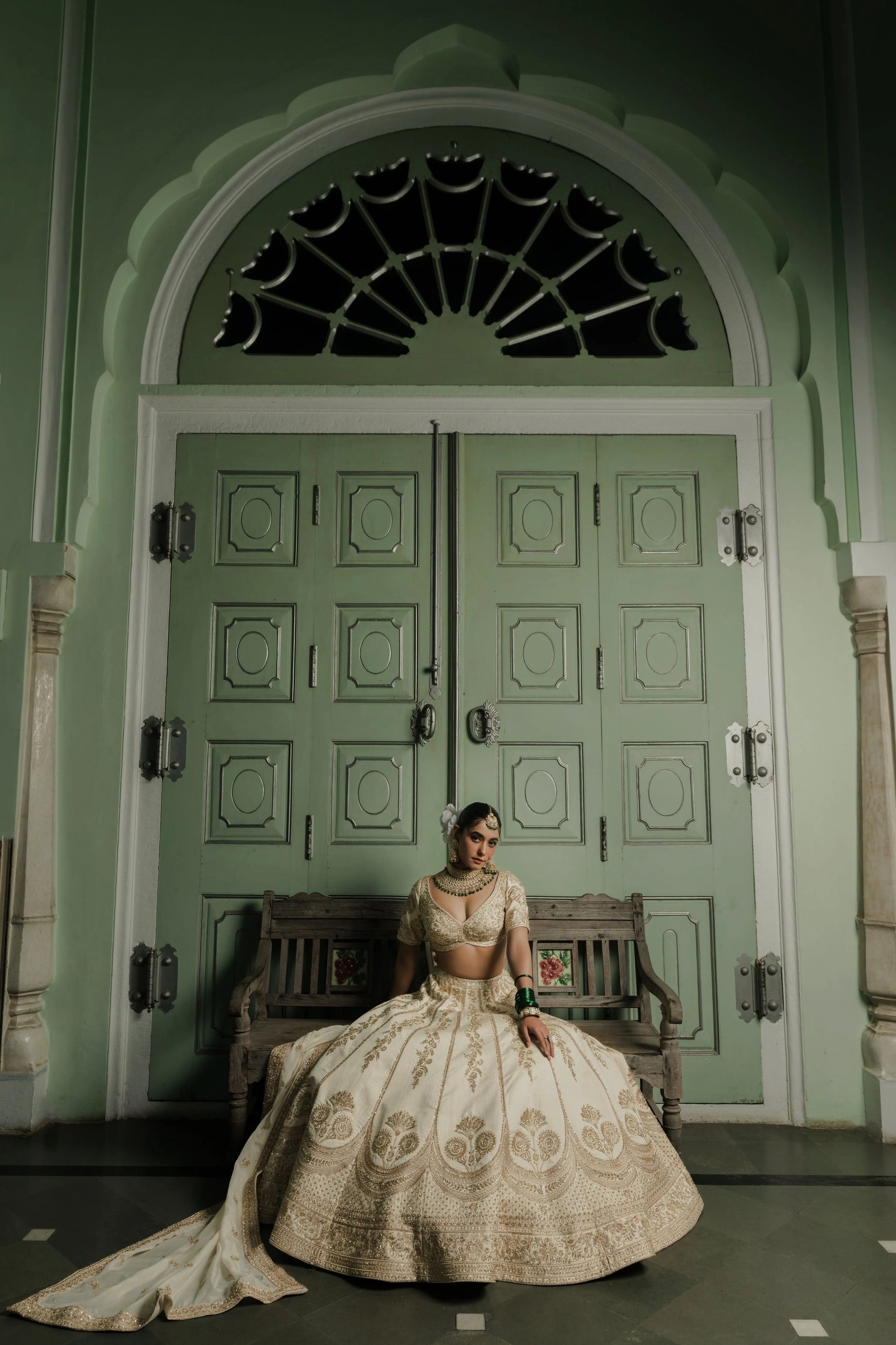 Emanating grandeur in every fold, this ivory raw silk lehenga is a masterclass in regal opulence. The flared skirt features ornate antique zardosi embroidery arranged in symmetrical vertical panels, each crowned with exquisite floral motifs and bordered by scalloped, intricately handworked finishes—creating a rich and structured silhouette that's both timeless and majestic.