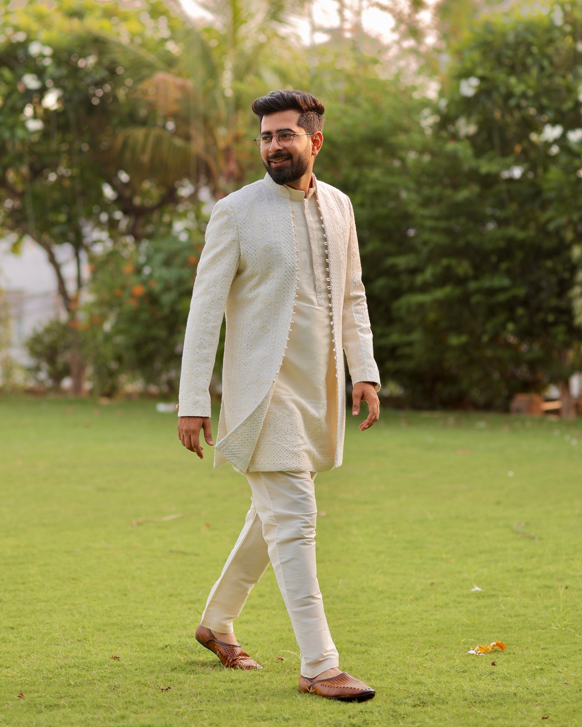 A timeless blend of elegance and sophistication, this ivory Indo-Western ensemble is crafted for the modern gentleman who appreciates understated luxury. The look features a straight-cut kurta paired with trousers, topped with a richly embroidered long jacket showcasing delicate threadwork and textured detailing. The soft ivory hue exudes grace, making it ideal for daytime weddings, haldi, engagement ceremonies, or festive gatherings.