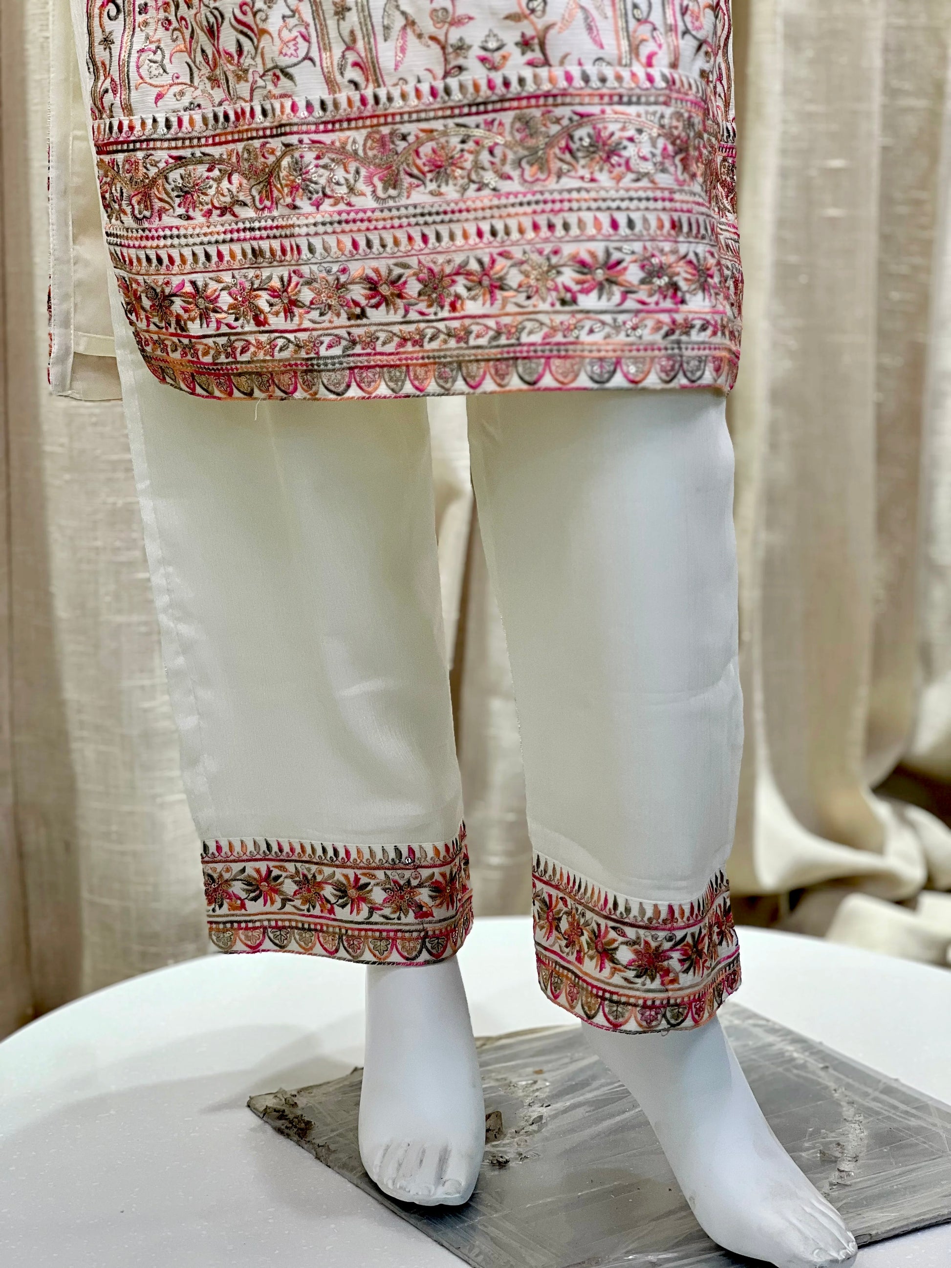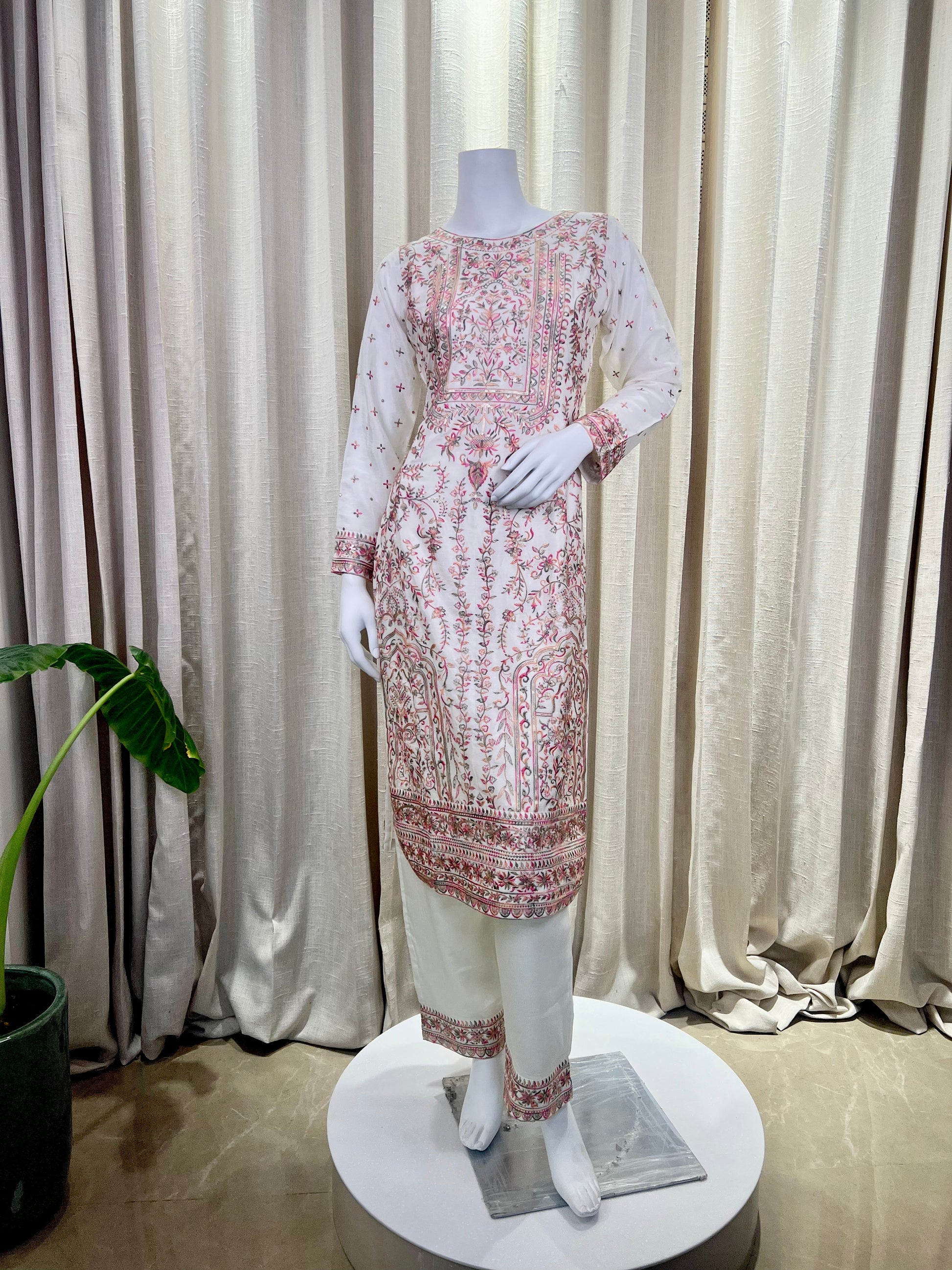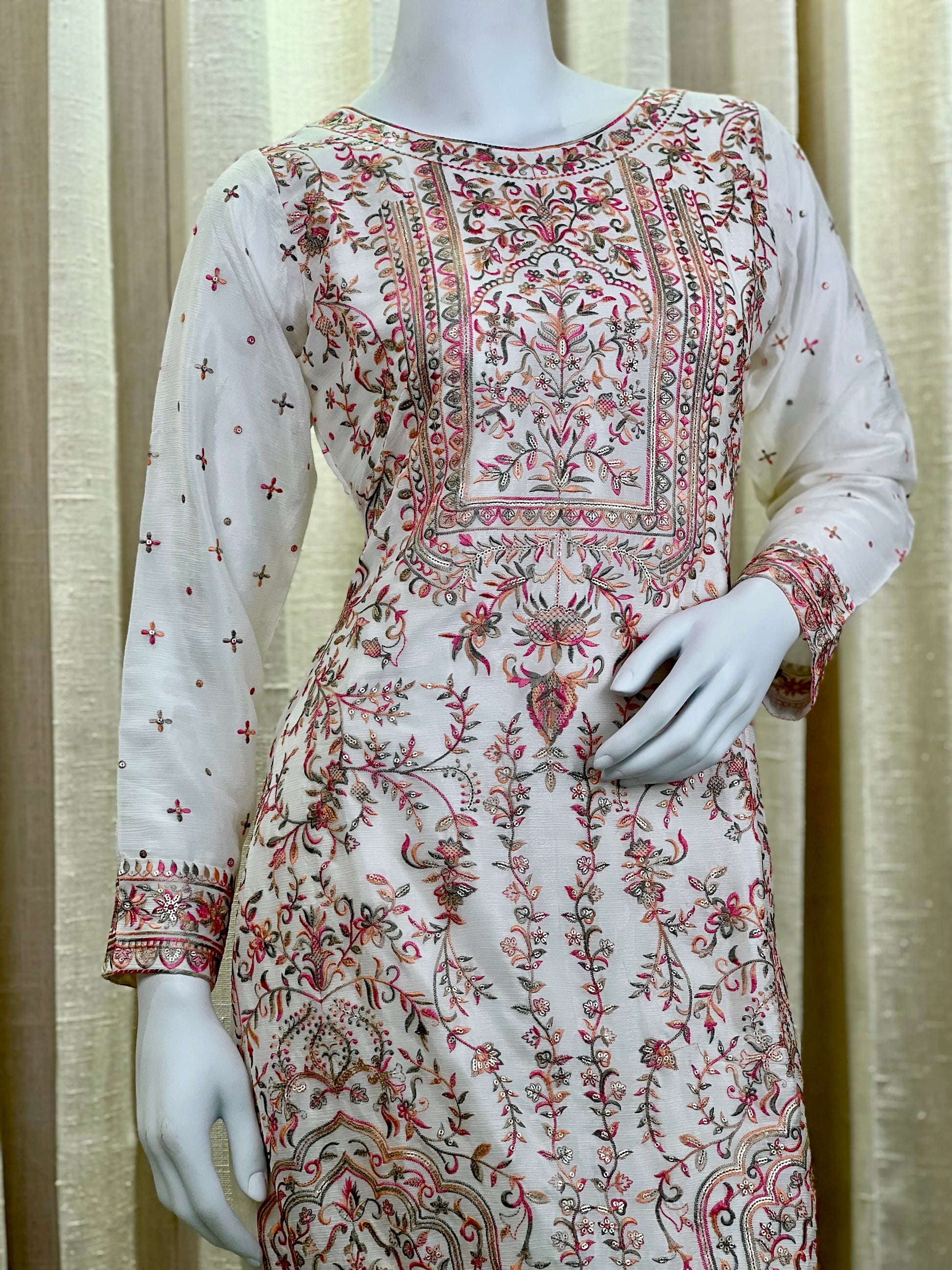 Elevate your ethnic wardrobe with this ivory white kurti set, adorned with intricate multicolor thread embroidery and delicate sequin work. The fine floral and geometric motifs on the kurta front and sleeves add a regal charm, making it a perfect pick for both daytime festivities and elegant evening gatherings.