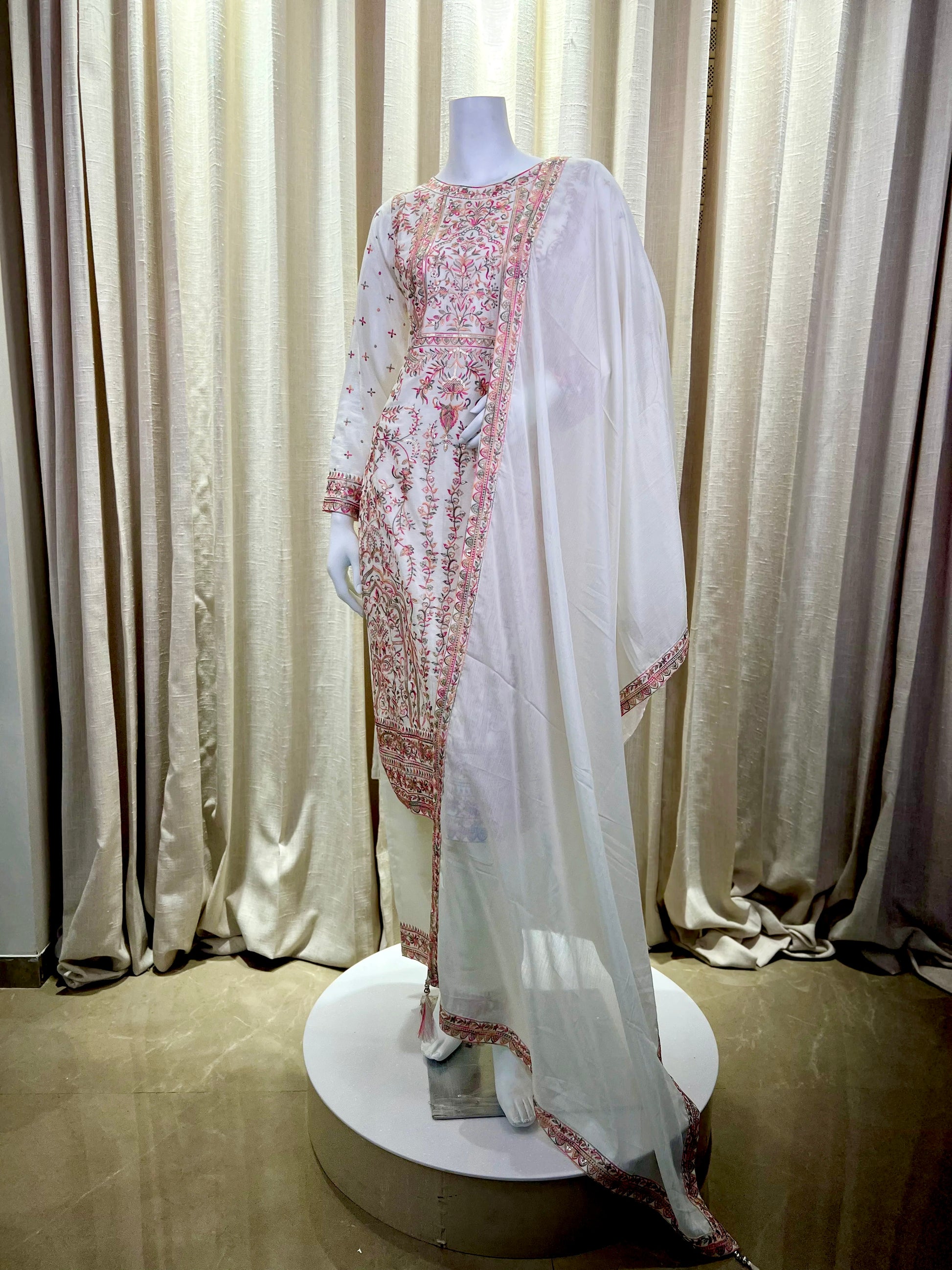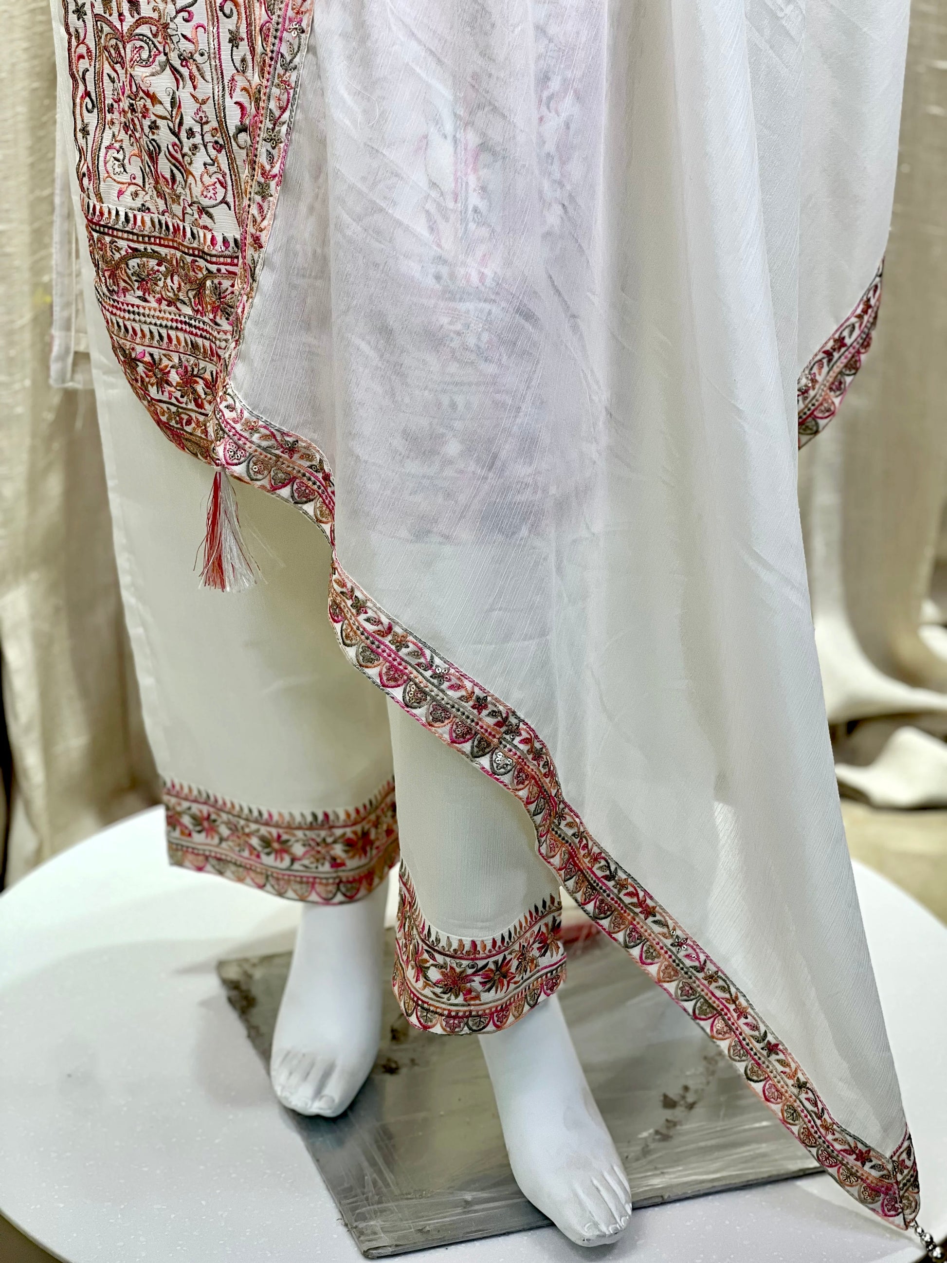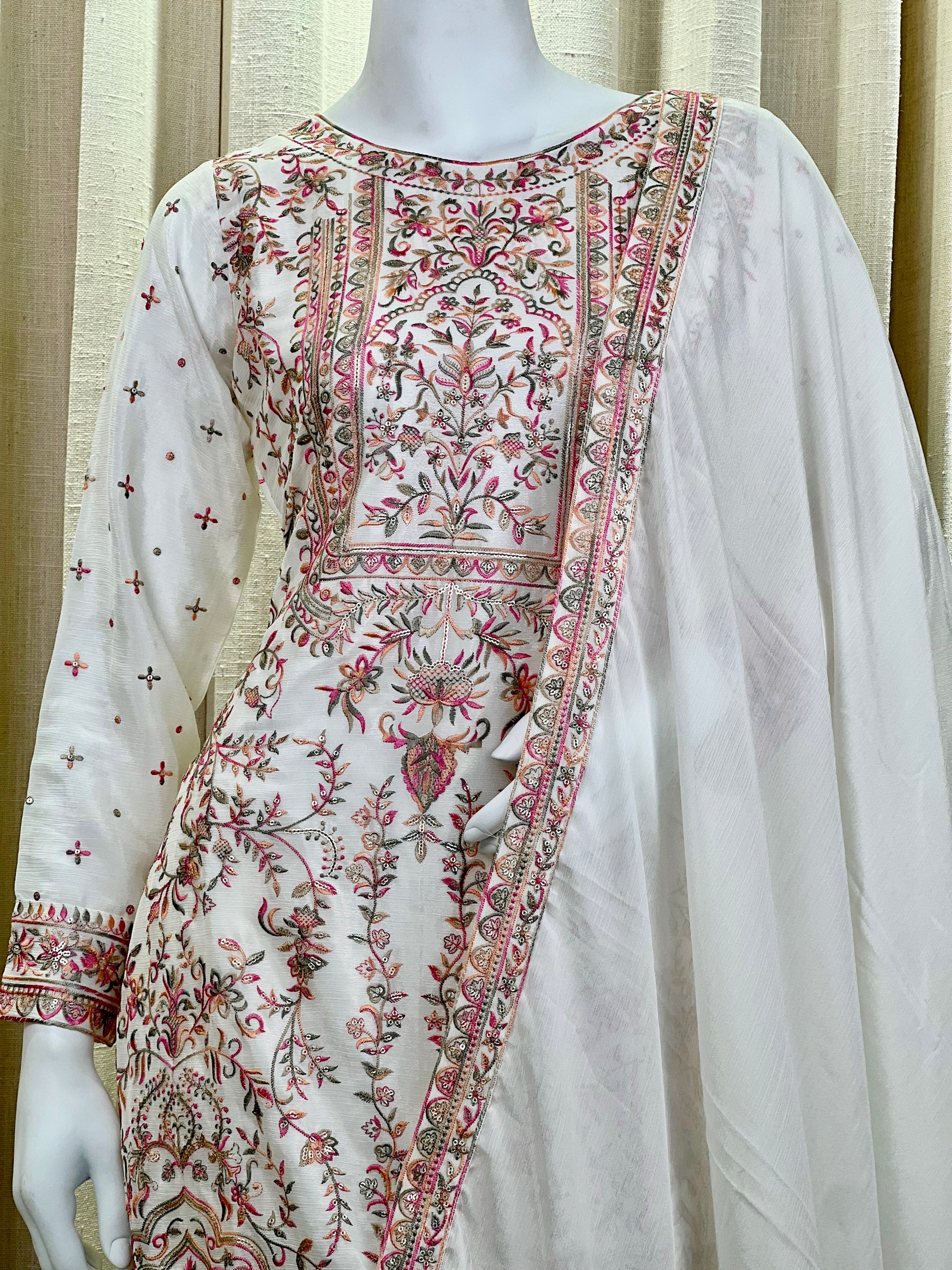 Elevate your ethnic wardrobe with this ivory white kurti set, adorned with intricate multicolor thread embroidery and delicate sequin work. The fine floral and geometric motifs on the kurta front and sleeves add a regal charm, making it a perfect pick for both daytime festivities and elegant evening gatherings.