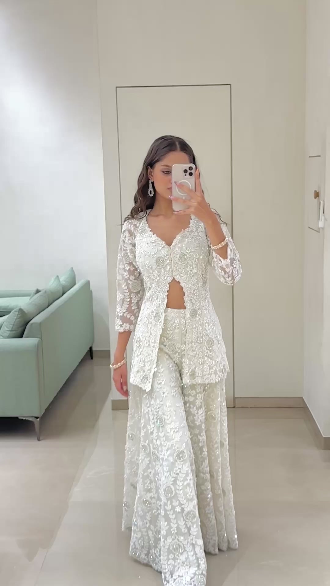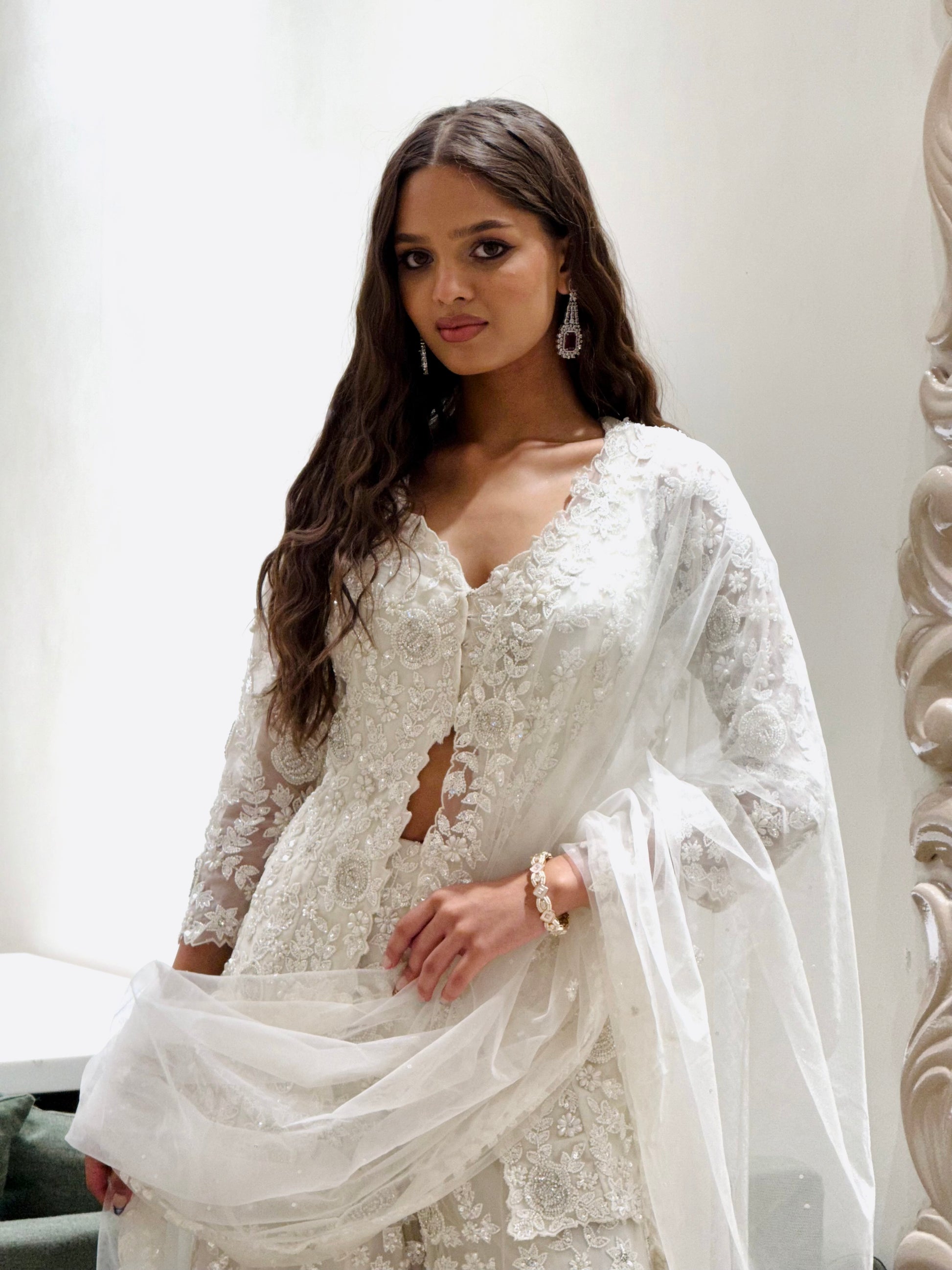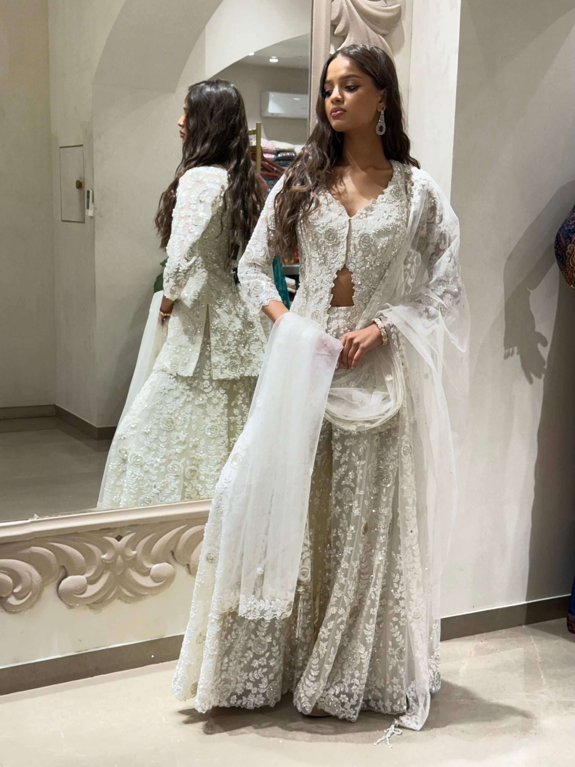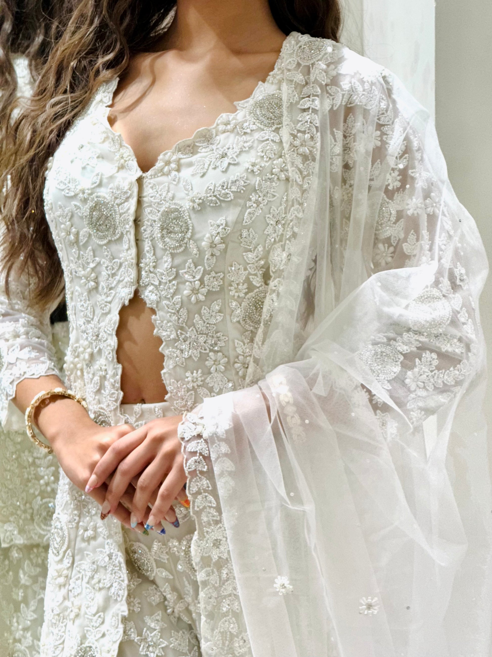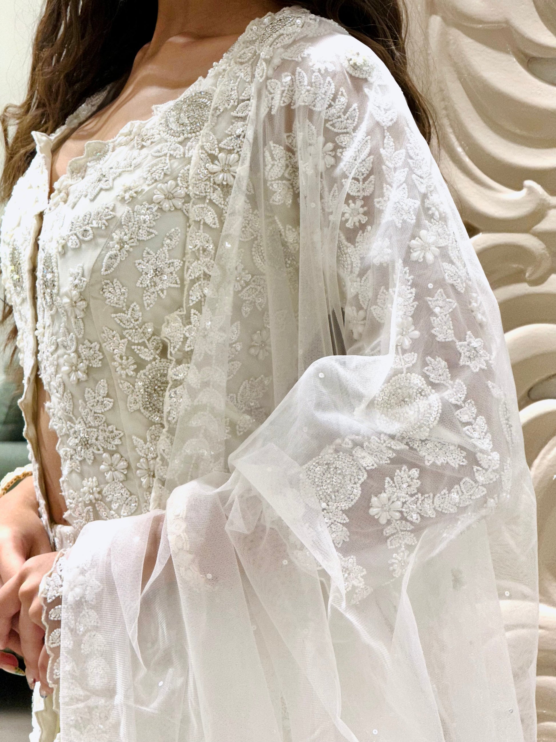 An elegant ivory white Indo-Western set that redefines understated luxury. The outfit features intricate floral embroidery crafted with fine thread and bead detailing, creating a subtle shimmer without the use of mirror or pistol stitch. The scalloped neckline and front-open silhouette add a modern flair, while the lightweight net dupatta adorned with soft floral patterns completes the ethereal look. Perfect for pre-wedding functions, receptions, or intimate festive events, this ensemble is a timeless addition to any wardrobe.