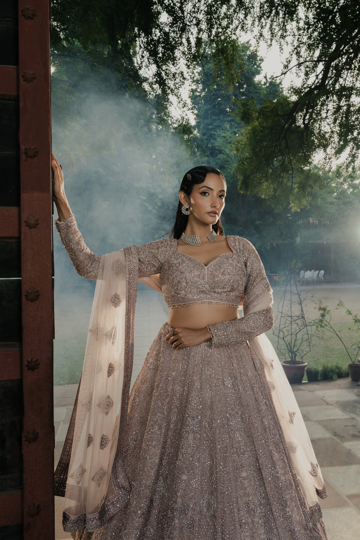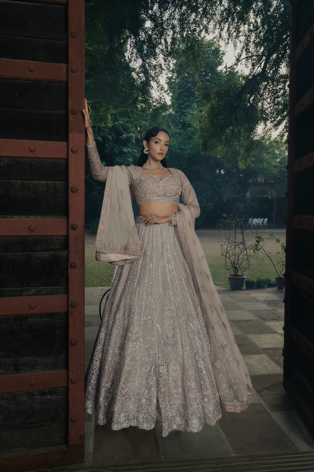 The blouse (lehenga choli) features a delicate sweetheart neck with full sleeves, offering both comfort and elegance. Its ready-made design ensures a perfect fit while radiating timeless beauty with every stitch.