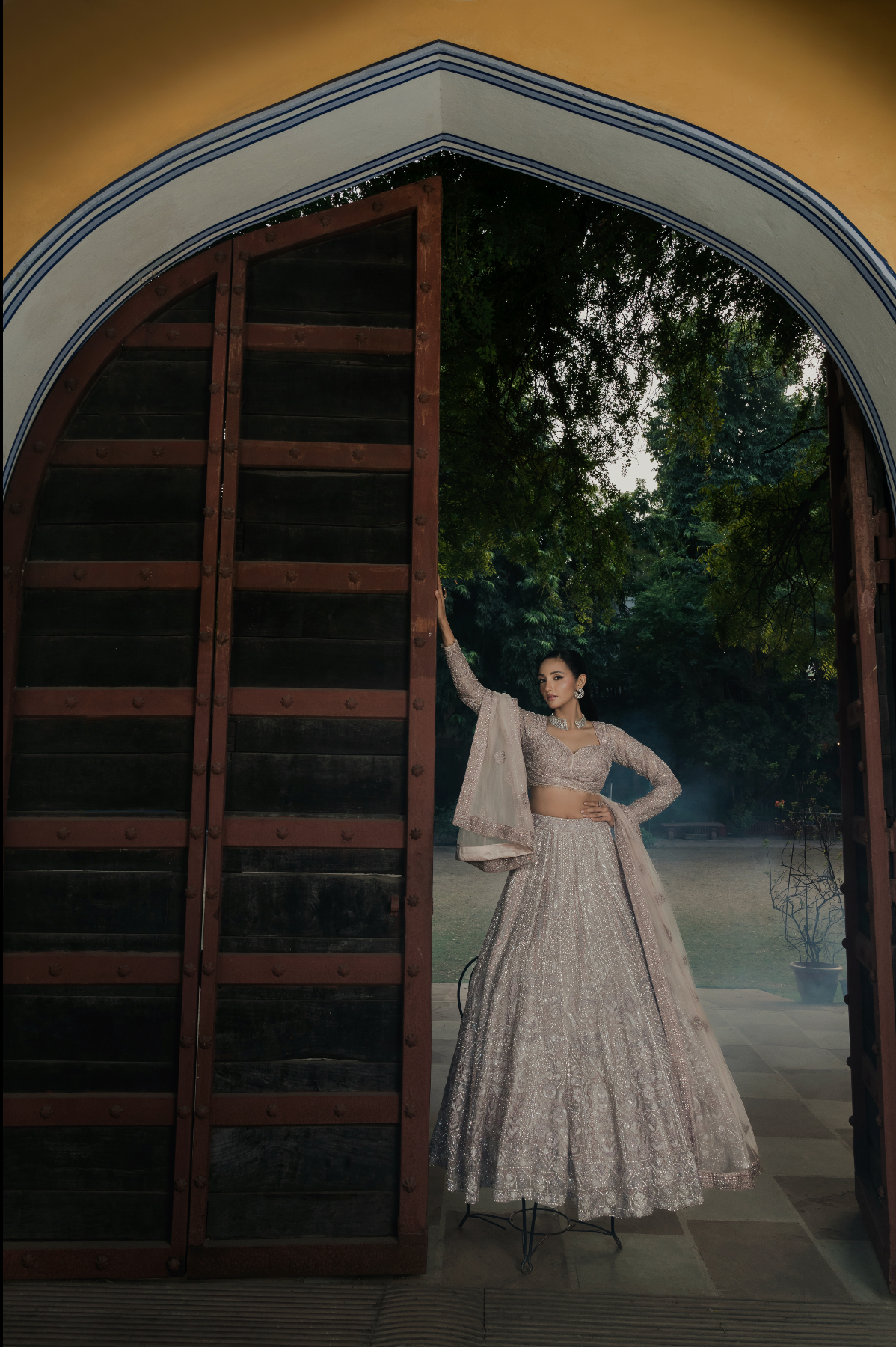 Ivory White Net Designer Lehenga with Sequins & Embroidery