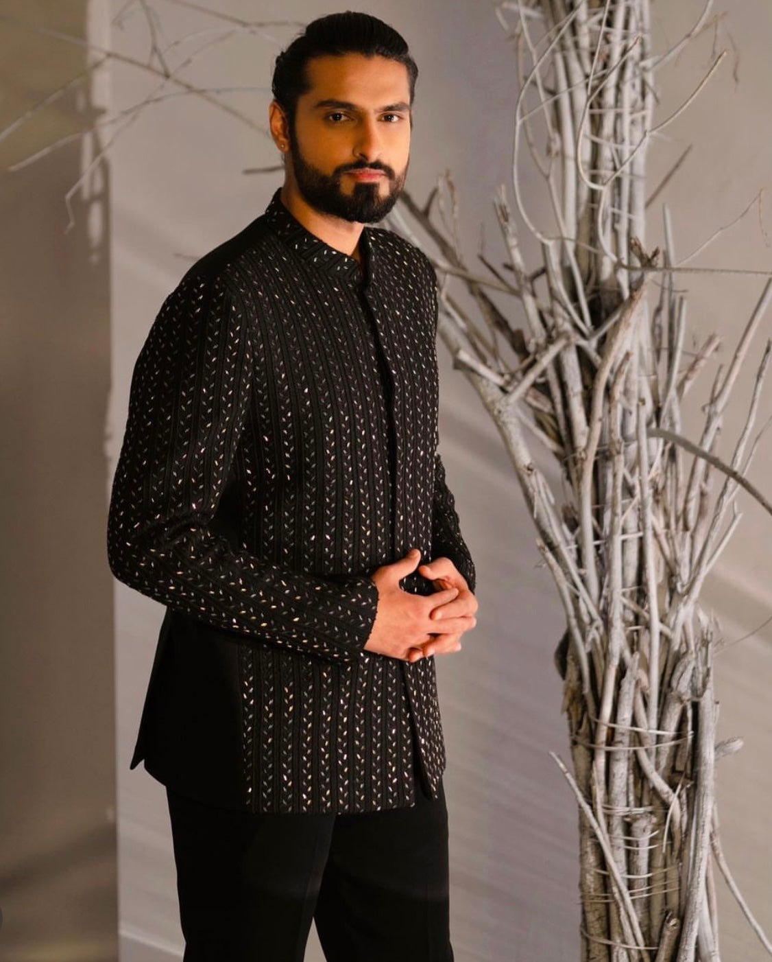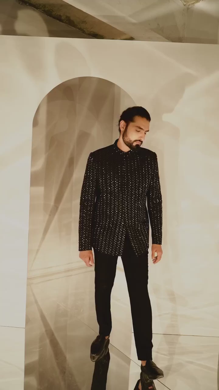 Elevate your formal attire with this sleek black Jodhpuri suit for men, complete with matching black pants for a cohesive look. The jacket boasts a Nehru collar and subtle detailing, while the trousers offer a tailored fit for a polished appearance. Perfect for a range of formal occasions, this ensemble exudes timeless sophistication and modern charm.