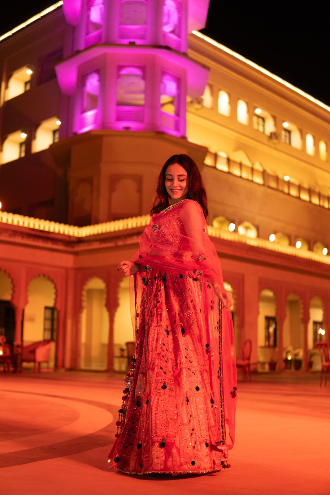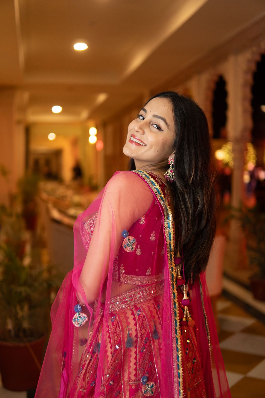 "Adorned by the elegant Kavyam Limaye, this enchanting ensemble features a Dark Pink Lehenga embellished with an array of multicolored shades, accompanied by a captivating Floral Dupatta Set. Complemented by a meticulously crafted blouse, this ensemble exudes timeless charm and sophistication, making it perfect for any special occasion where grace meets style."