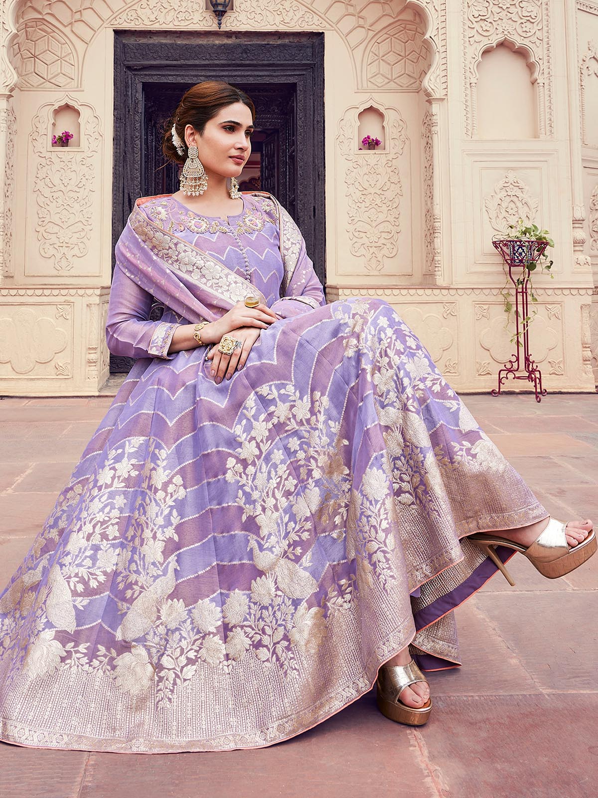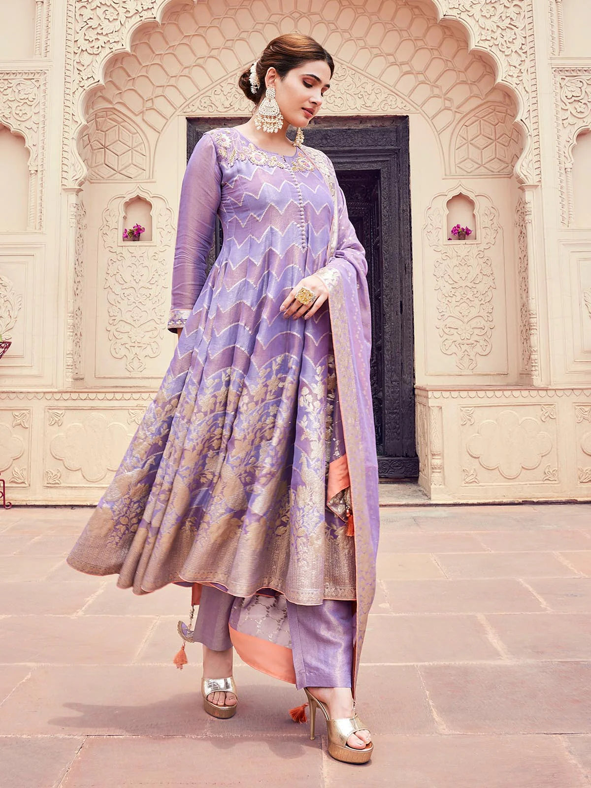 Radiating elegance in a delicate shades of lavender & purple anarkali, she embodies grace with each kali intricately woven in jacquard fabric featuring zig-zag and floral designs. The zardosi floral-embroidered neckline adds a refined touch of luxury. Paired with coordinating laender tissue silk pants and a soft lavender woven floral jacquard dupatta, this outfit is perfect for an elegant day wear celebration.