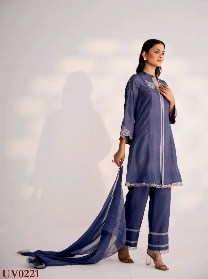 A lavender kurti pant set for women offers a delicate and graceful look. Enhanced with attractive hand-cut designs, it adds an artistic touch. Paired with a matching dupatta, this ensemble radiates elegance and charm, making it perfect for various occasions where you want to stand out with sophistication.