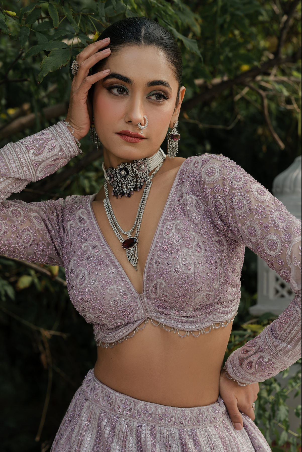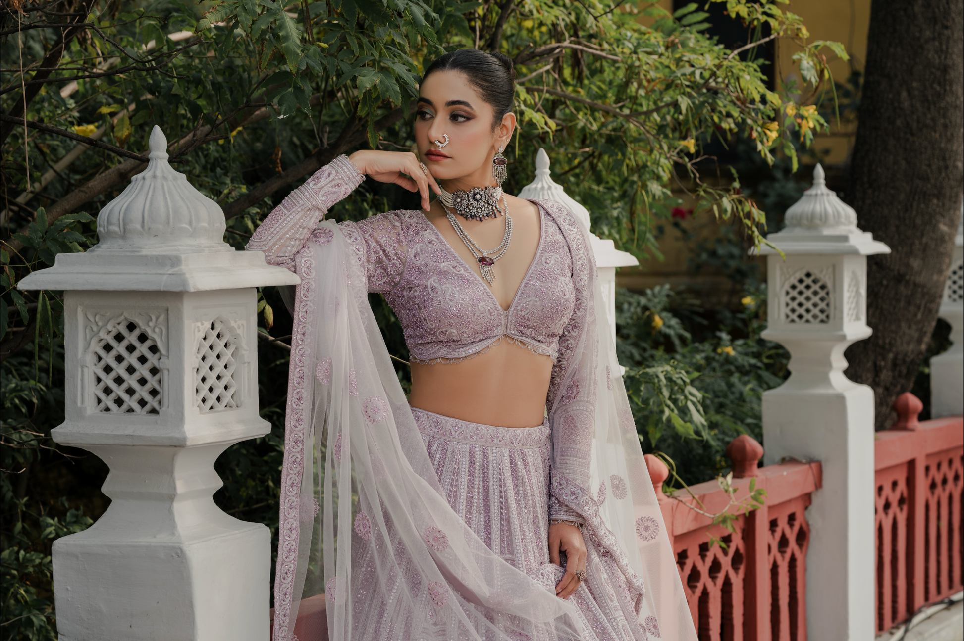 Step into your fairytale moment with this Lavender Lehenga Choli—a blend of purity, craftsmanship, and elegance.