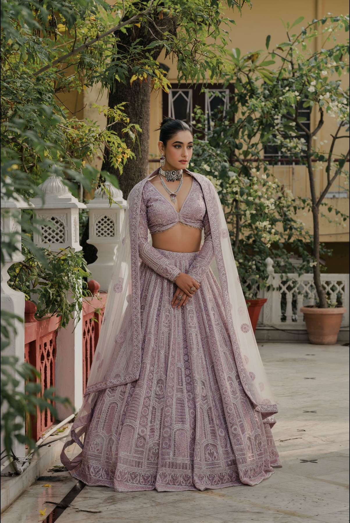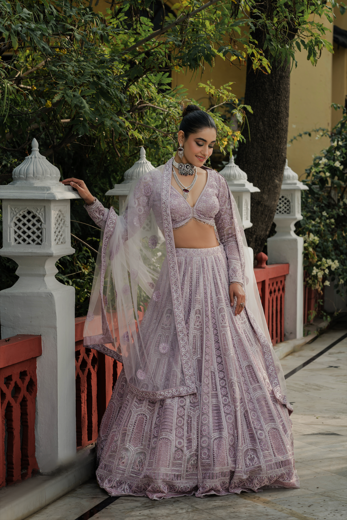 Lavender Net Designer Lehenga with Resham & Pearl Embroidery
