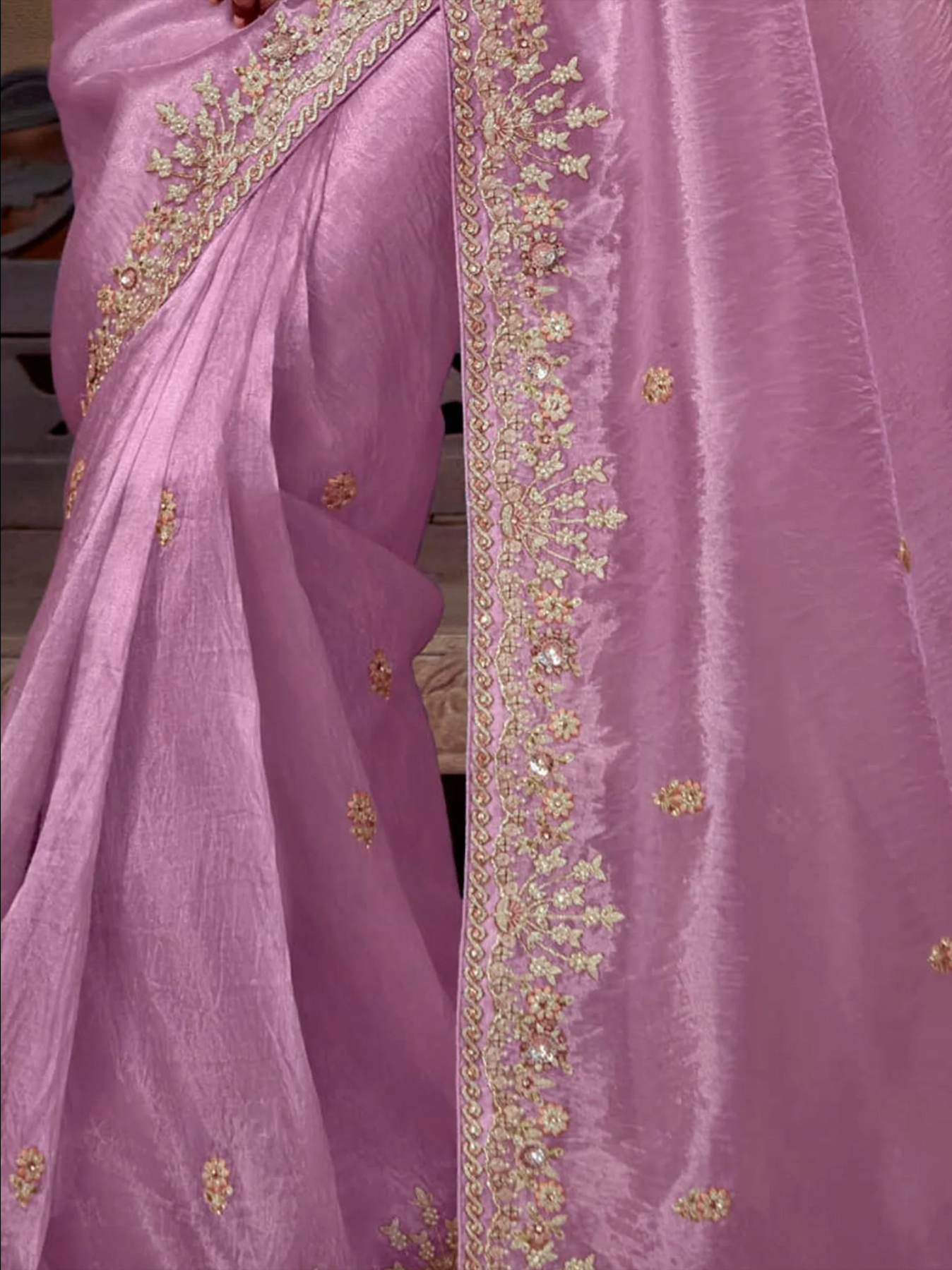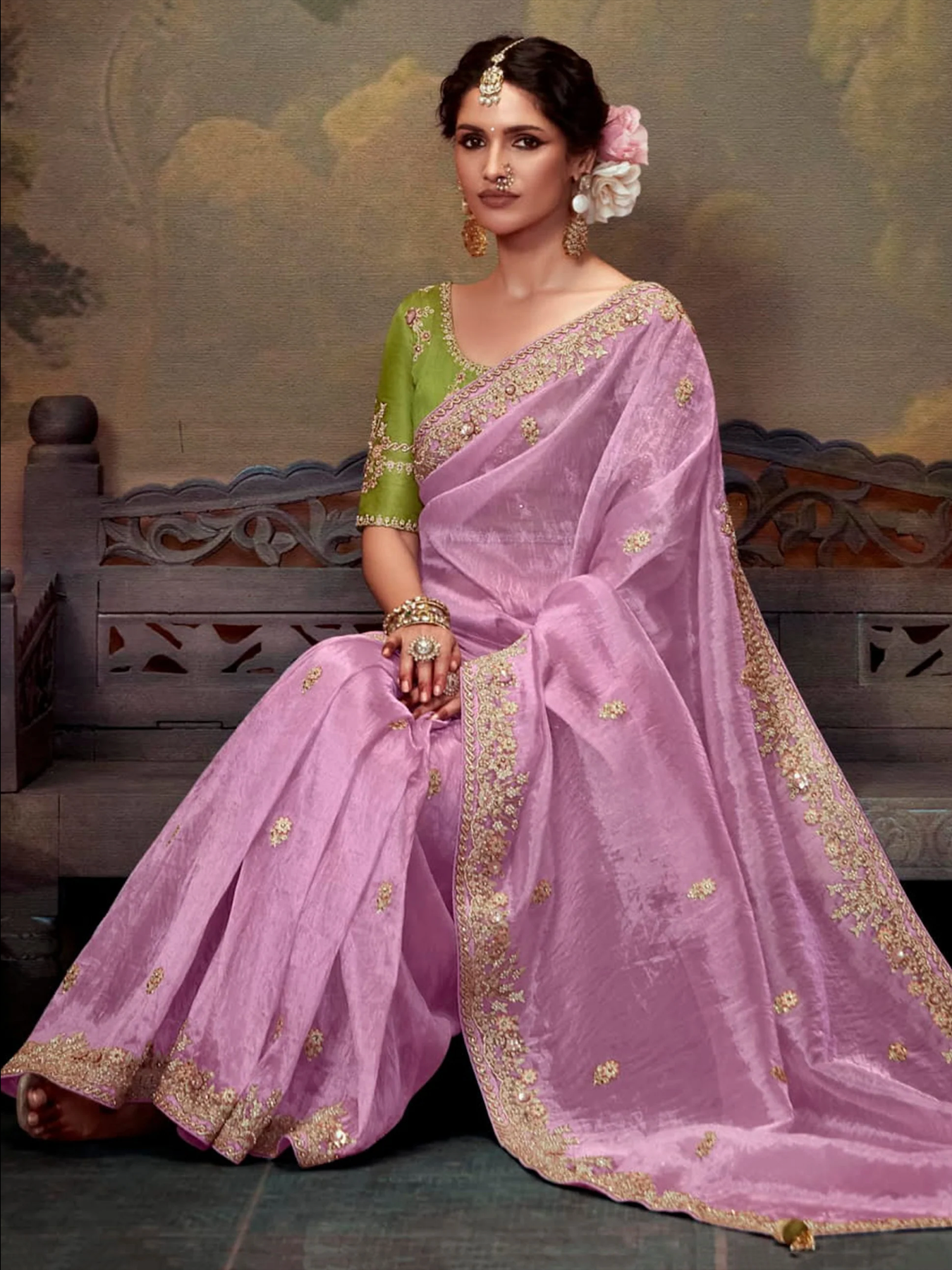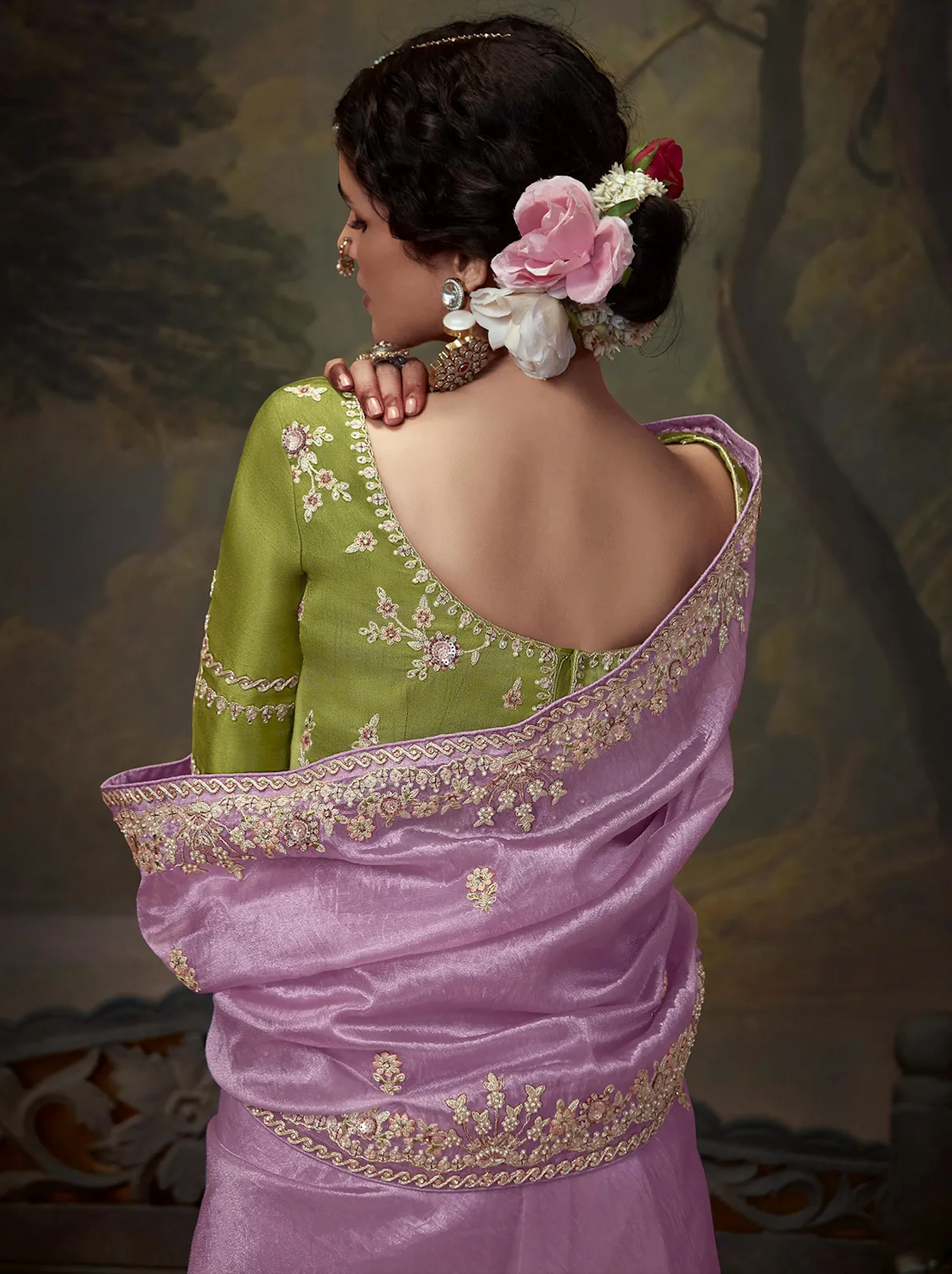 Glam up sweetly adorning this lavender color embroidered tissue organza saree. Crafted for festive occasions using detail-oriented thread, zari and stone, cut beads embellishments all over. It is paired with a matching green color art silk blouse with heavy embroidery. Do Note: The unstitched blouse can be customised up to 42 inches. All accessories shown are for styling purpose only. Slight color variation may occur due to photographic reasons.