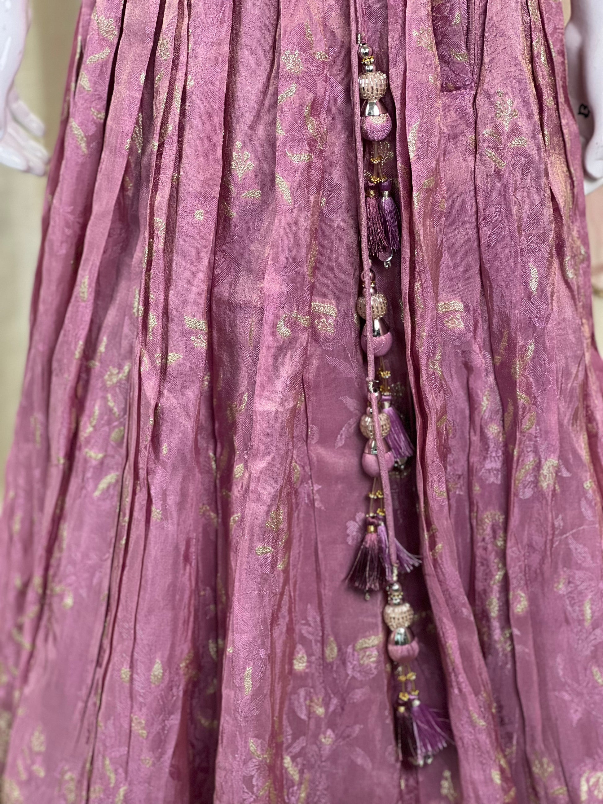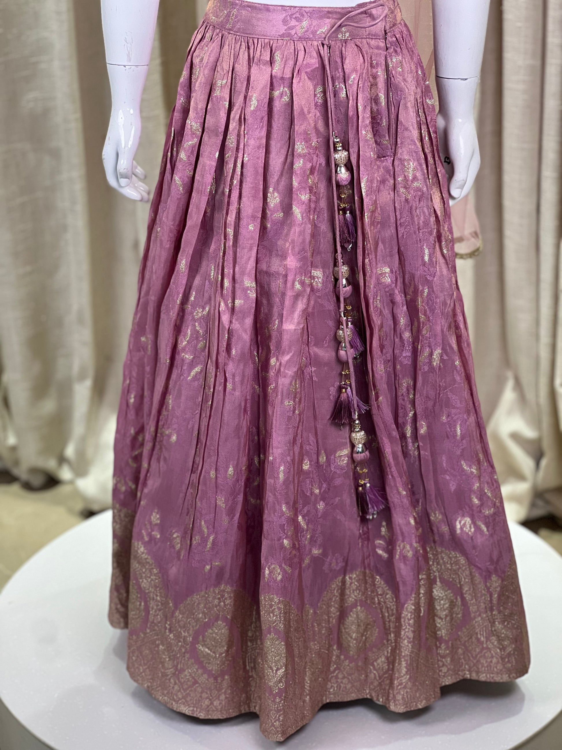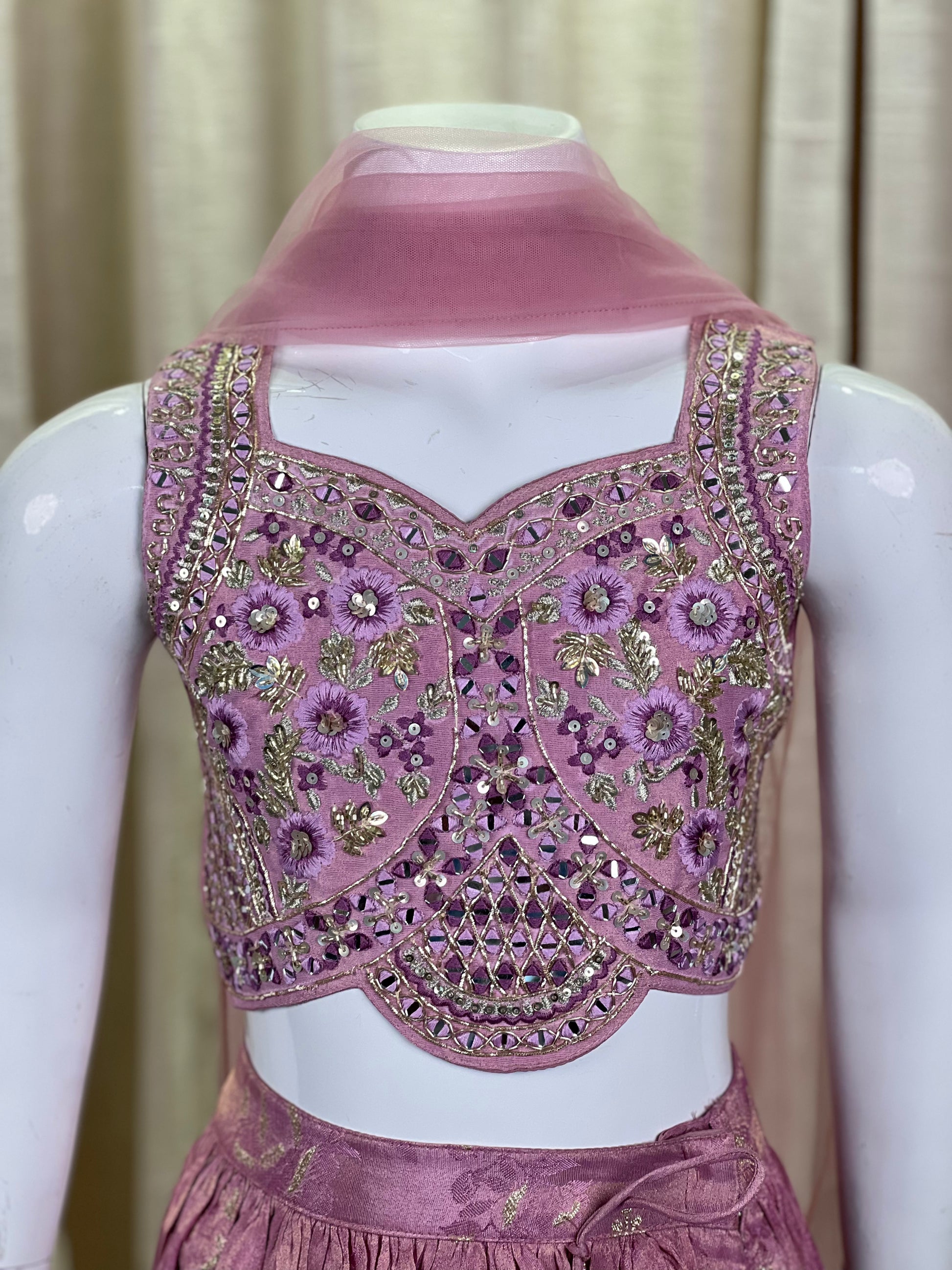A dreamy ensemble in lavender purple, this lehenga set is designed for young girls who adore sparkle and elegance. The sleeveless blouse features structured bead and sequin embroidery with a trendy cut-out hemline, while the flared skirt showcases golden motifs and a broad zari border. Lightweight and graceful, it’s the perfect pick for weddings, birthday celebrations, or festive occasions. Stylish, regal, and full of charm—just like her.