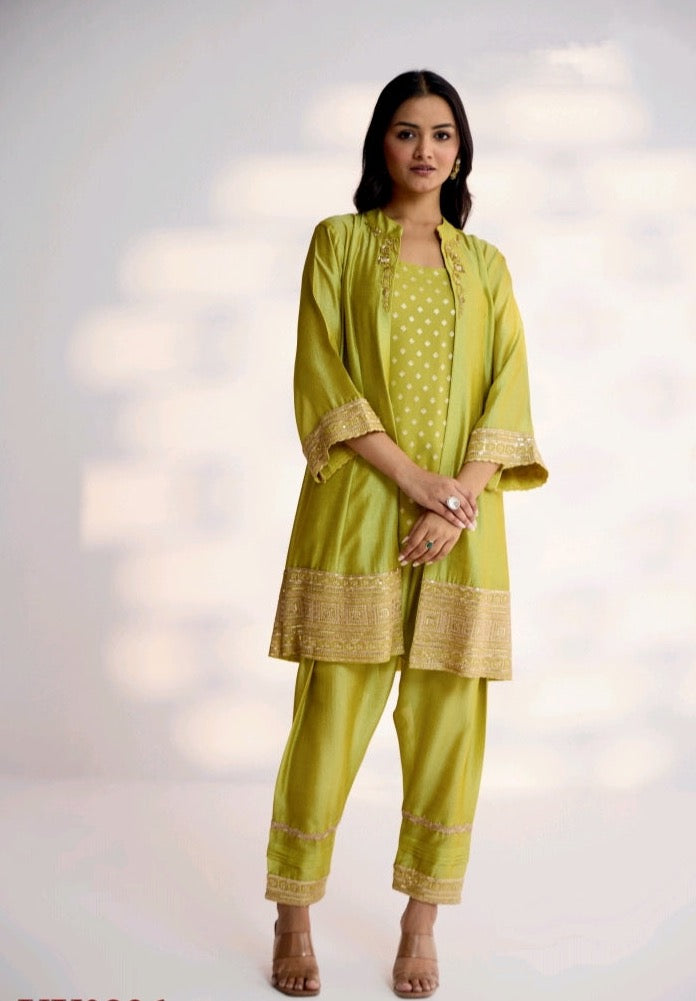 A light green shrug pant set for women radiates freshness and style. Enhanced with a designer touch gold border, it exudes elegance and sophistication. This ensemble offers a perfect balance of comfort and glamour, making it ideal for various occasions, whether casual outings or special events, while adding a hint of luxurious detail with the gold border.