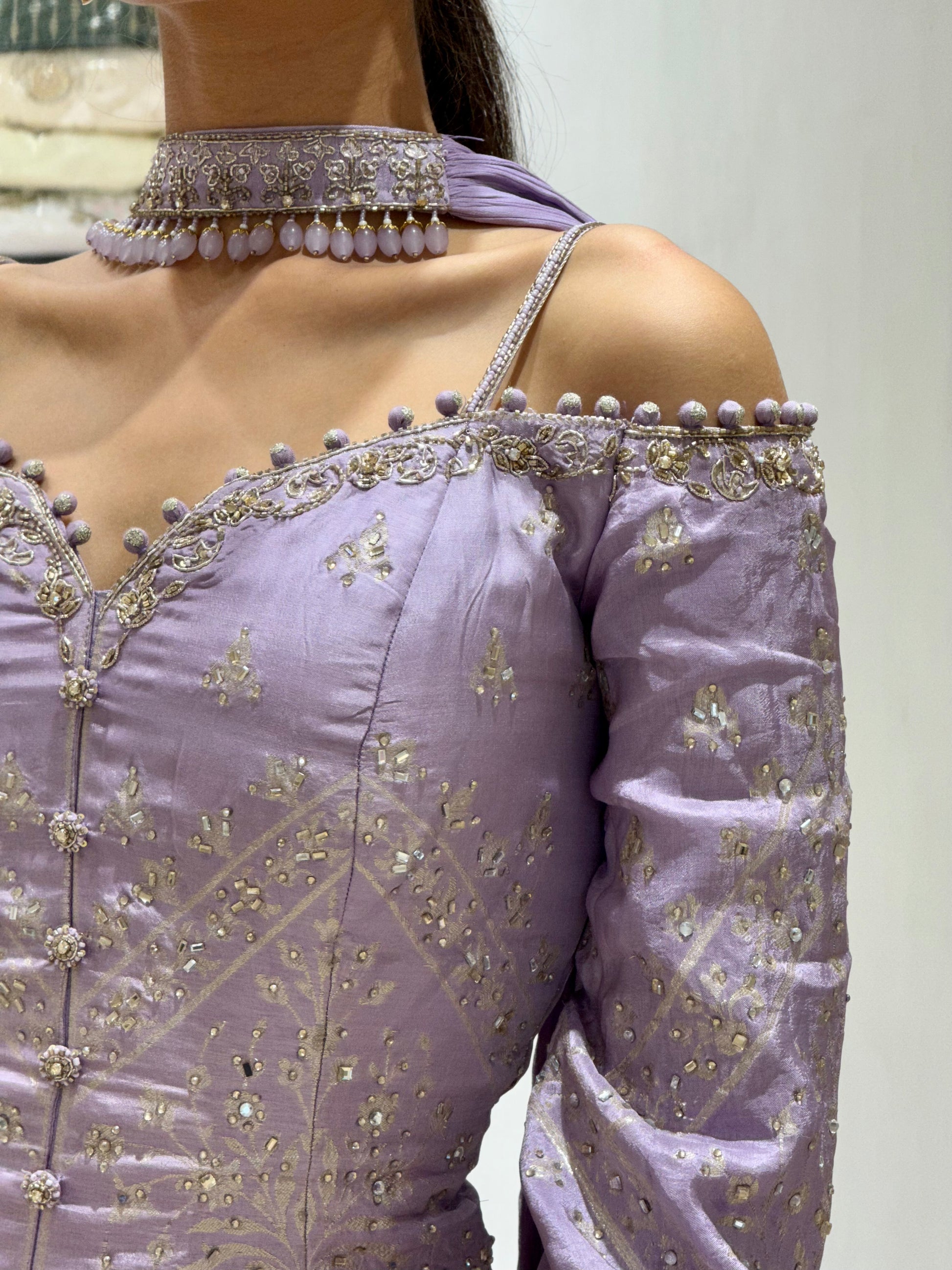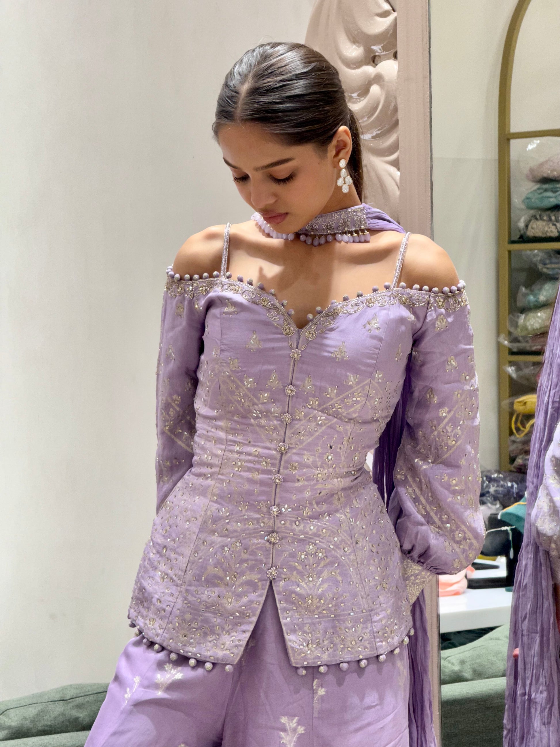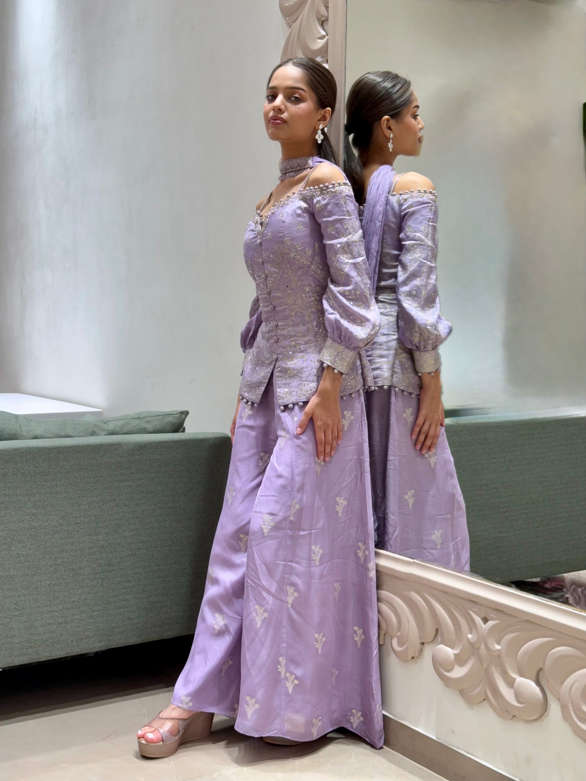Lilac Off-Shoulder Embroidered Sharara Set with Corset Blouse