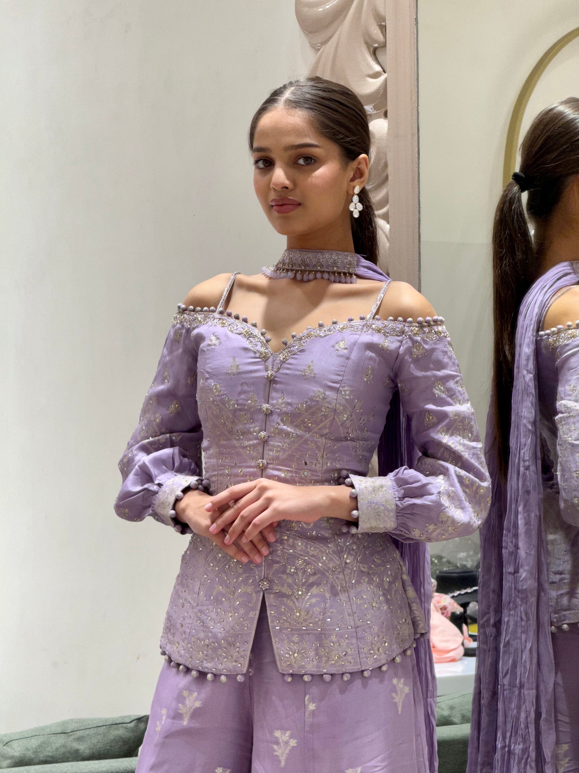 Step into modern elegance with this stunning lilac sharara set featuring a structured off-shoulder corset-style blouse. The top is intricately adorned with delicate thread embroidery and shimmering sequin work, enhancing its feminine silhouette. Balloon-style ruched sleeves and dainty shoulder straps add a fashion-forward twist, while the fitted bodice creates a flattering, cinched-in waistline.