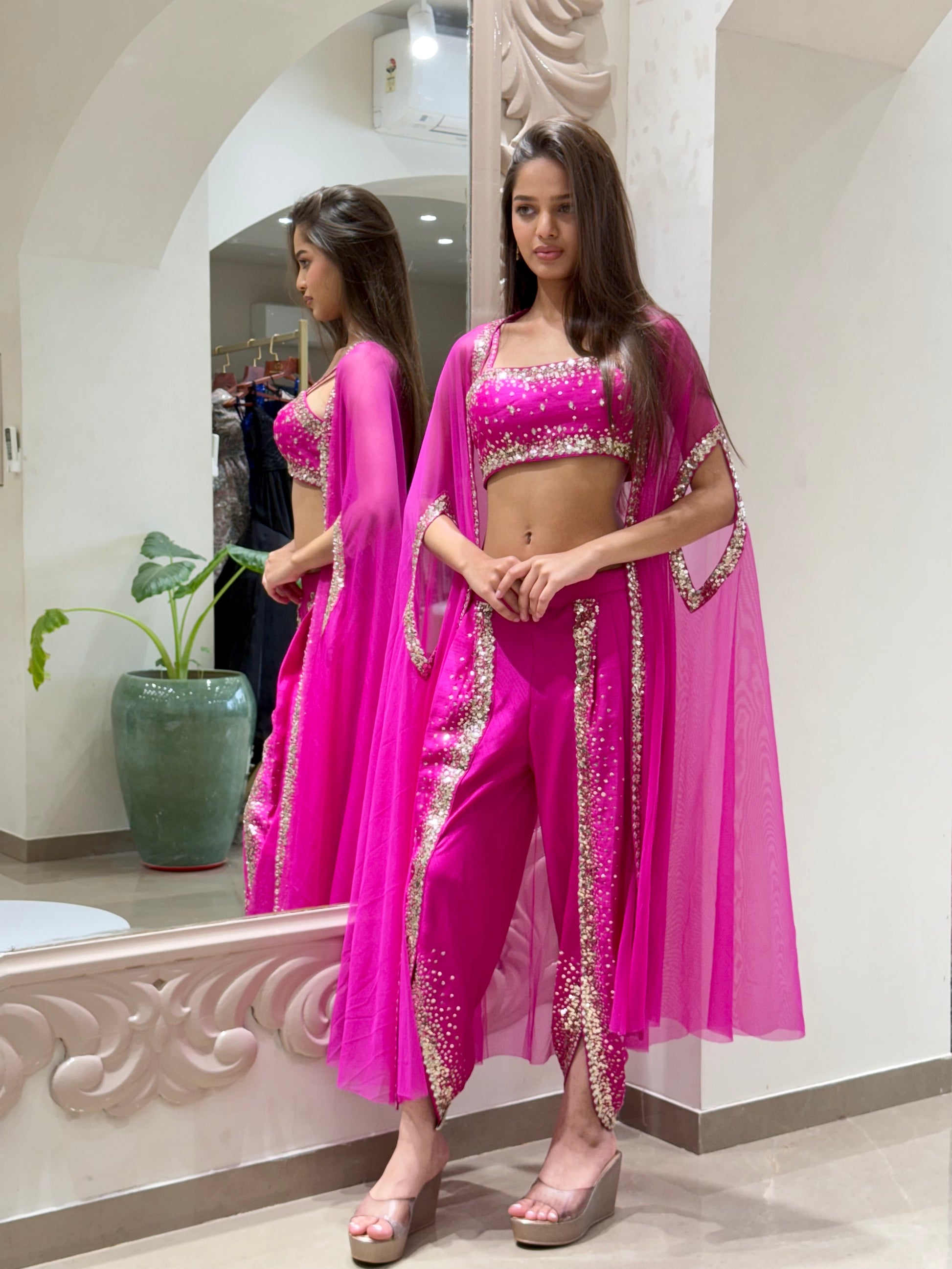 The look is elevated with a sheer georgette cape overlay, trimmed with embellished borders, adding a layer of drama and elegance. Paired with asymmetrical draped dhoti pants in a matching magenta hue, this set fuses ethnic flair with modern design, making it perfect for cocktail parties, sangeet events, or destination weddings.