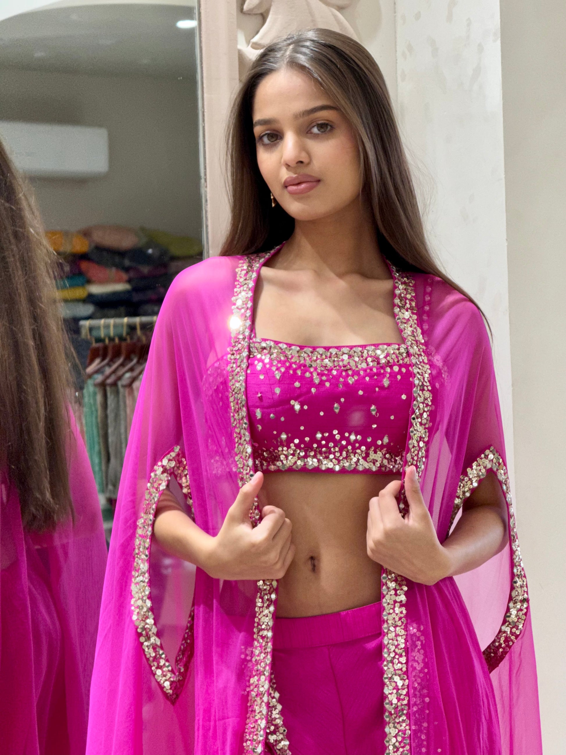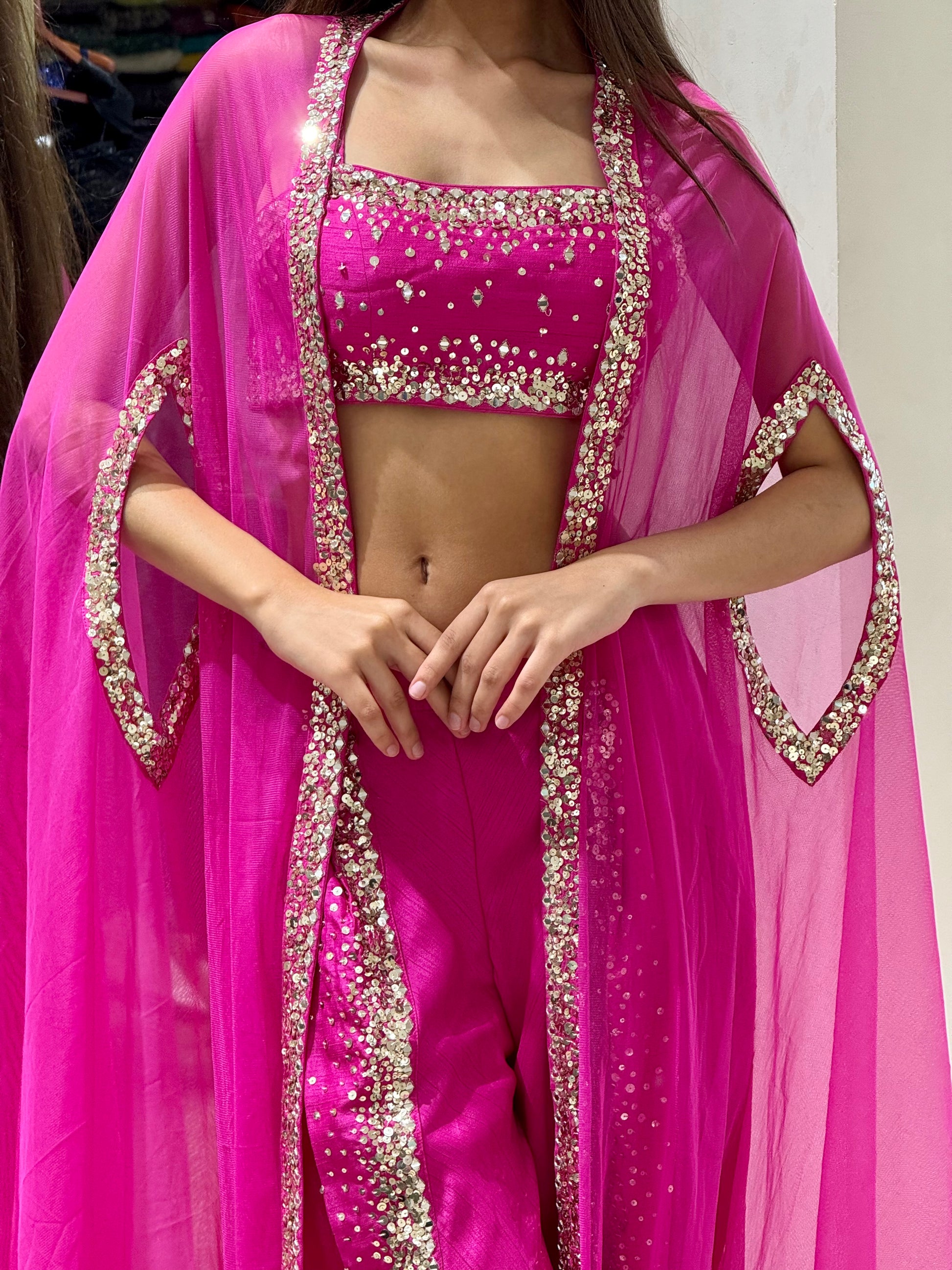 Make a bold style statement with this contemporary magenta cape set featuring dazzling mirror and sequin embellishments. The outfit includes a strappy, square-neck blouse richly decorated with mirror work and subtle gold detailing, perfectly balancing tradition with trend.