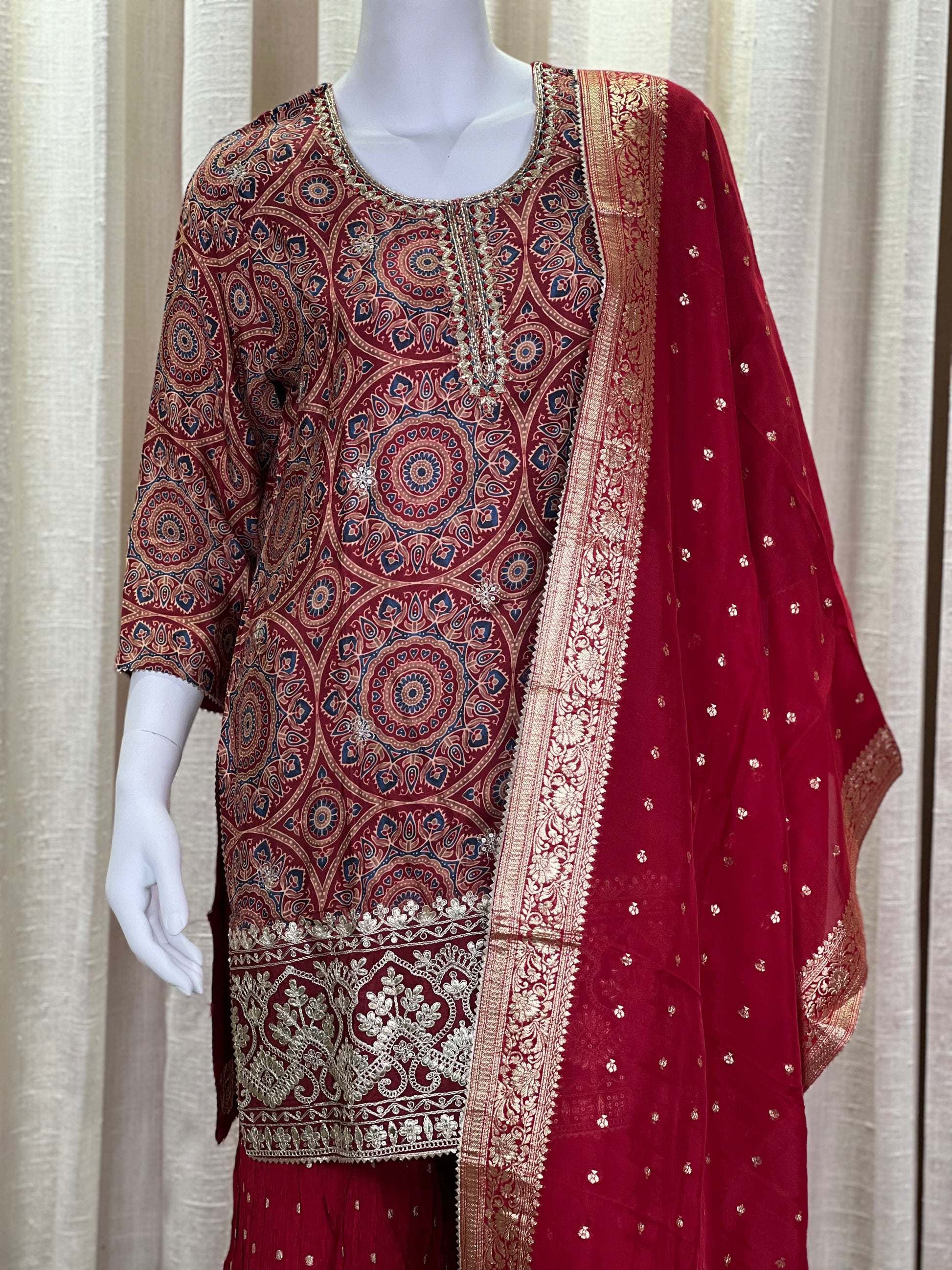 Make a statement with this stunning traditional ensemble featuring a beautifully crafted maroon Bandhani sharara set. The knee-length kurti is adorned with intricate mirror work and traditional zari embroidery, showcasing rich geometric and mandala-inspired patterns in earthy tones of maroon, beige, and rust. The set is paired with a matching maroon sharara pant enhanced with delicate mirror embellishments, offering both flair and comfort.