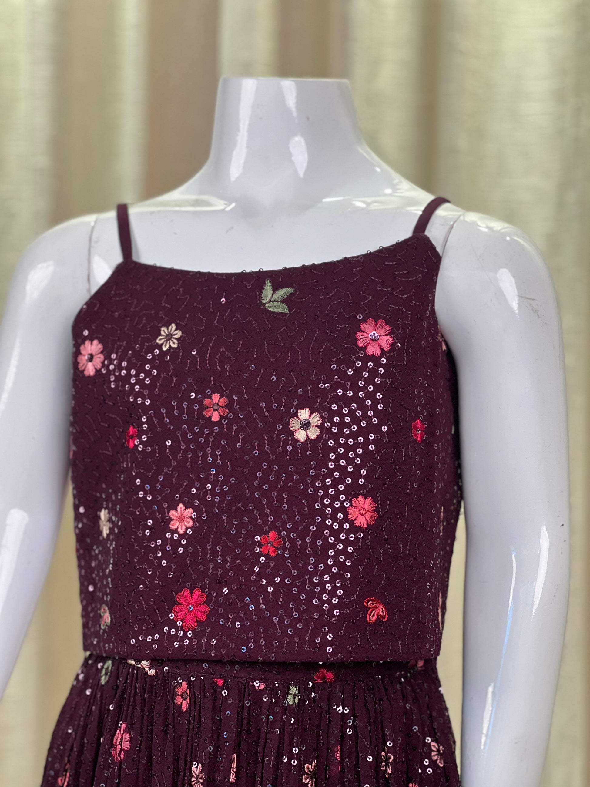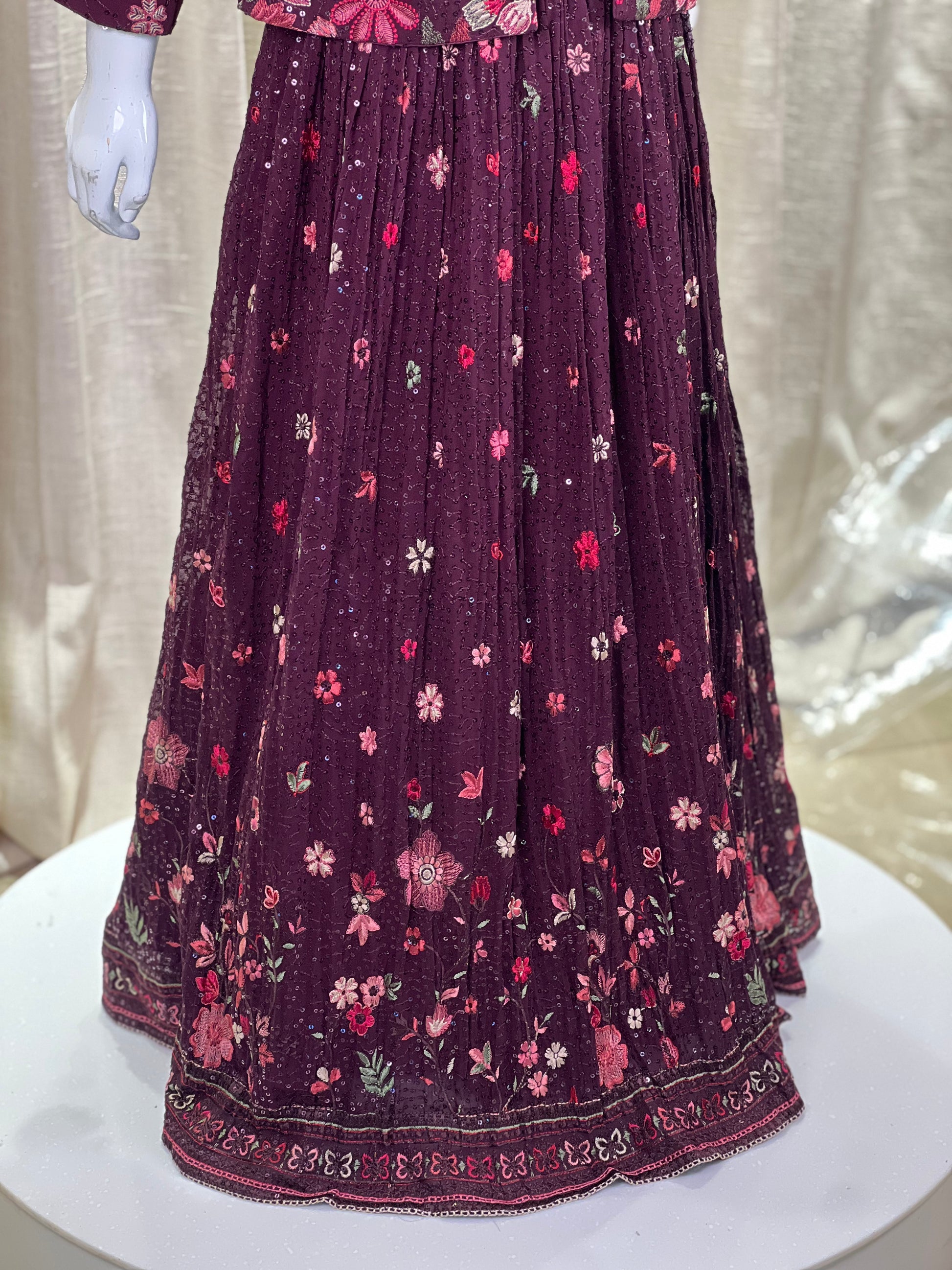 A graceful maroon Anarkali gown crafted from fine georgette, featuring all-over sequin and thread embroidery. The ensemble is complemented by a beautifully embroidered front-open jacket adorned with intricate floral patterns in shades of pink and green. The flowy silhouette and ornate hemline bring a touch of elegance, perfect for festive occasions, celebrations, and special events.
