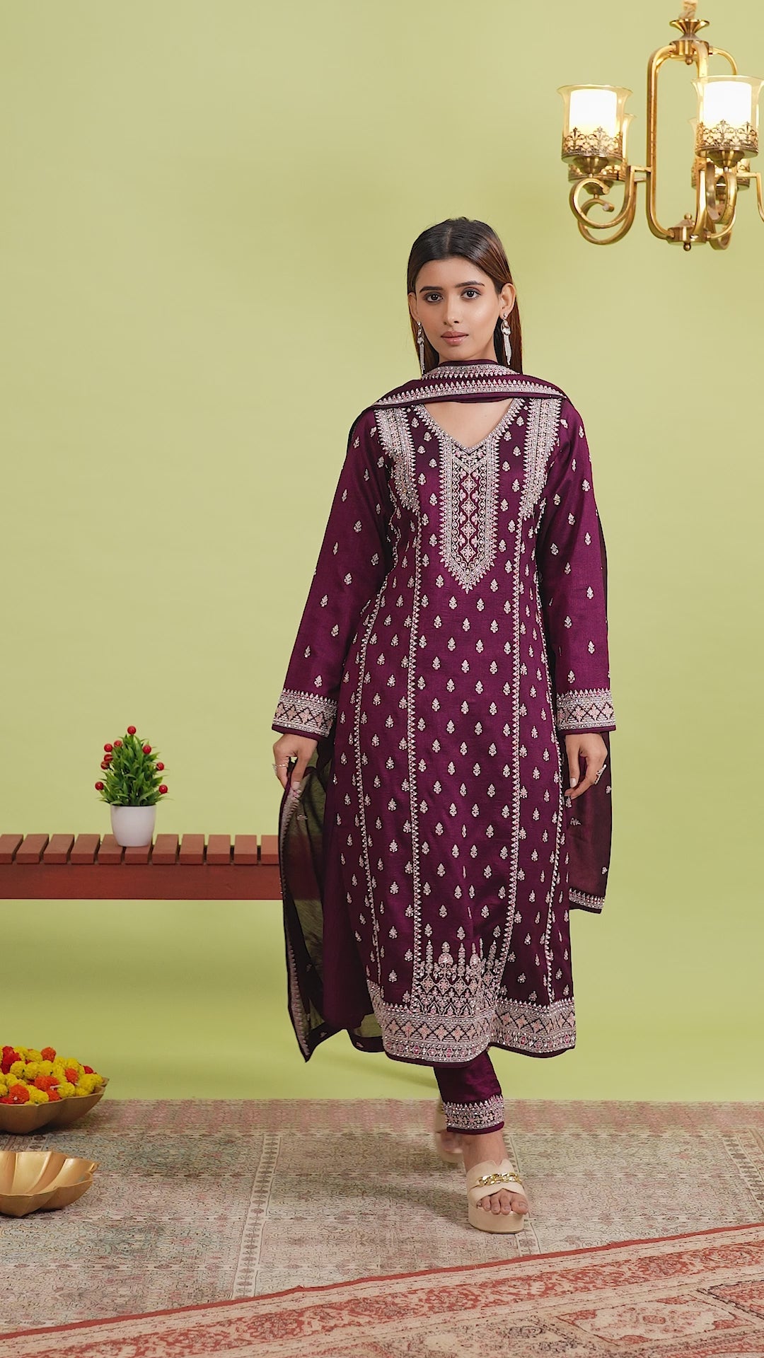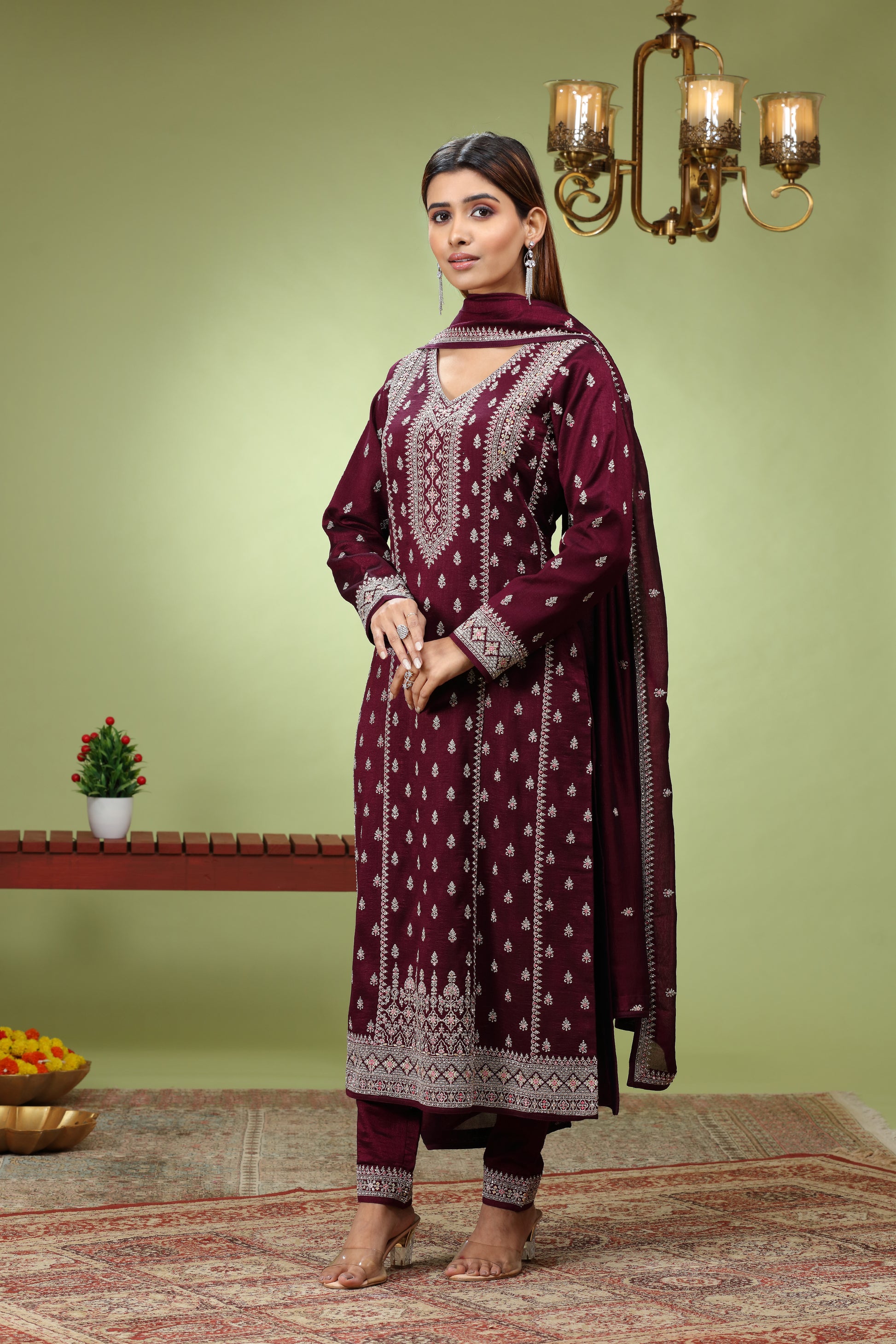 This Maroon Embroidered Straight Kurta Set is the perfect blend of comfort and style. The maroon color adds a touch of elegance while the embroidery adds a unique and classy touch. Stay on-trend with this stylish and comfortable kurta set. (Quirky and fun tone with word play on "blend" and "on-trend".)