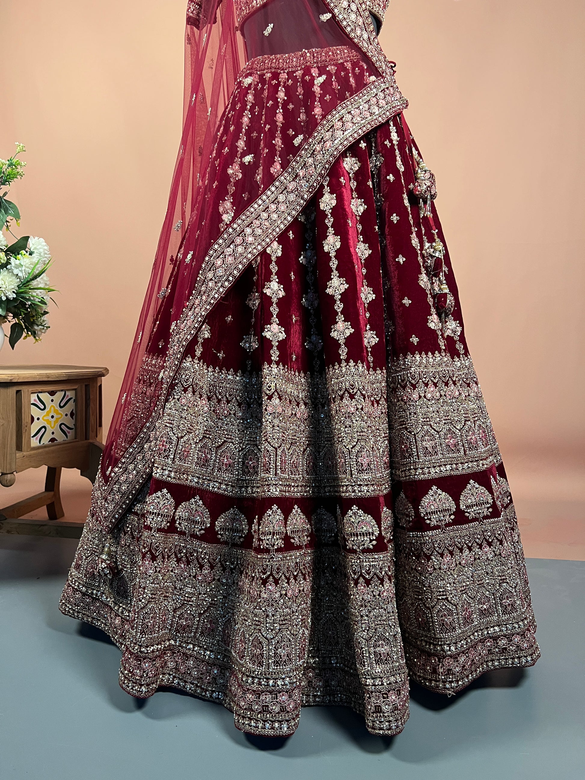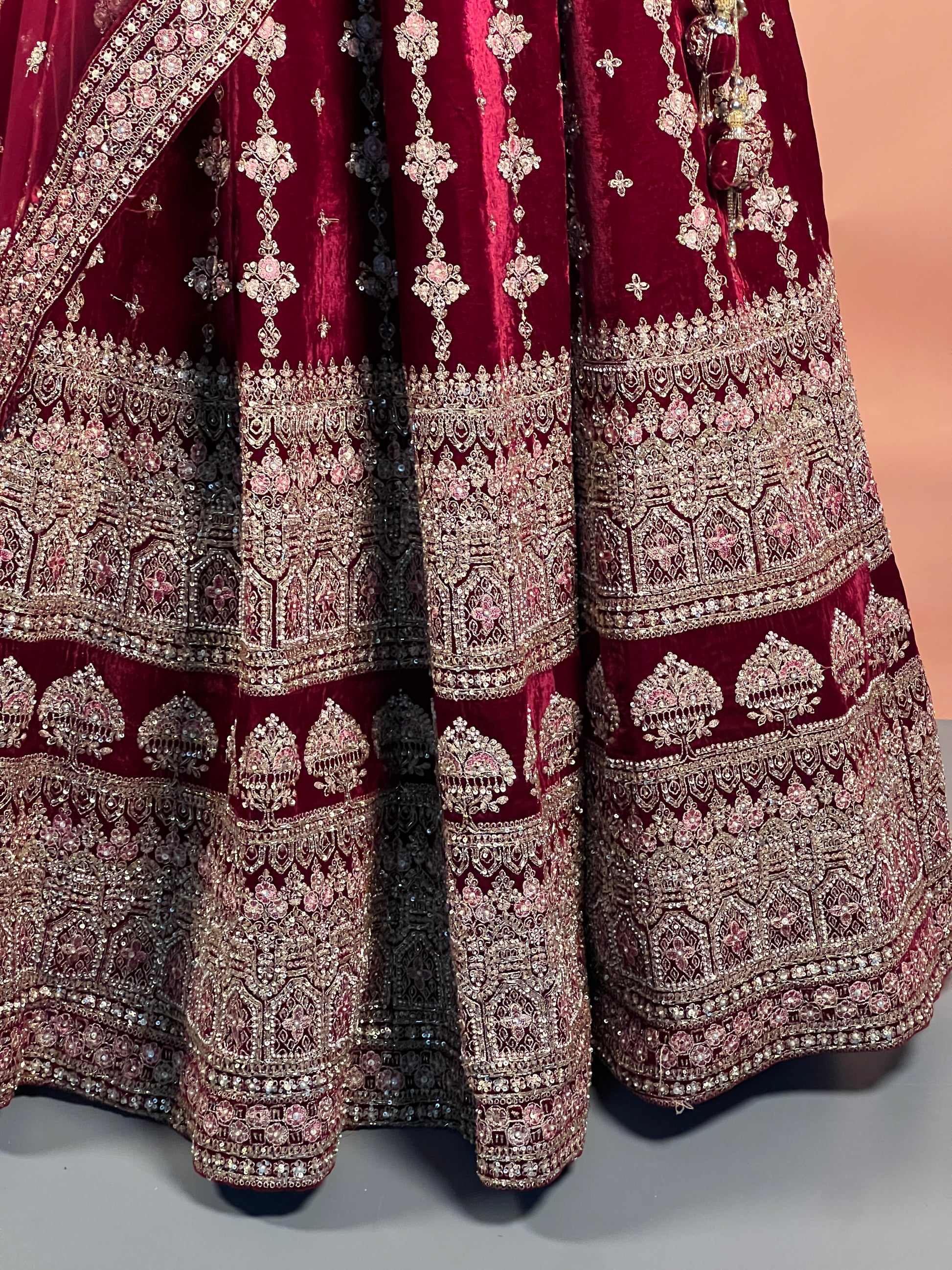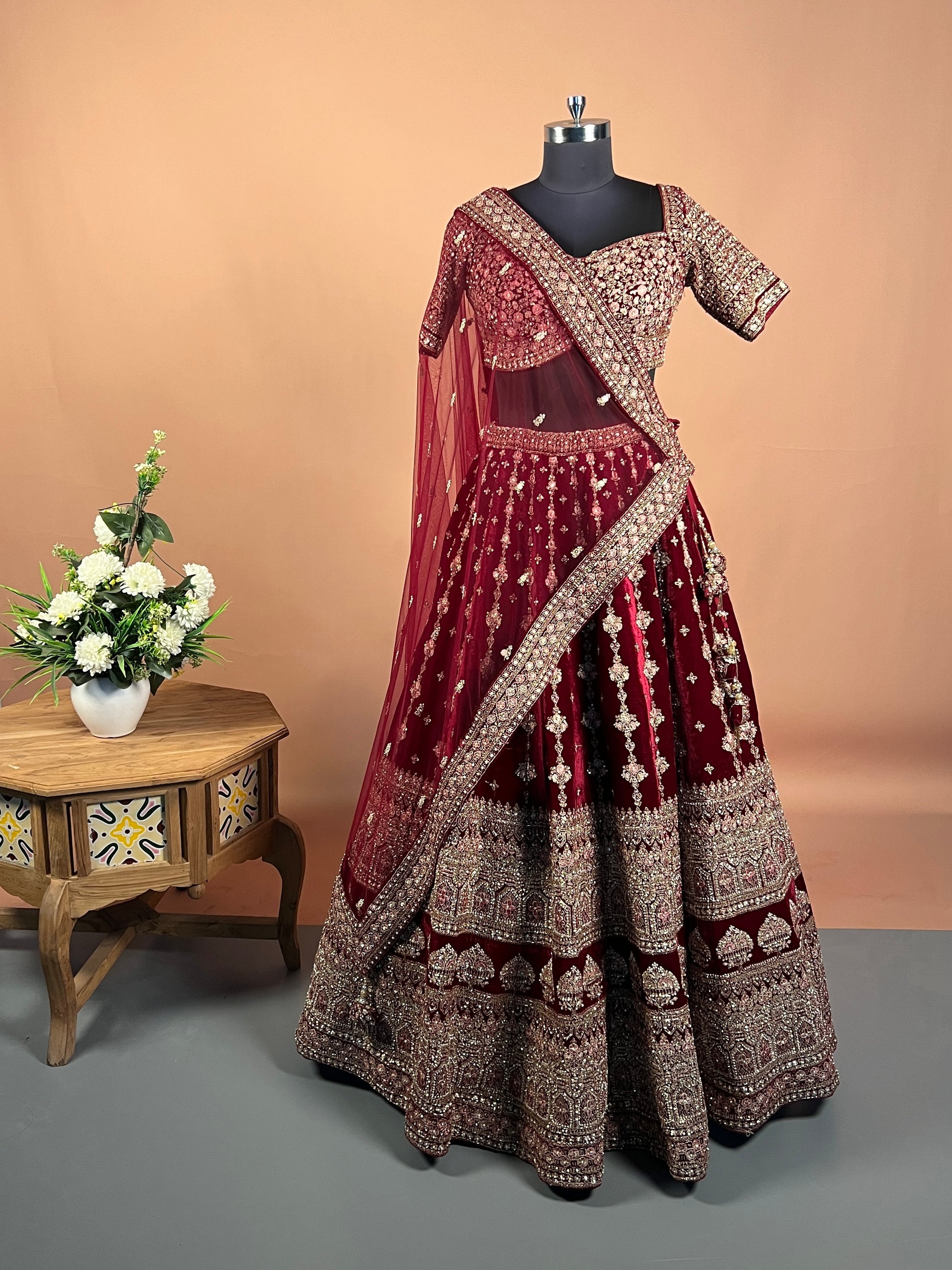 Maroon Velvet Zari & Sequin Heavy Bridal Lehenga Set