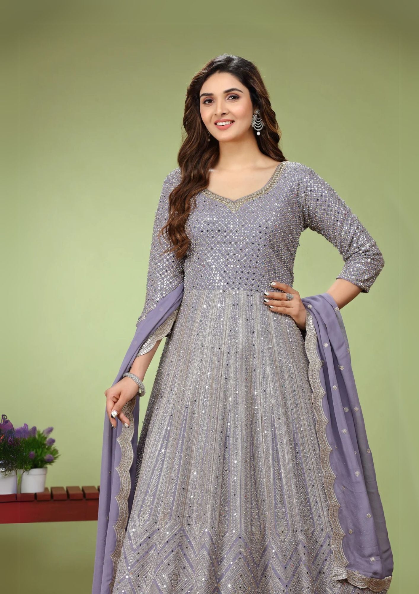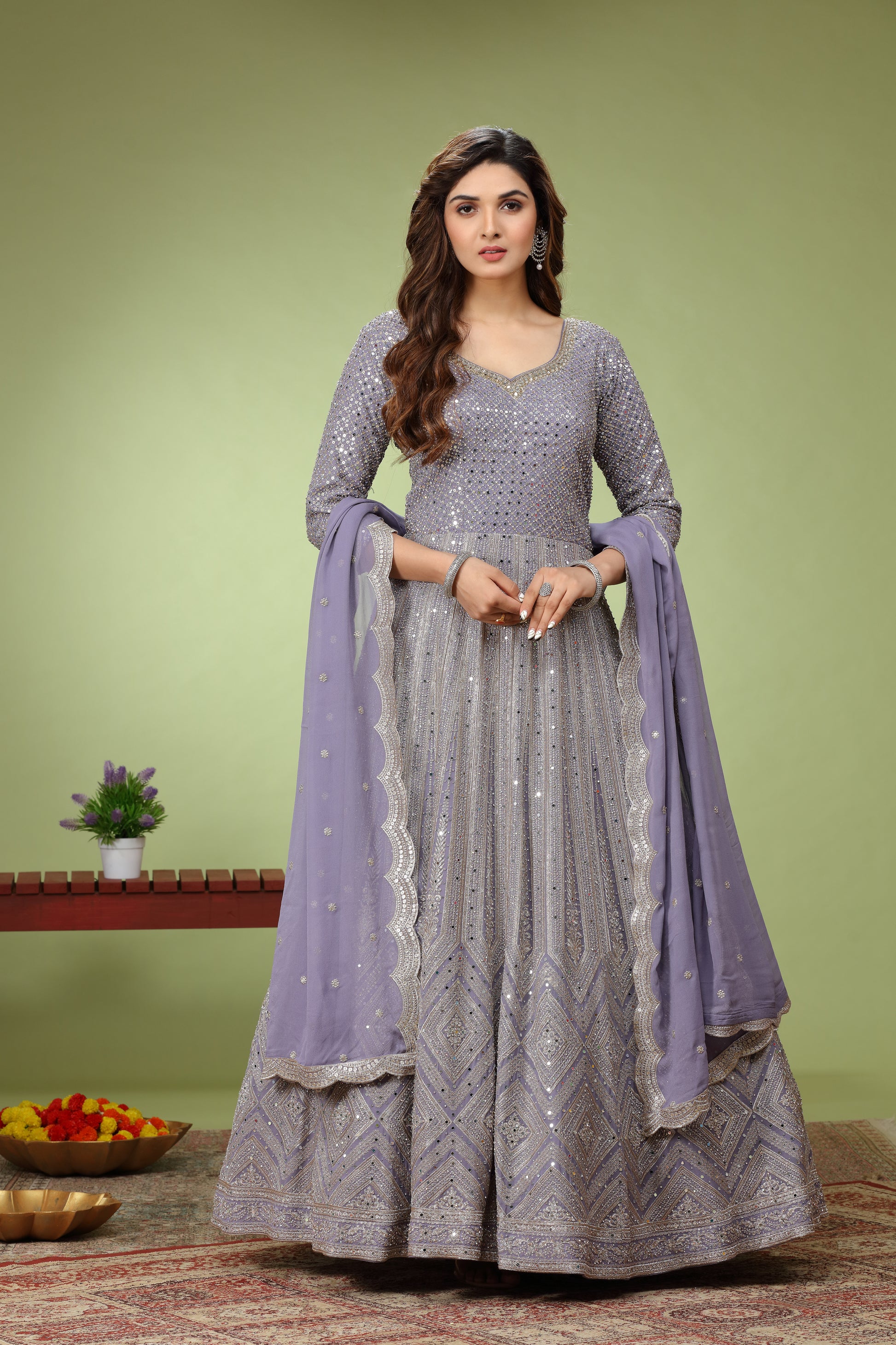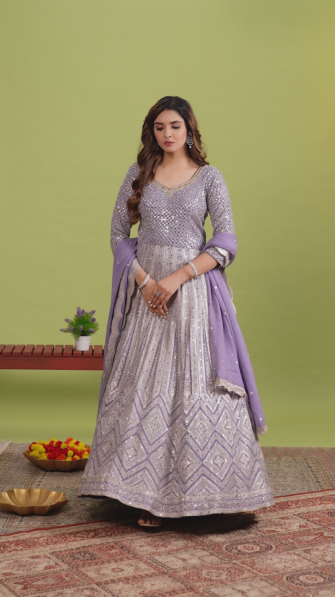 Spruce up your wardrobe with our Mauve Purple Lucknowi Anarkali Suit! This unique piece features stunning Lucknowi embroidery, giving you a touch of traditional elegance. Perfect for any occasion, this suit will have you looking stylish and sophisticated with ease.