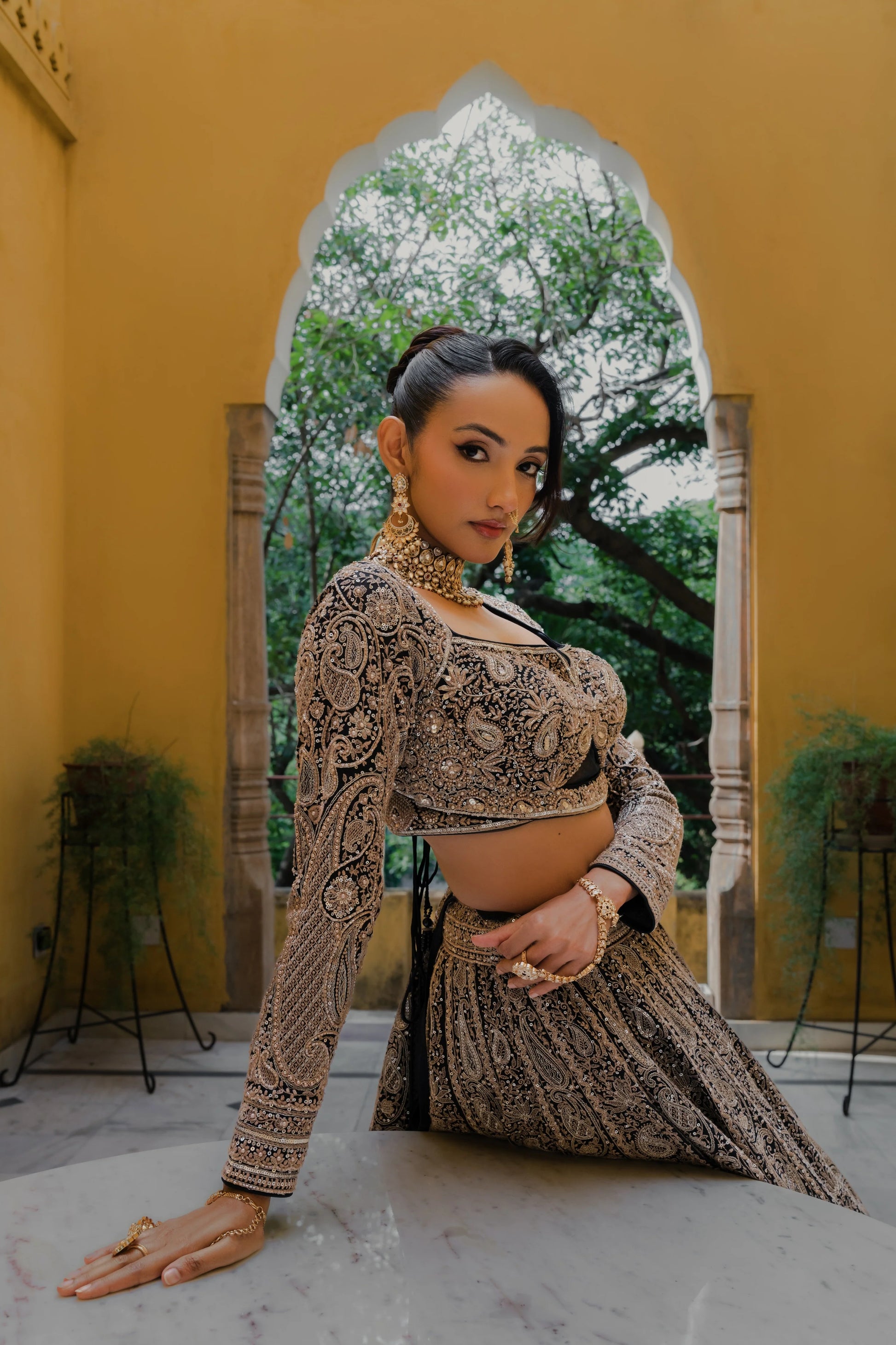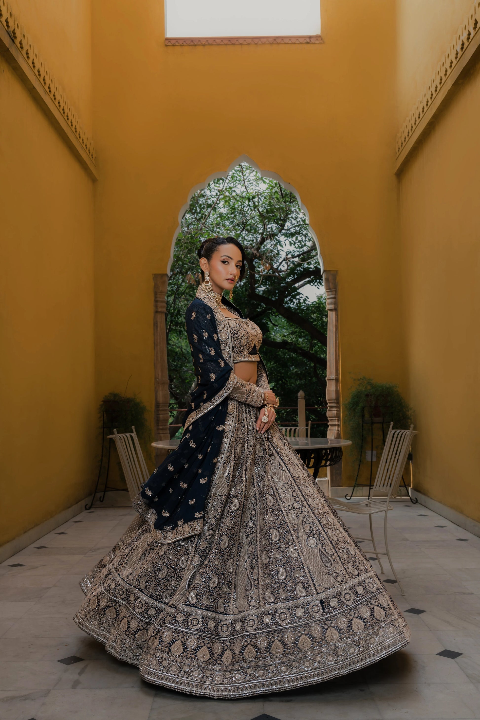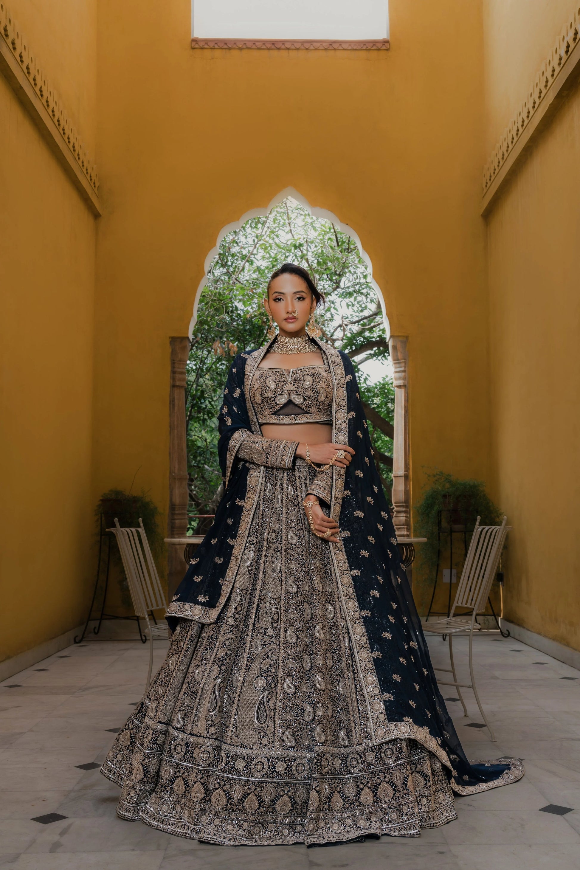 Indulge in the opulence of heritage craftsmanship with this midnight blue lehenga set, a striking ensemble that speaks volumes of regal grandeur. Rendered in plush Georgette, the flared skirt is densely adorned with golden zardosi work, intricate paisley patterns, and glimmering sequins, forming a tapestry of Mughal-inspired artistry.