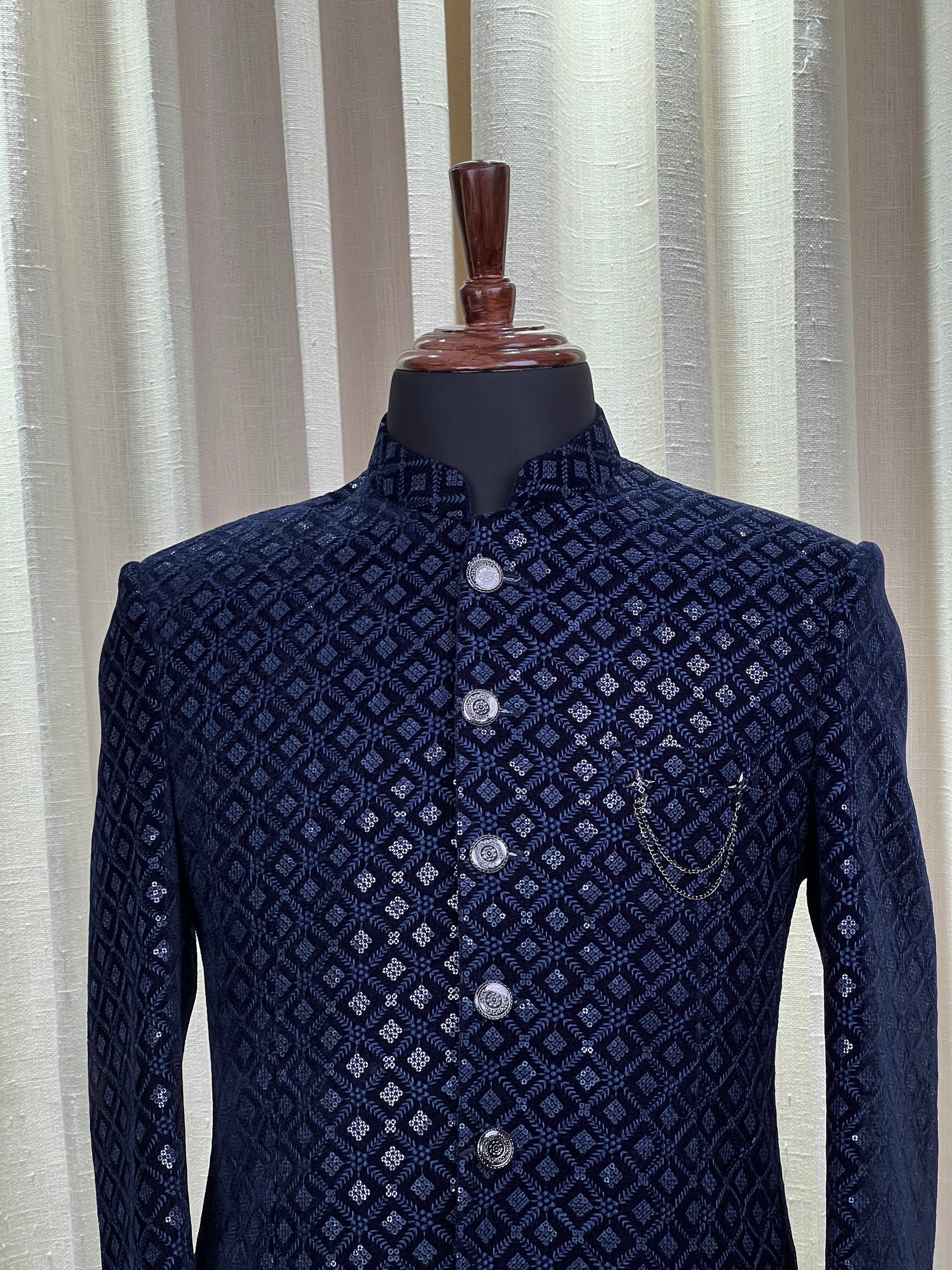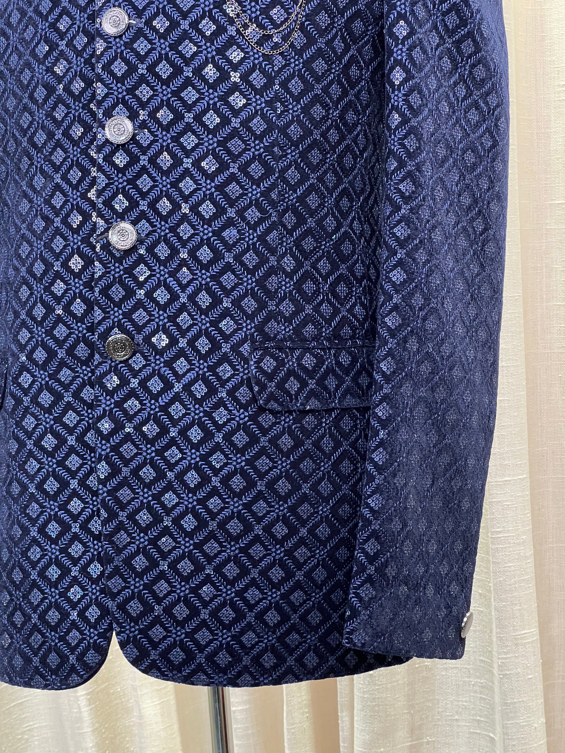 Command attention with this luxurious midnight blue Jodhpuri suit, tailored from plush velvet for a rich and regal appearance. The suit showcases a refined all-over geometric pattern in a shimmering silver tone, adding a layer of sophistication to the deep blue base. Silver-toned embossed buttons and a delicate chain brooch accentuate the classic bandhgala collar and structured silhouette, creating a look that’s both stately and stylish. Perfect for evening receptions, weddings, or high-end formal gatherings, this Jodhpuri exudes timeless elegance with a contemporary twist.