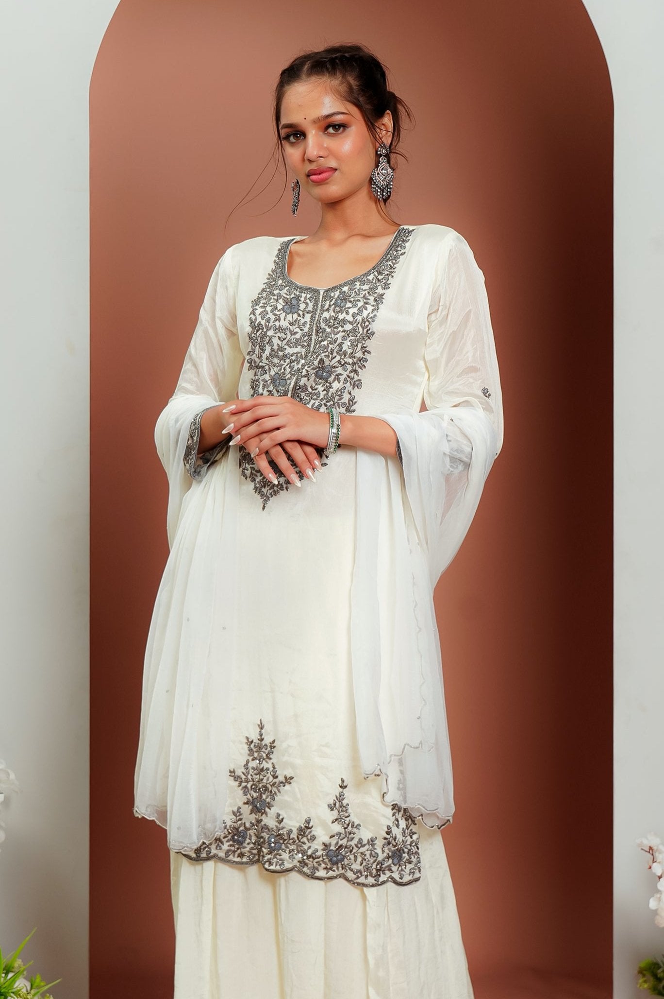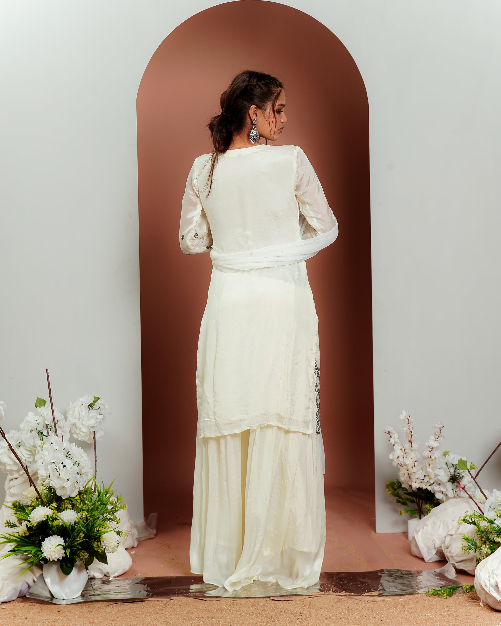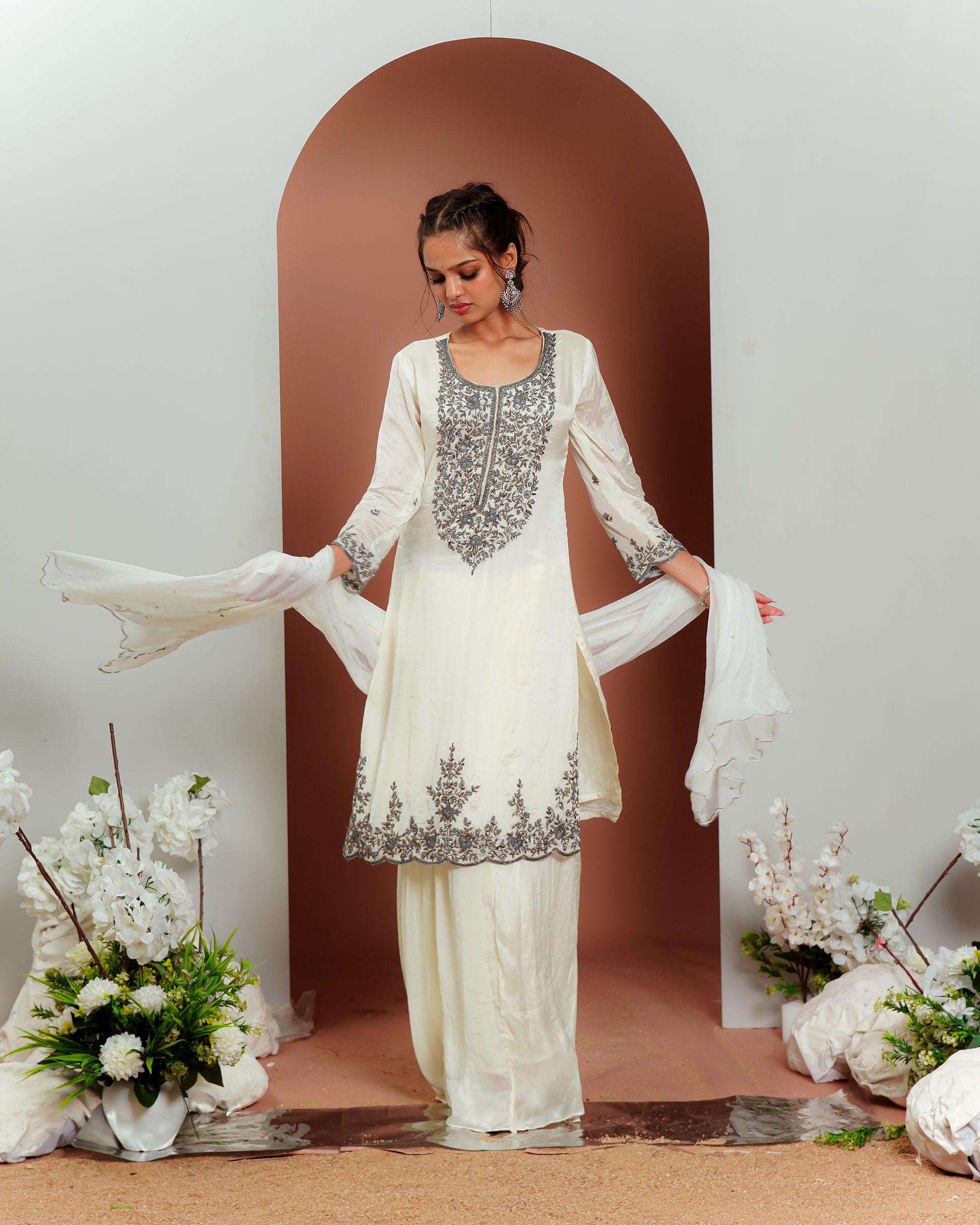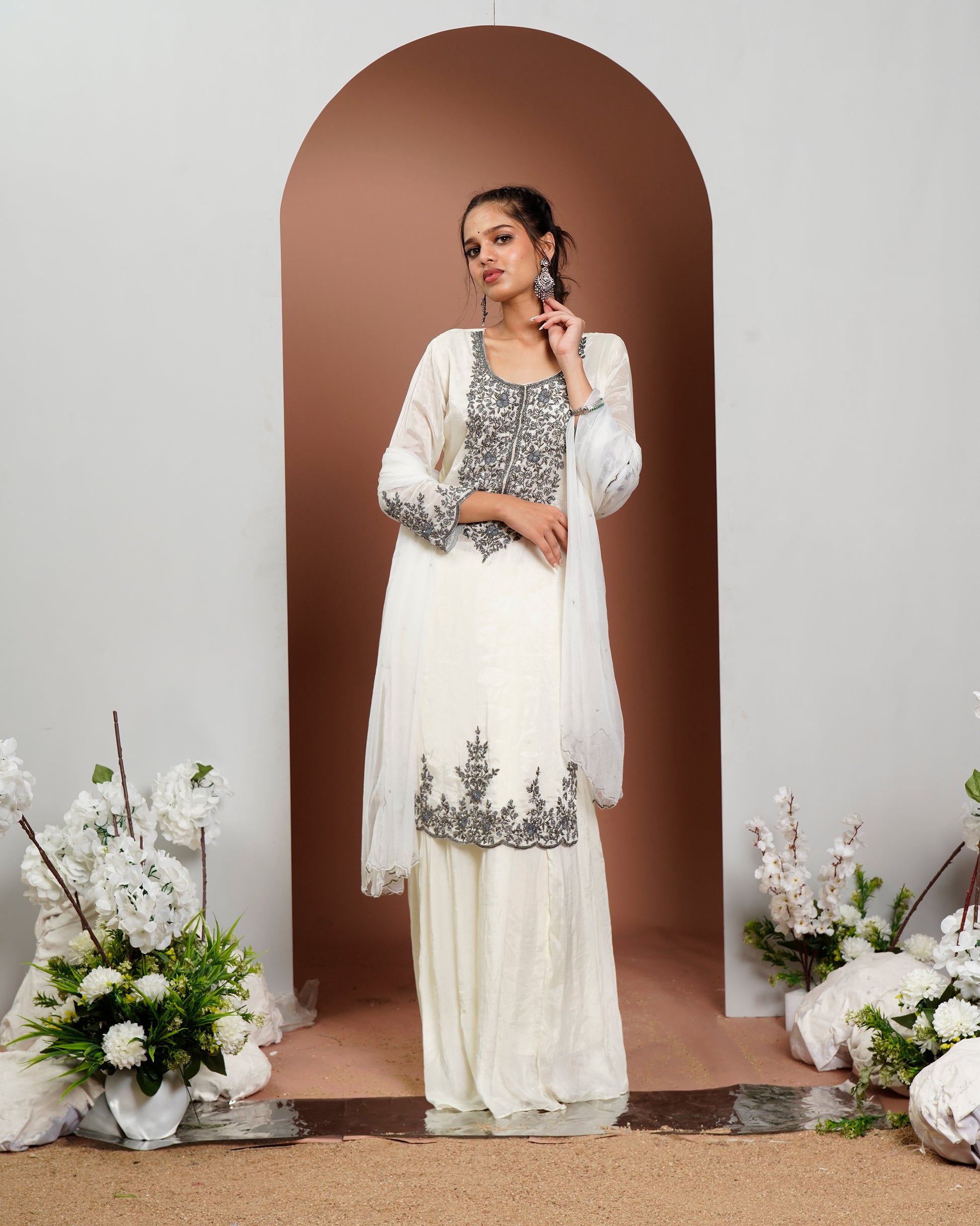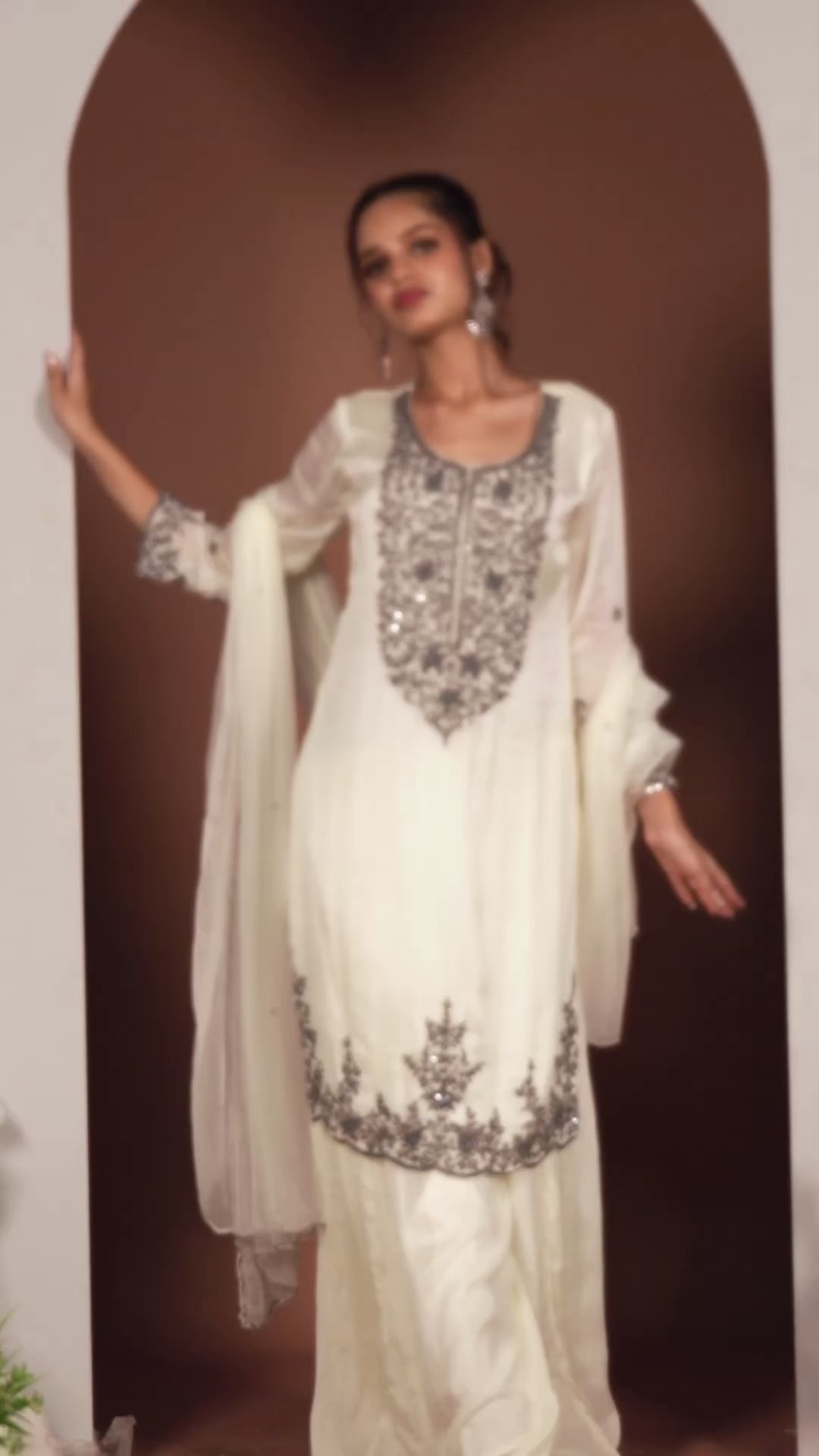 Introducing our Monochrome Magic: White Palazzo Set with Striking Black Work. This elegant ensemble features a relaxed-fit white palazzo that ensures comfort without compromising style. Adorned with exquisite black embroidery, this set adds a touch of sophistication to any occasion. Perfect for festive celebrations or casual outings, it can be effortlessly styled with statement jewelry and heels for a chic look or paired with flats for a laid-back vibe. Elevate your wardrobe with this versatile piece that beautifully balances monochrome colors, making it a must-have for fashion-forward individuals who appreciate timeless elegance. Make a statement wherever you go!