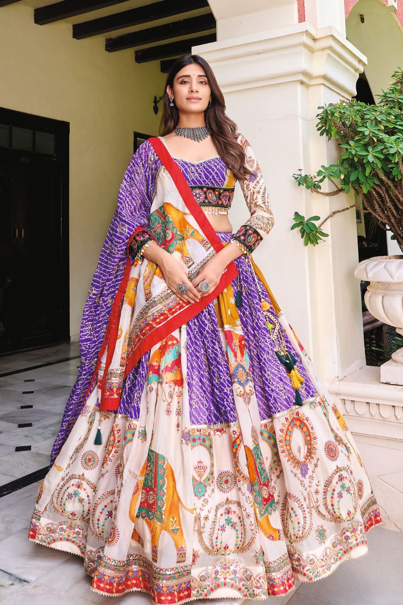 Step into the spotlight with this vibrant multicolor silk chaniya choli, adorned with dazzling mirror, gota patti, sequins, and beadwork. The full-flared lehenga pairs perfectly with a white choli featuring a sweetheart neckline and long sleeves, both showcasing intricate embroidery. Complete your look with the matching dupatta, decorated in the same festive style. Perfect for celebrations, this set brings a playful burst of color and sparkle to any occasion. Slight variations in color and design make each piece uniquely yours.