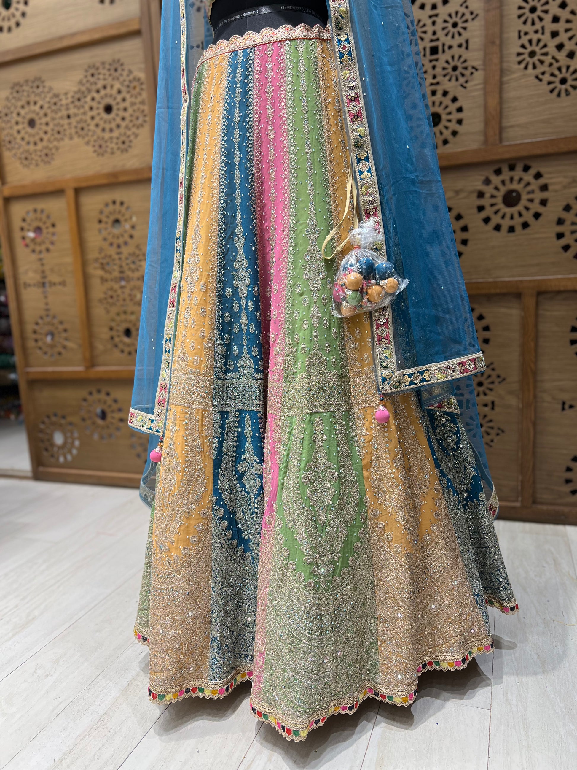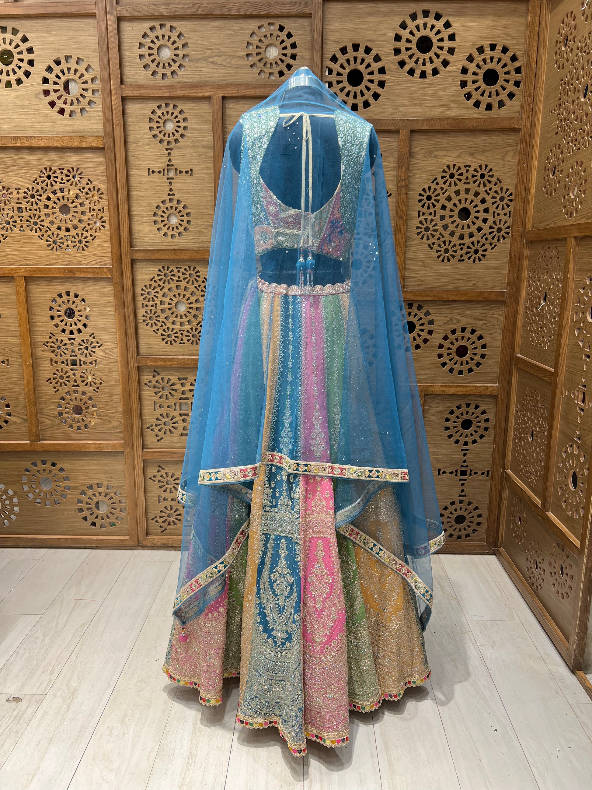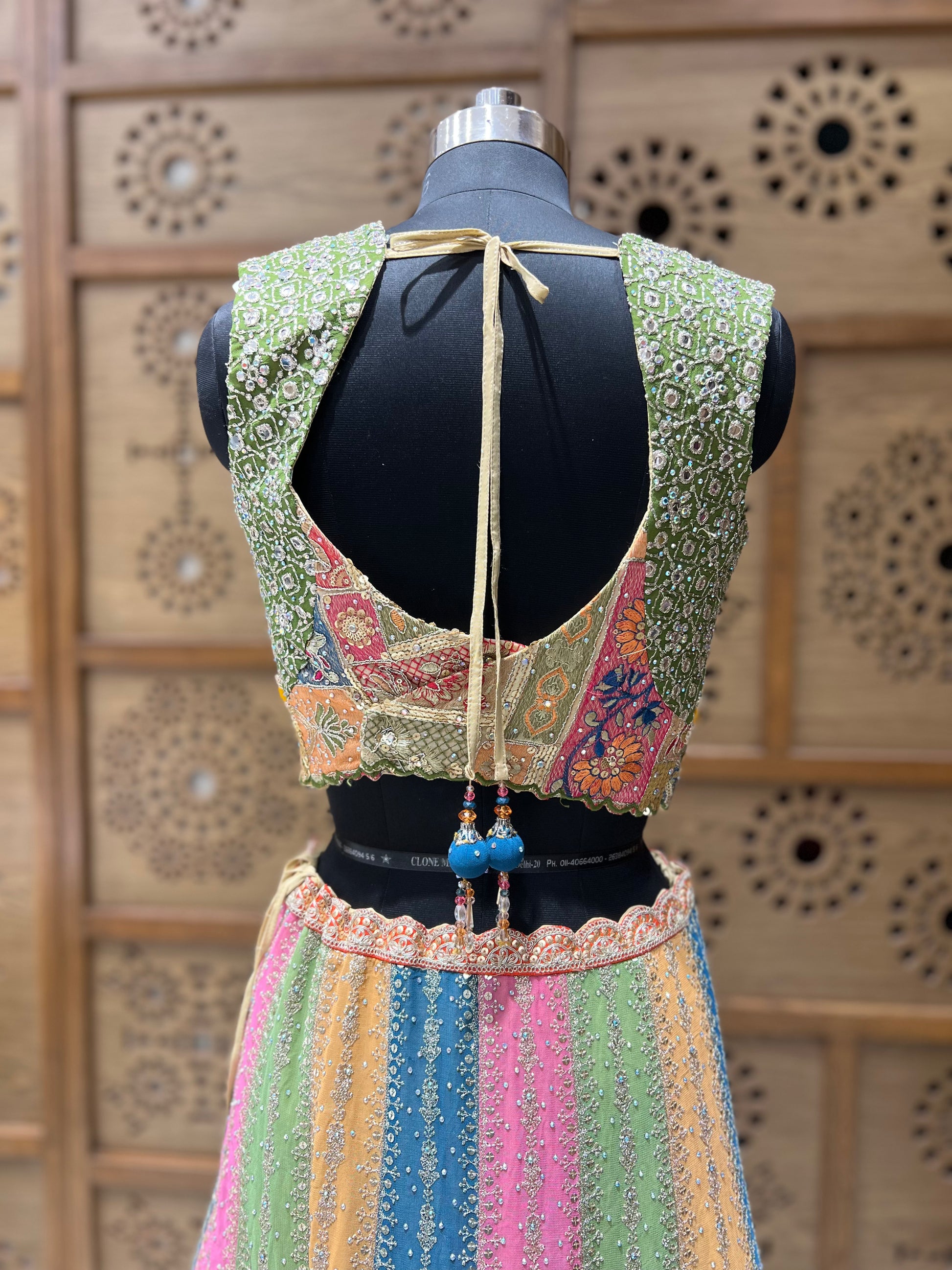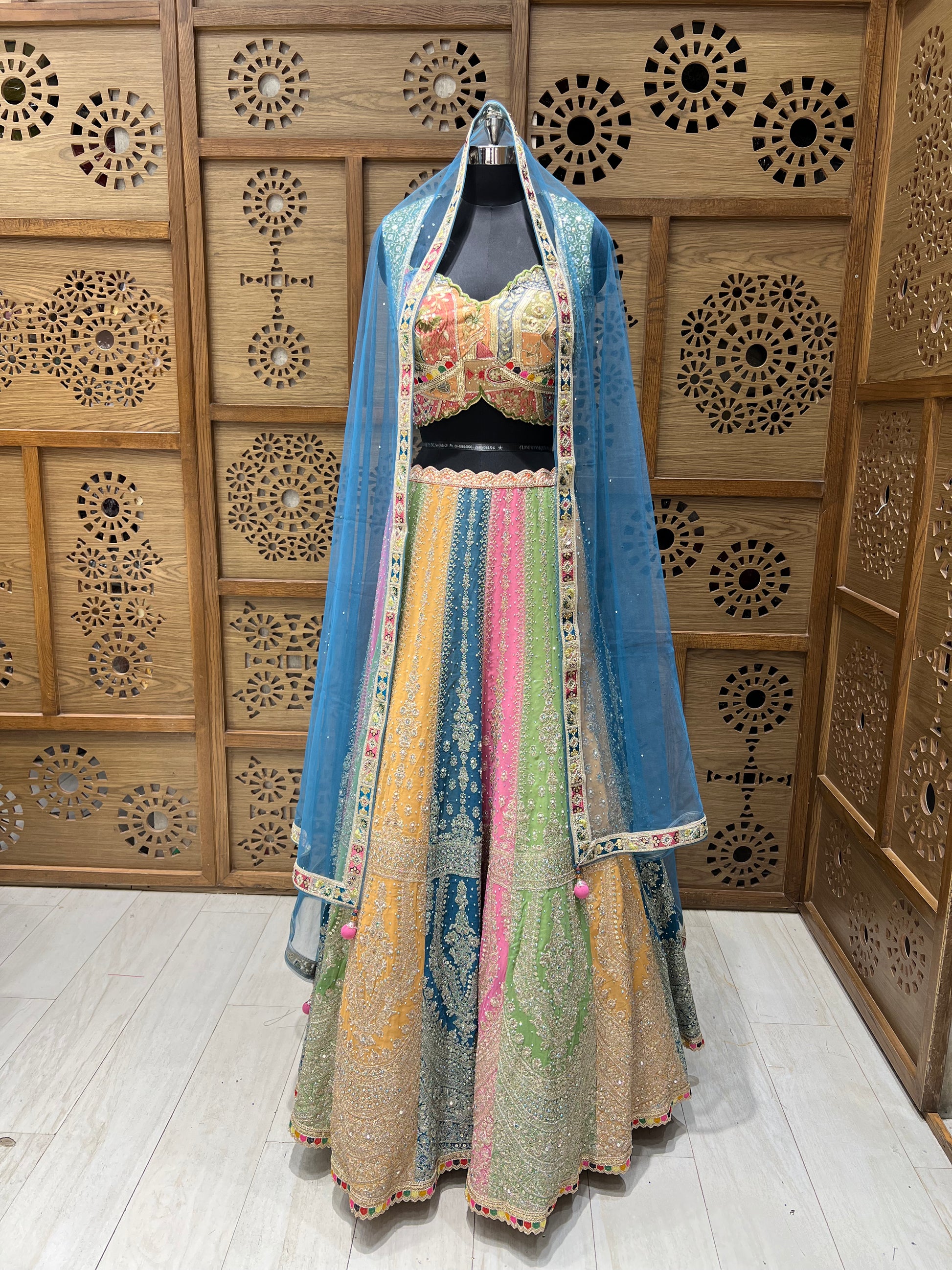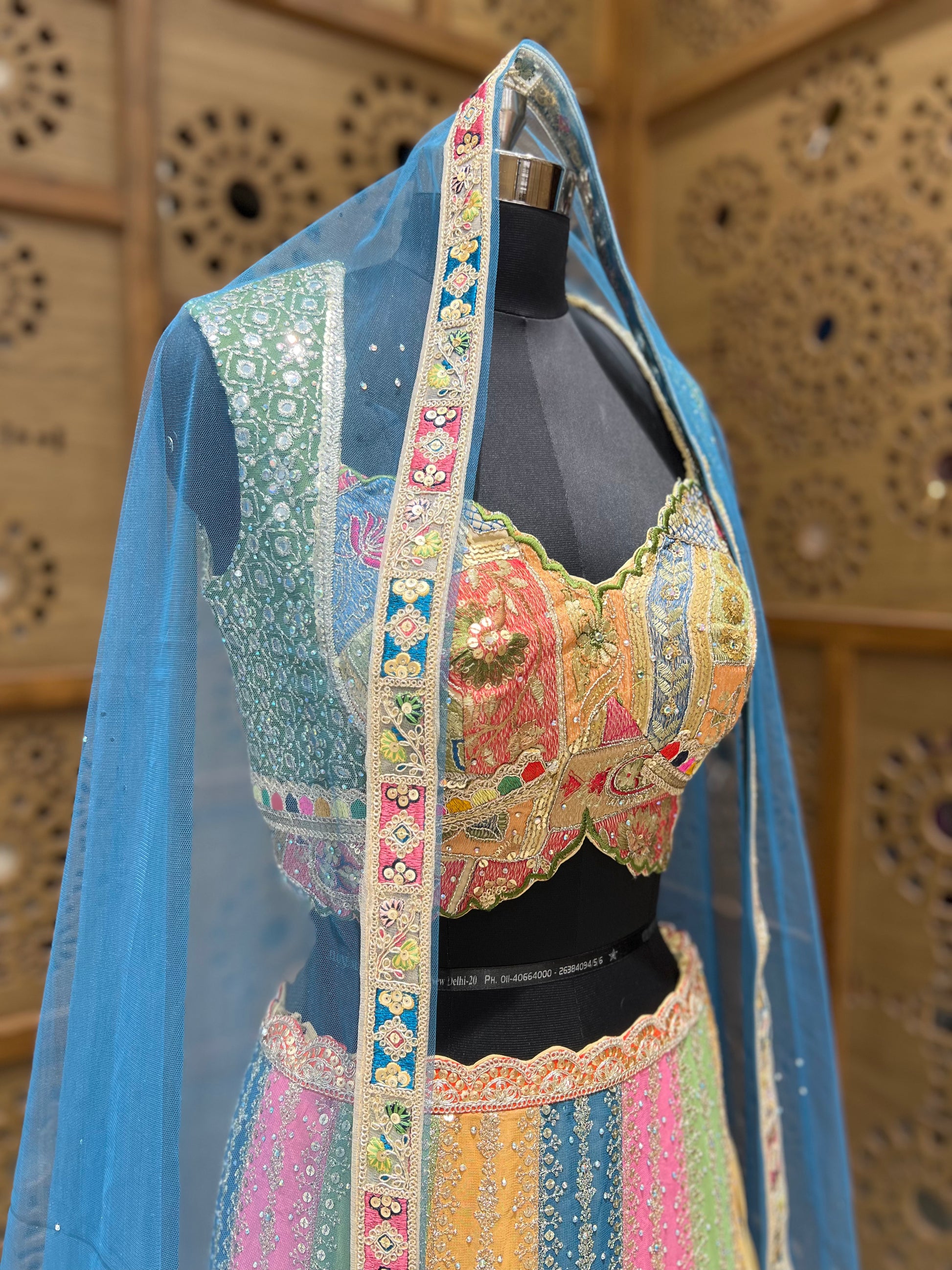 This lehnga choli is a colourful masterpiece of embroidery! Perfect for weddings and special occasions, it's sure to make a statement with its vibrant colors and intricate details. Spin and twirl in this stunning lehnga choli and feel like a true queen (or king) of the dance floor!