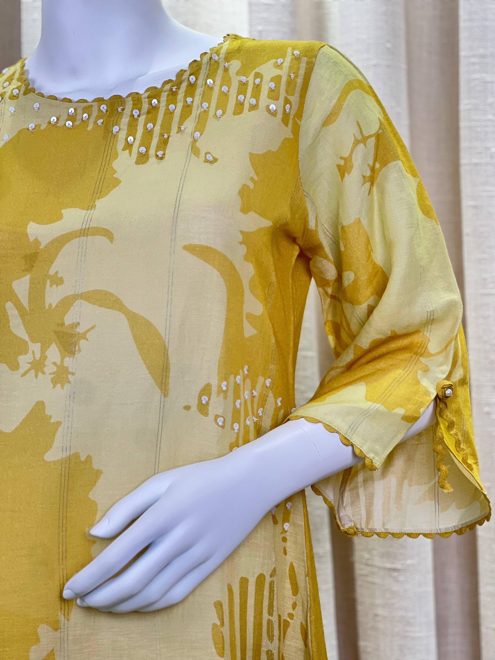 Brighten your everyday style with this refreshing mustard yellow and cream cotton kurta set, designed for both comfort and contemporary charm. The kurta features a flowing silhouette with abstract floral prints, complemented by subtle pearl bead embellishments around the neckline for a delicate, feminine touch.