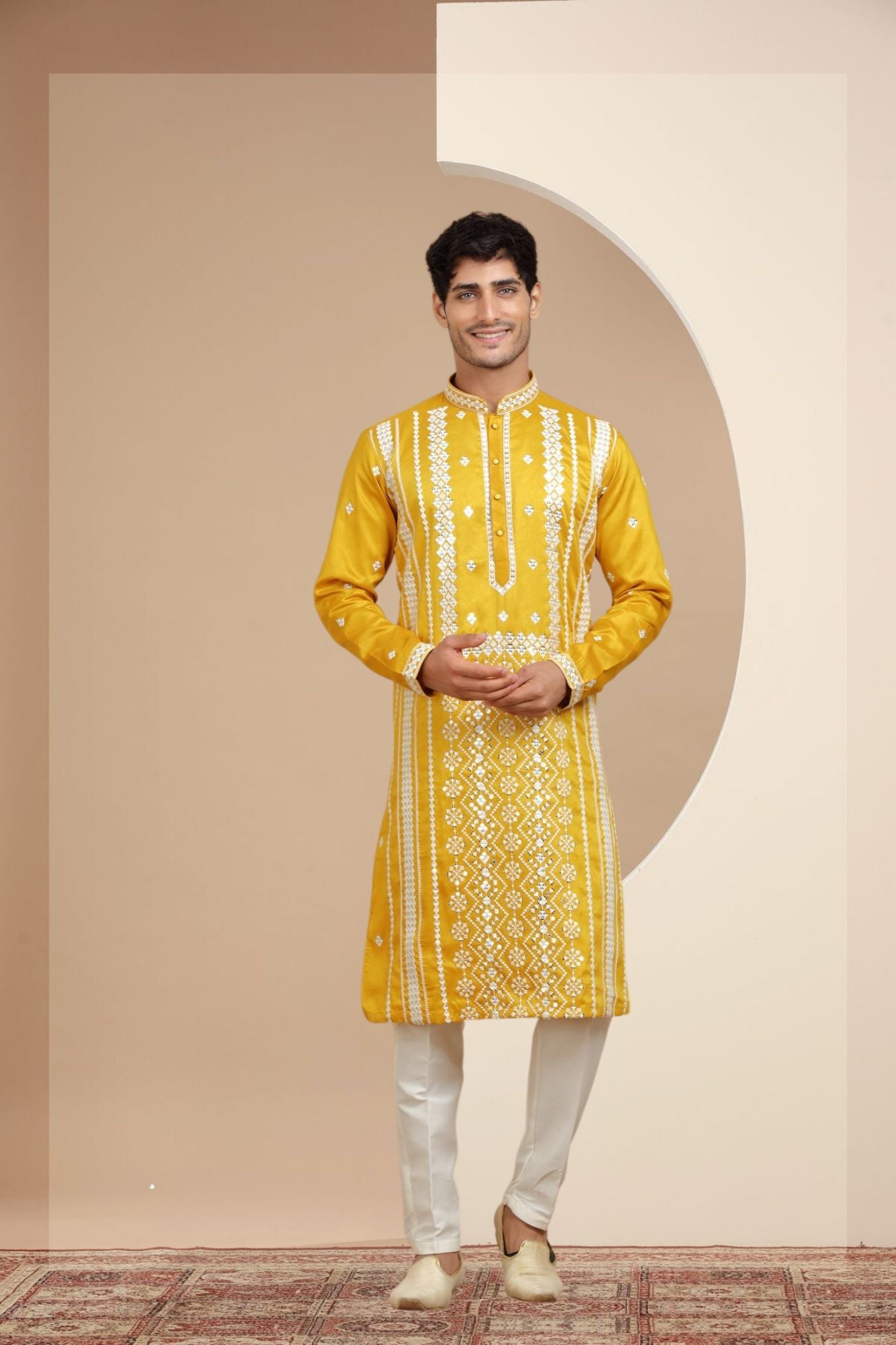 Mustard Yellow Mirror And Thread Embroidered Kurta Set