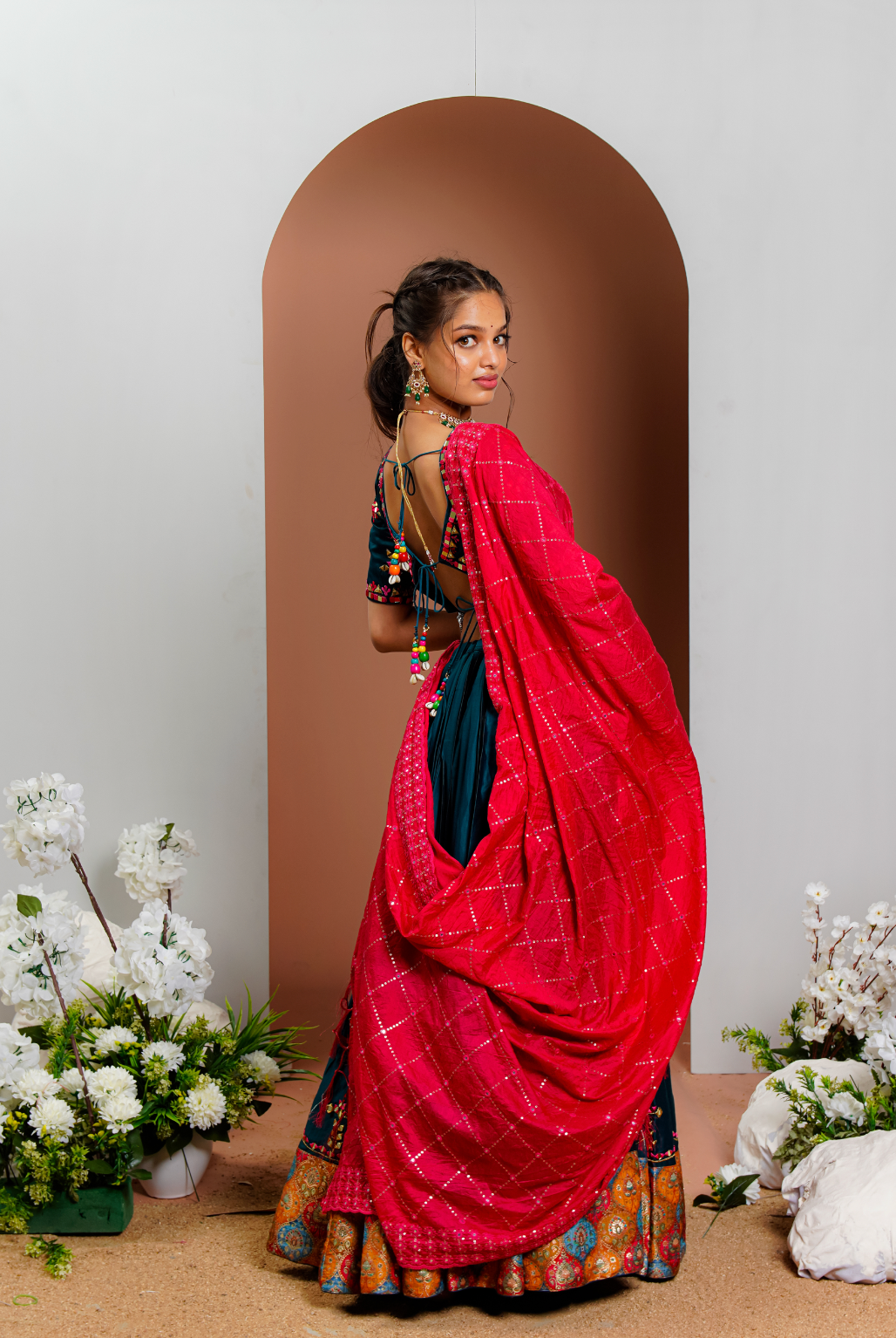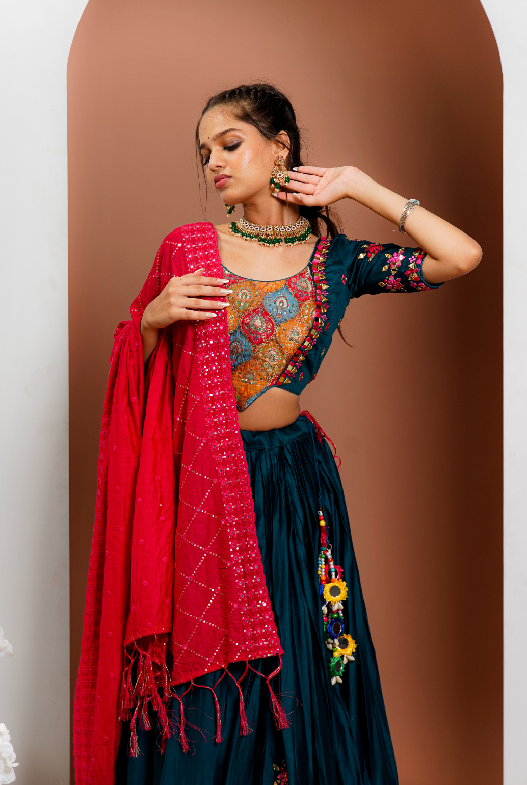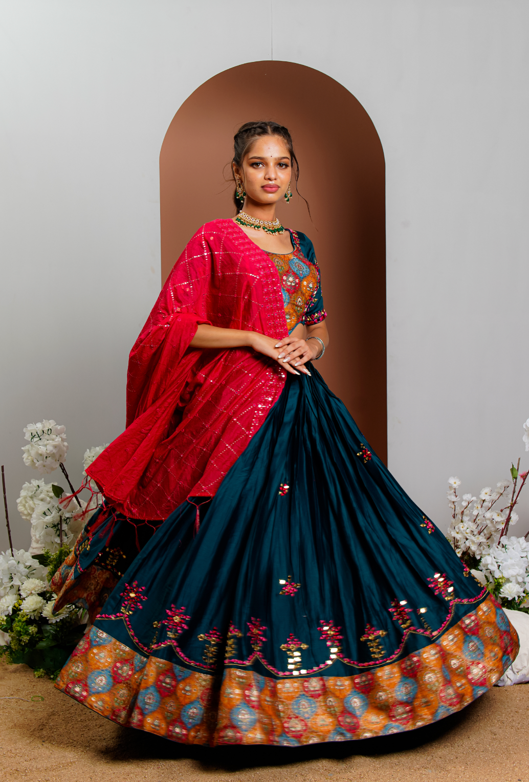 Get ready to turn heads with this stunning Navy Blue Mirror Work Chaniya Choli paired with a bold Red Dupatta. Perfect for any special occasion, this outfit combines traditional design with modern style. Stand out from the crowd and make a statement with this unique and eye-catching ensemble!