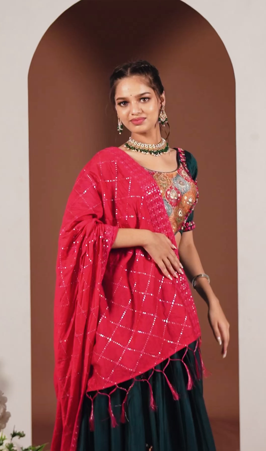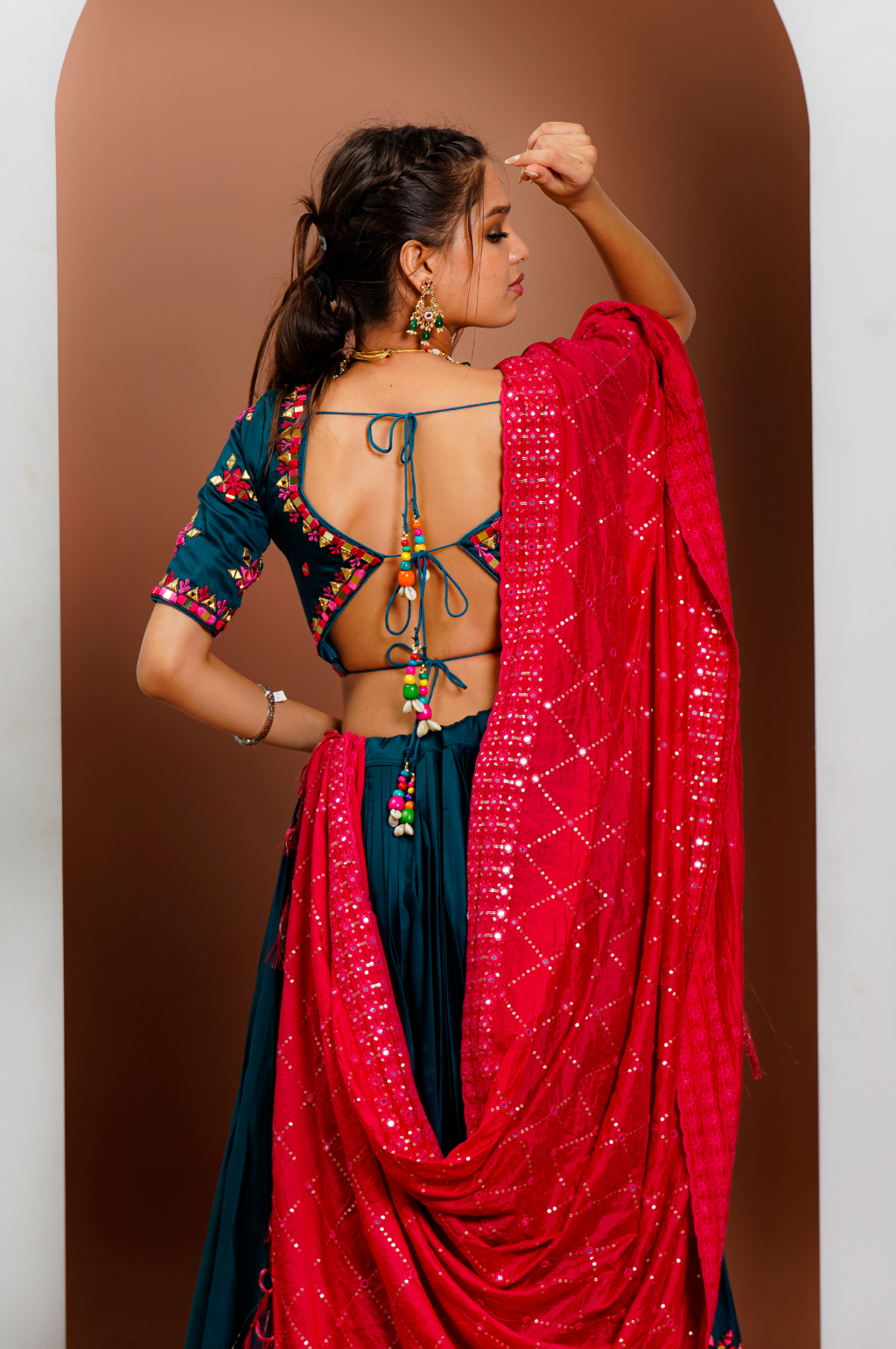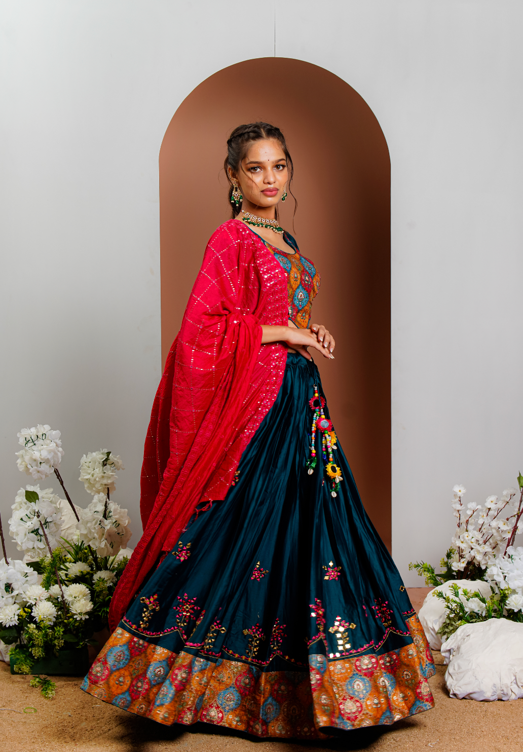 Get ready to turn heads with this stunning Navy Blue Mirror Work Chaniya Choli paired with a bold Red Dupatta. Perfect for any special occasion, this outfit combines traditional design with modern style. Stand out from the crowd and make a statement with this unique and eye-catching ensemble!
