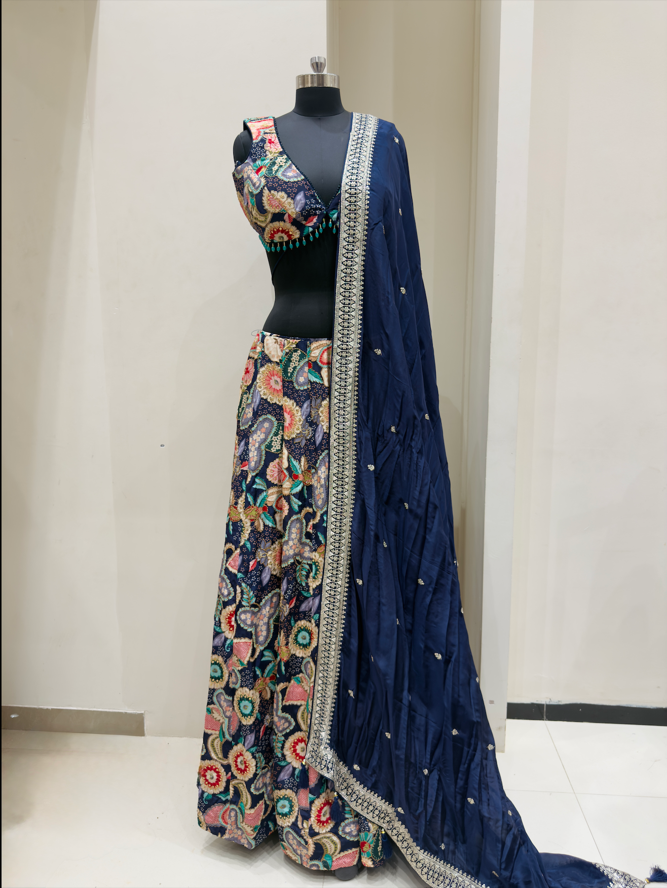 A vibrant blend of tradition and trend, this stunning lehenga set features a multicolour thread-embroidered lehenga paired with a deep navy blue blouse adorned with mirror work and playful tassel details. The ensemble is completed with a richly gathered navy dupatta, delicately embellished with mirror buttis and finished with a classic gota lace border. Perfect for mehendi nights, festive occasions, or sangeet ceremonies, this look is designed to make you stand out with effortless charm and grace.