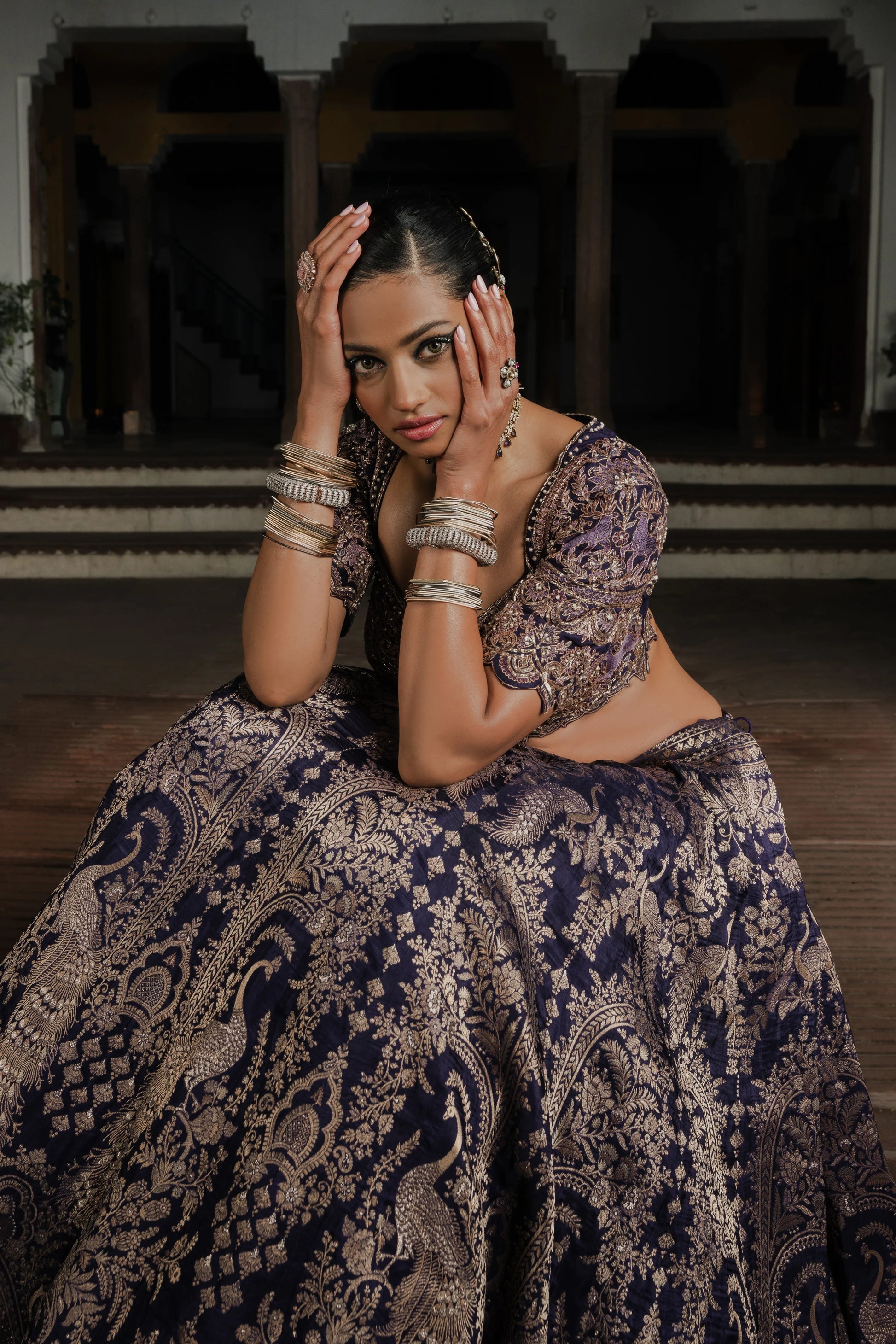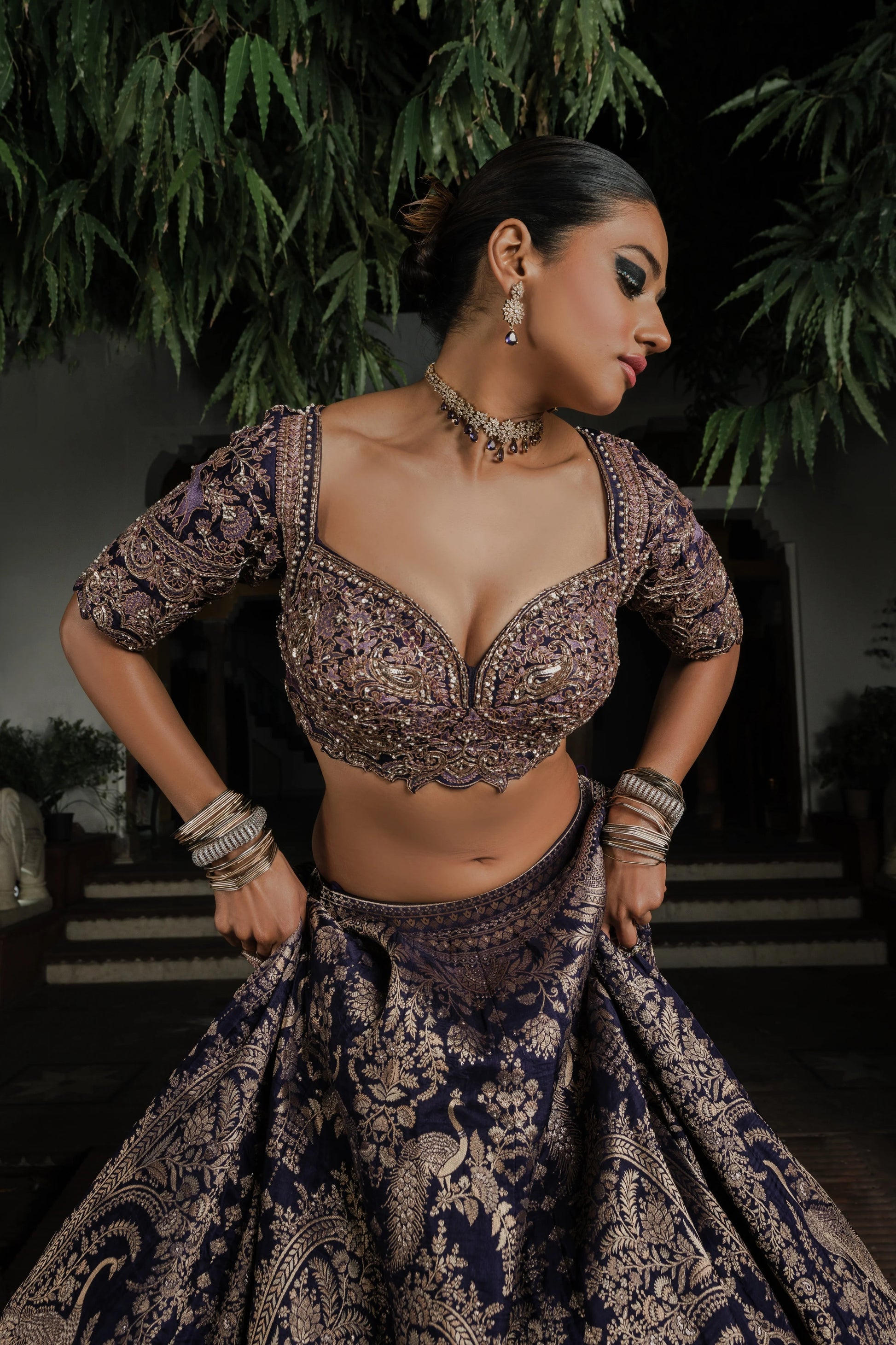 Whether styled for a grand wedding or a festive soirée, this piece commands attention with its intricate detailing and royal silhouette. Pair it with kundan or polki jewelry to elevate the ensemble further.