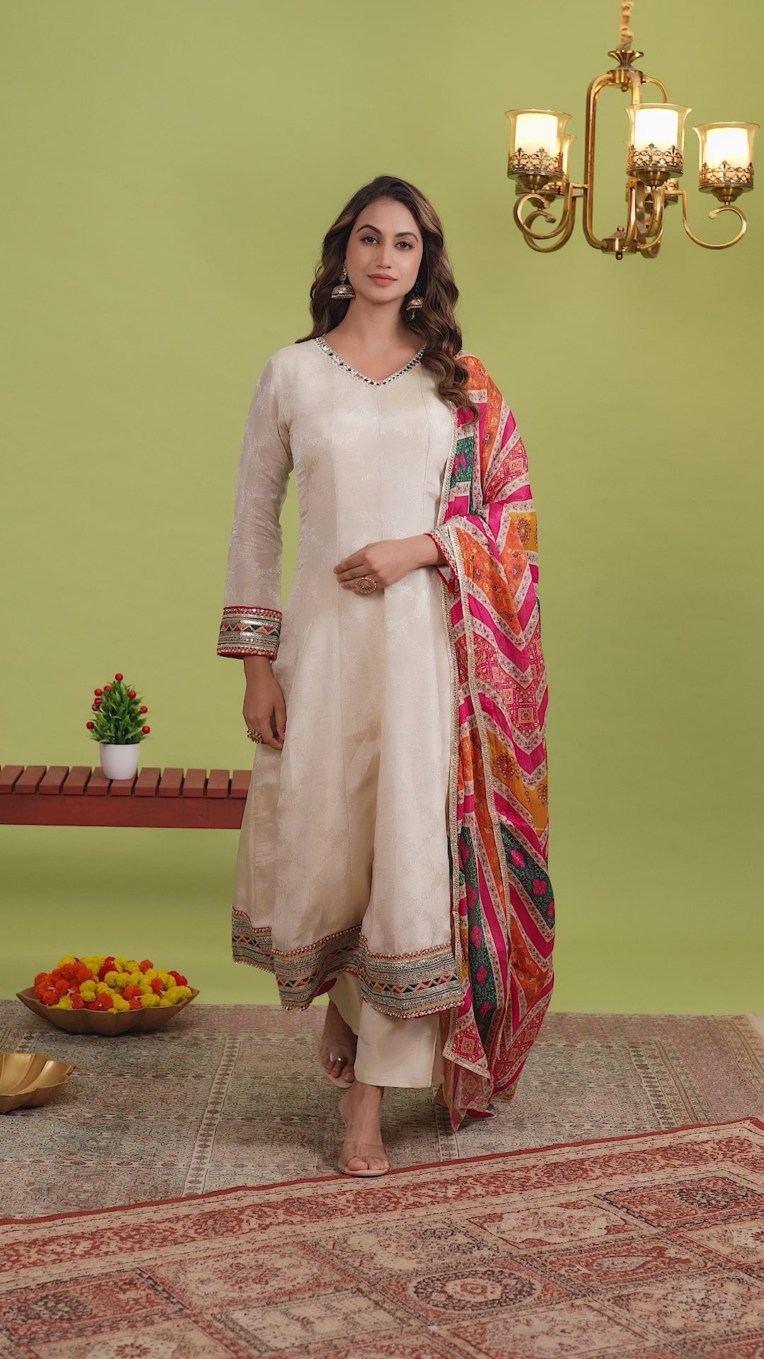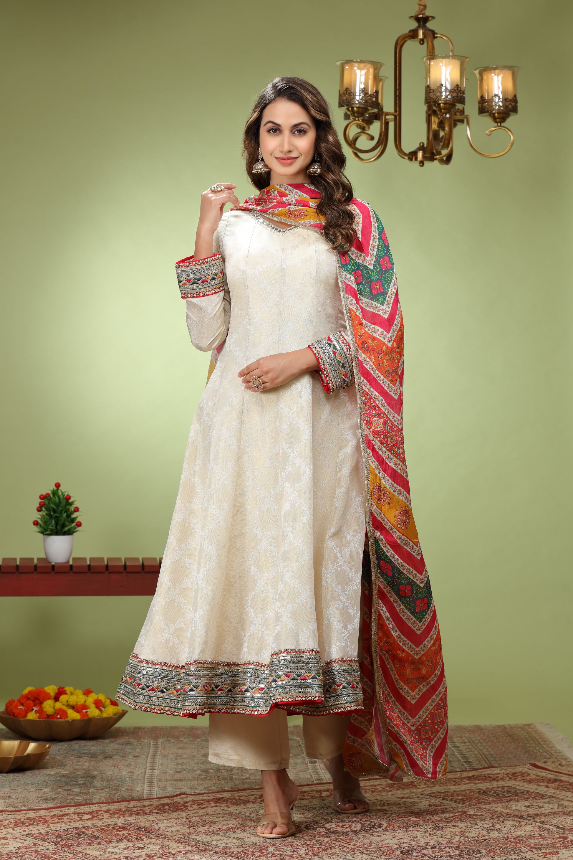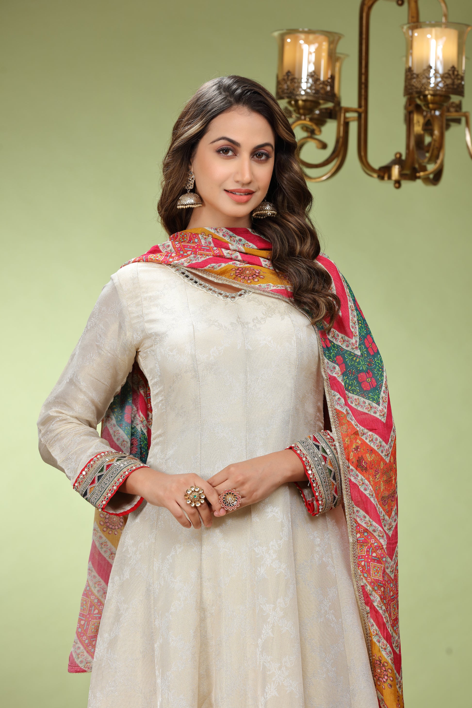 Off-White Embroidered Anarkali Suit with Printed Dupatta