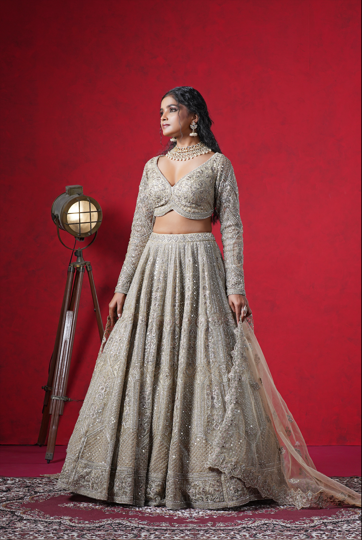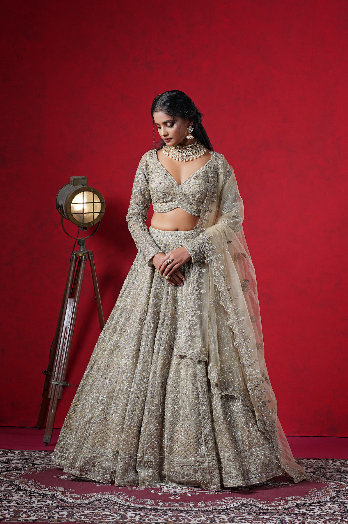 Radiate timeless grace in this off-white umbrella-style lehenga crafted in pure net. The ensemble features detailed resham, bead, pearl, zari, and sequins embroidery, lending a regal and textured appeal. It’s paired with a readymade V-neck full-sleeve blouse and a net dupatta finished with a gold embroidered border — perfect for wedding festivities or traditional celebrations.