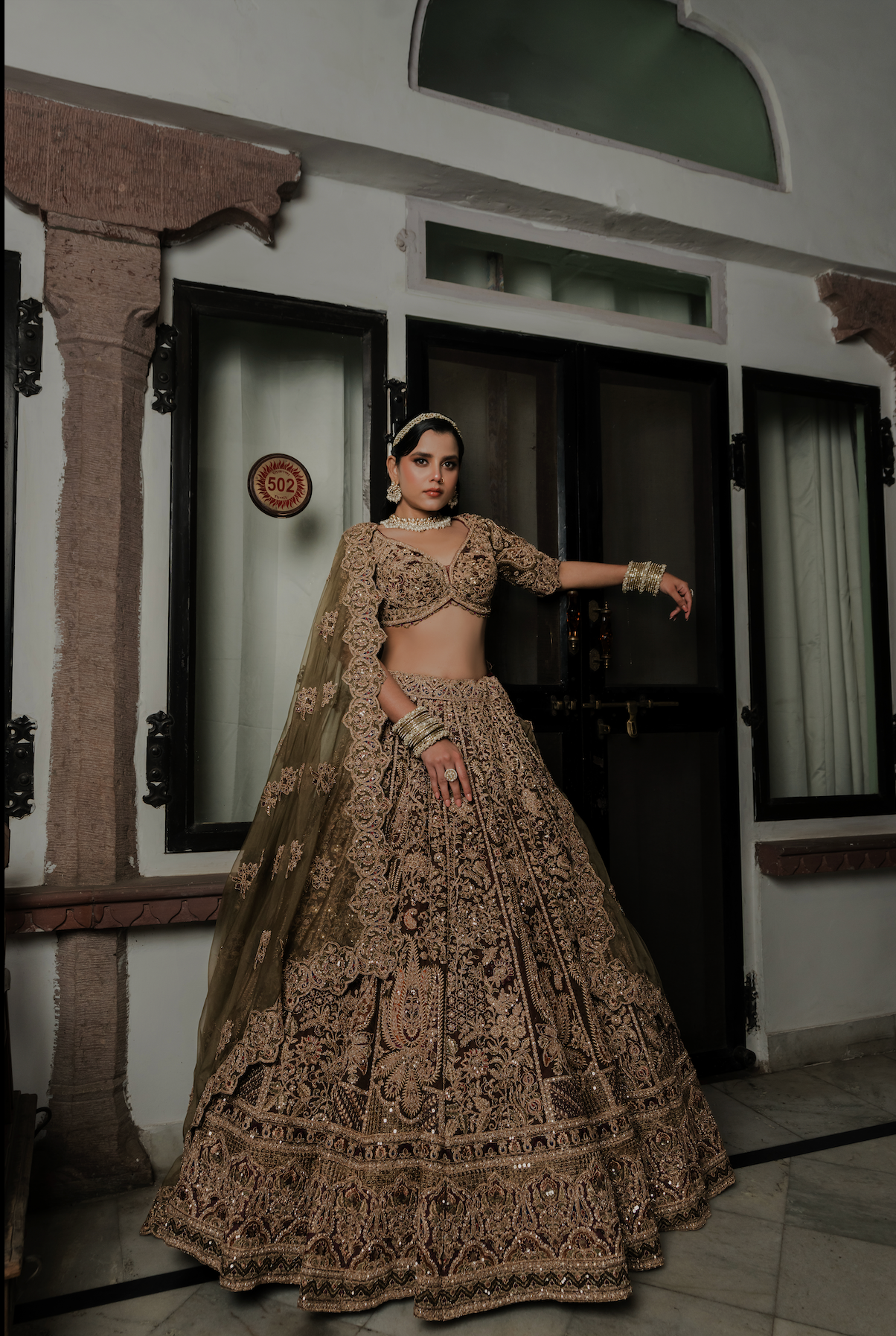 Step into subtle sophistication with this olive green flared lehenga in pure crepe. The ensemble features rich zari, resham, sequins, and dori embroidery across the lehenga, blouse, and dupatta. It comes with a readymade V-neck blouse with elbow sleeves and a matching dupatta bordered with intricate golden detailing — perfect for elegant festive occasions.