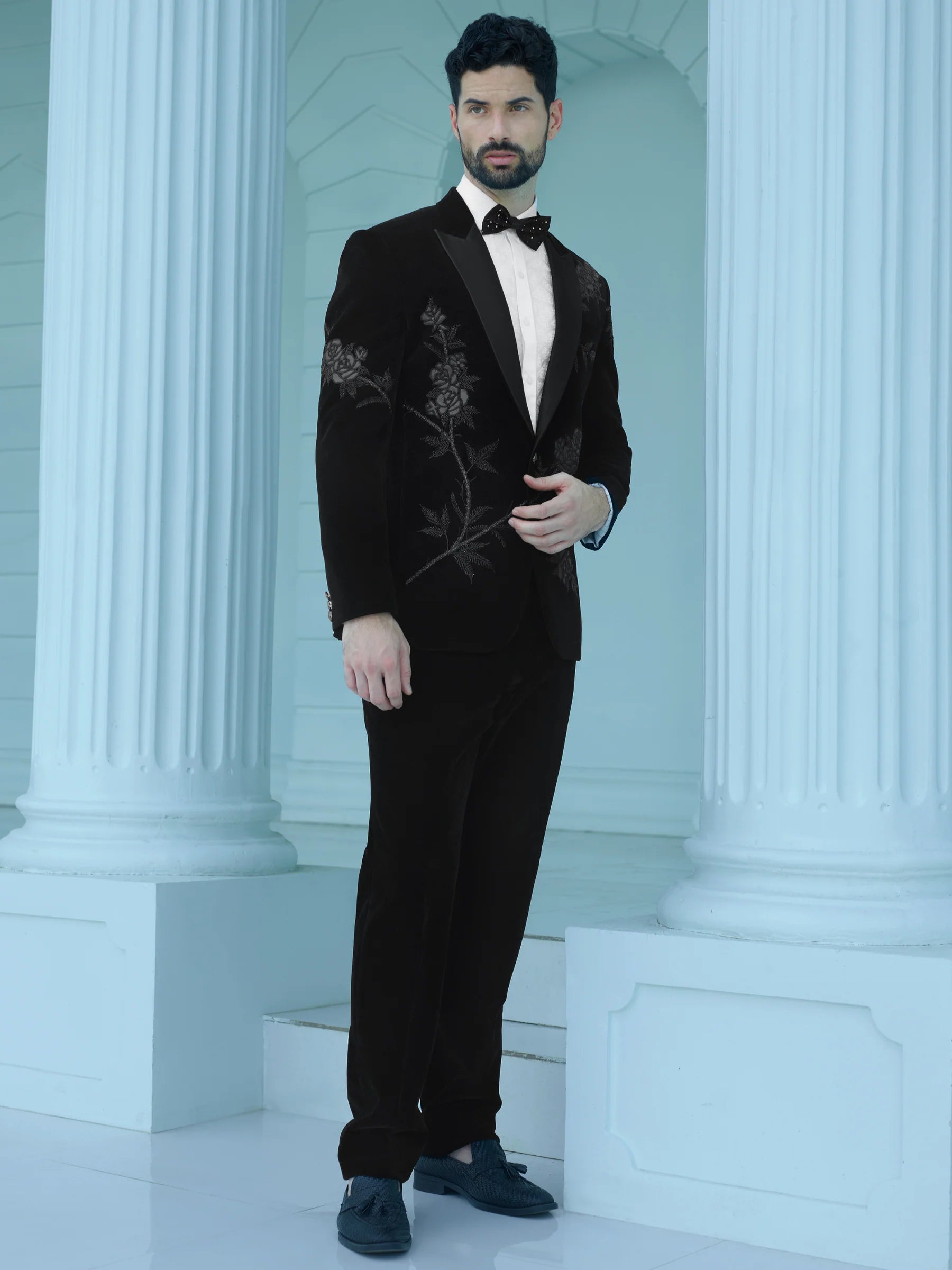 This luxurious black velvet suit features a beautiful floral design, adding a touch of opulence to any occasion. Elevate your style and make a statement with this elegant suit. Perfect for a sophisticated and chic look.