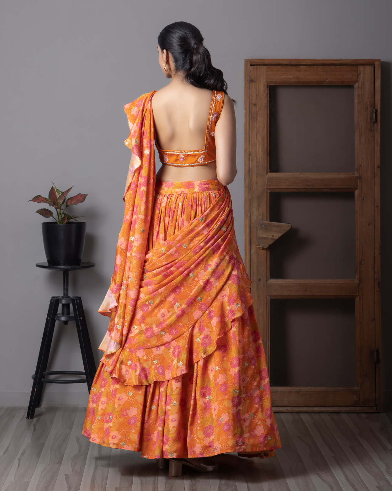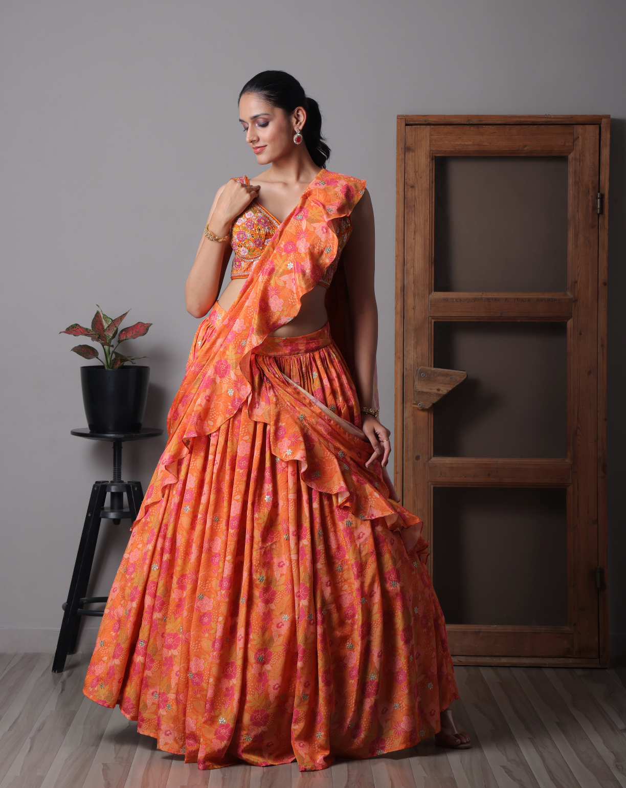 Unleash your inner fashionista with our Orange Flora Printed Pre-Draped Lehnga! The stunning print and easy draping make it both stylish and convenient. Perfect for any occasion, this lehnga will have you turning heads and feeling confident. Effortlessly elevate your wardrobe with this one-of-a-kind piece! (Limited stock available!)