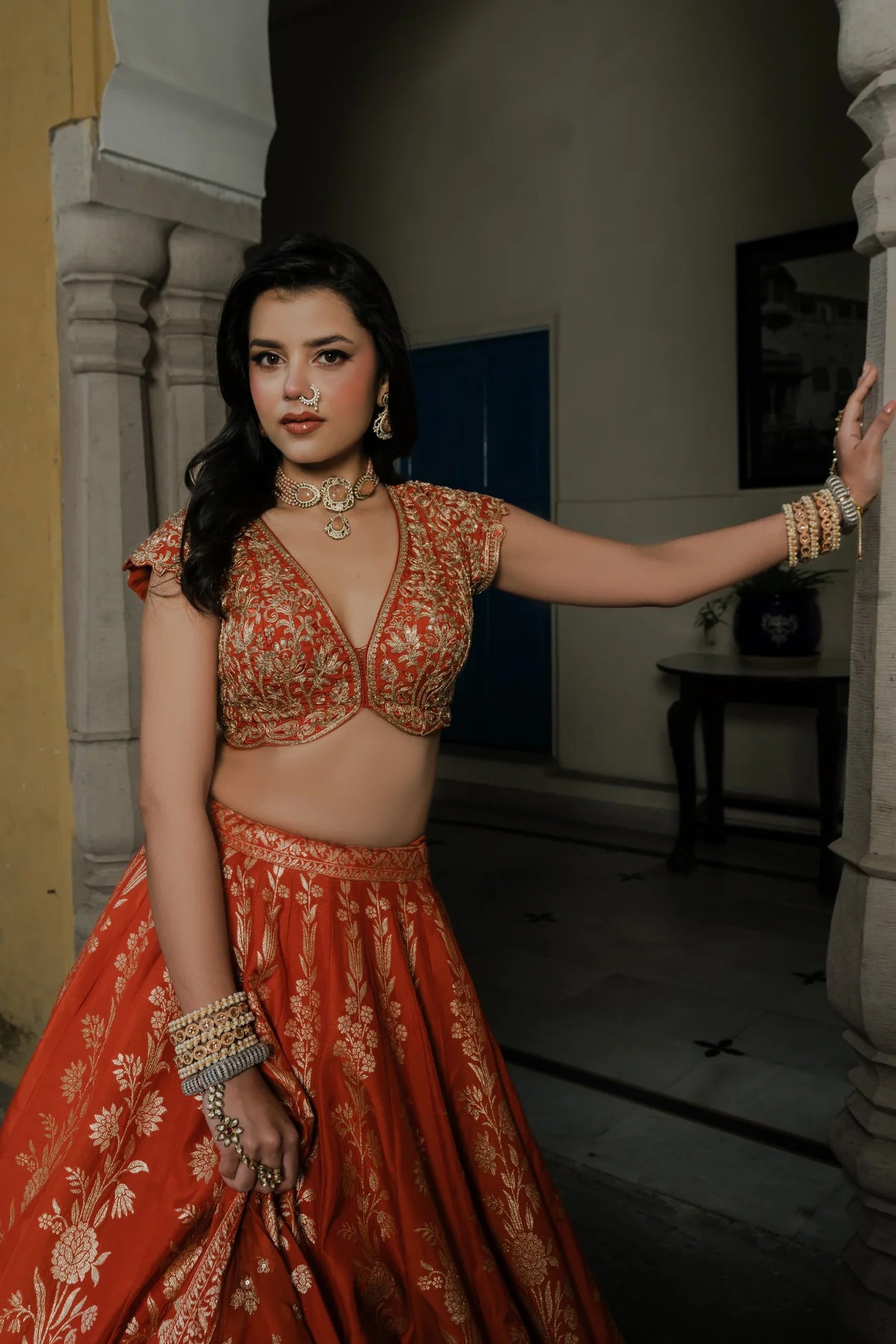 Immerse yourself in timeless elegance with this Orange Silk Lehenga Set, crafted from lustrous silk and intricately adorned with silver zari and resham embroidery. The flared lehenga showcases delicate floral and foliage motifs that cascade gracefully, radiating regal charm and opulence. Its vibrant orange hue adds a bold yet graceful touch, making it a standout choice for any grand occasion.