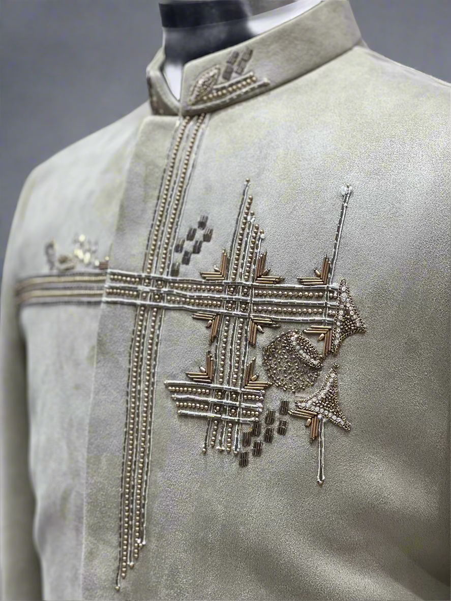 Make a subtle yet majestic statement with this pastel green sherwani, crafted in plush suede-finish fabric. The high-neck collar and straight-cut silhouette offer a classic royal vibe, while the hand-embroidered floral and motif design on the shoulder adds a regal focal point. Ideal for engagements, day weddings, or traditional ceremonies, this sherwani blends modern minimalism with traditional elegance for the modern groom or groomsmen.