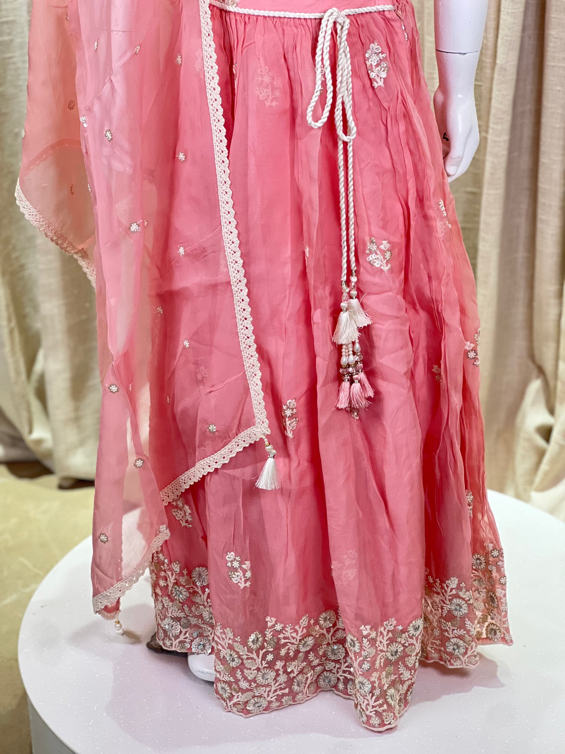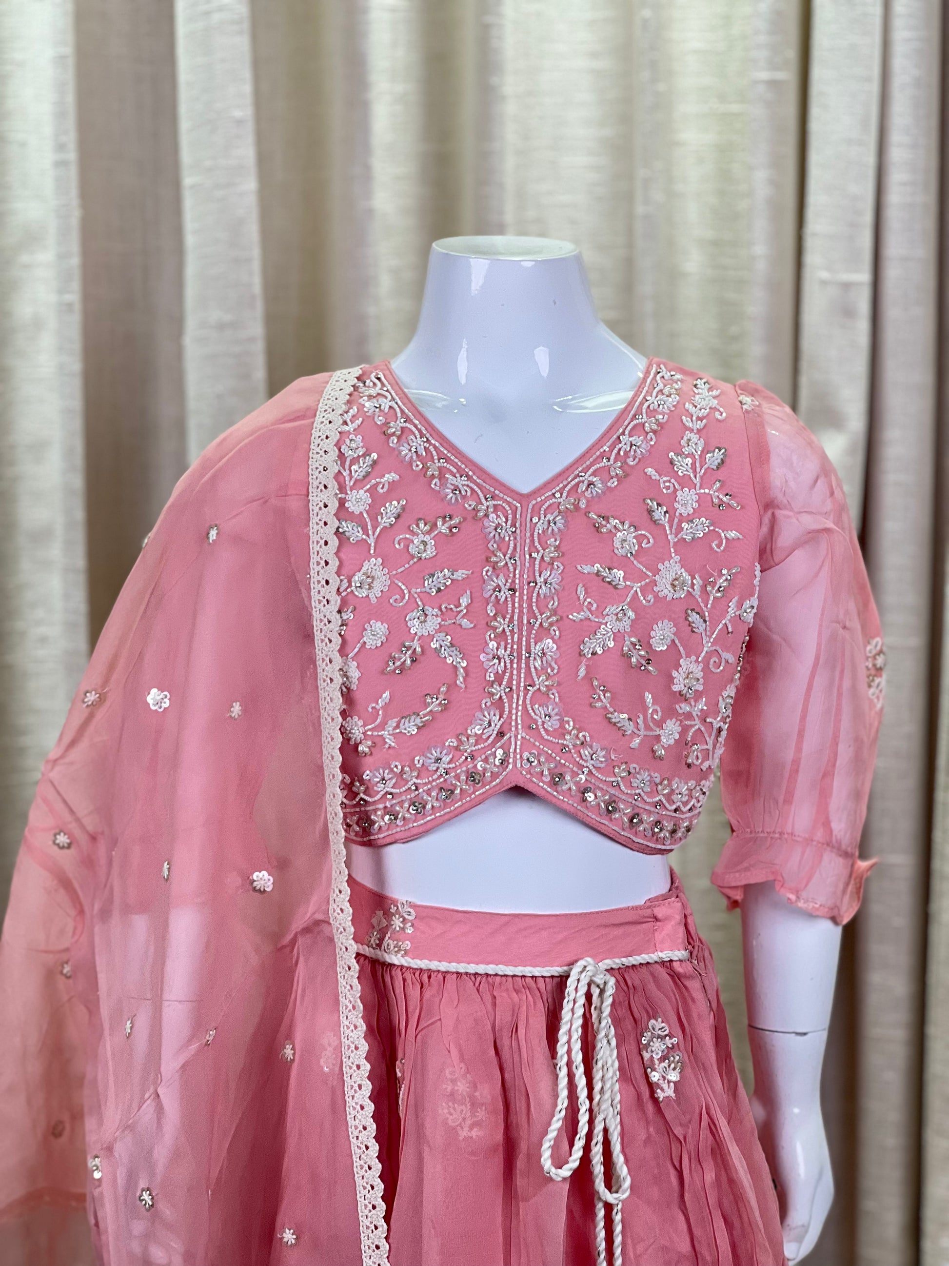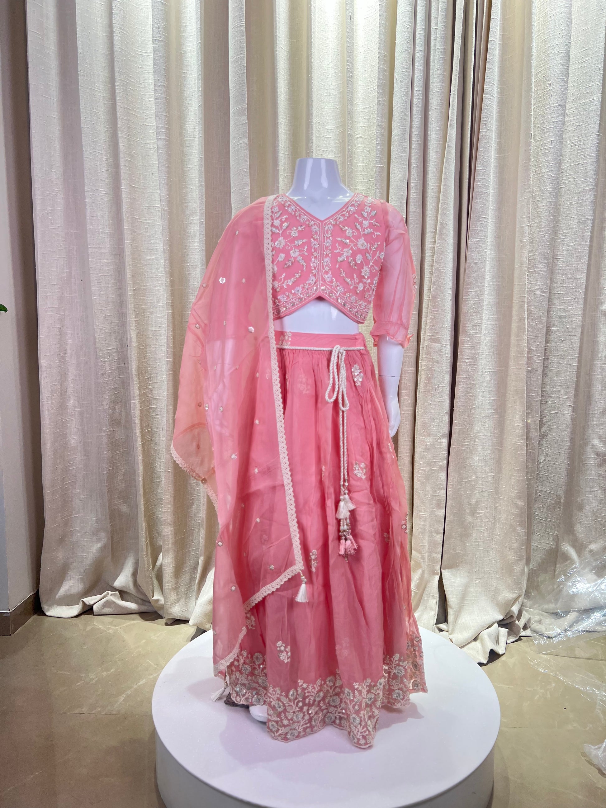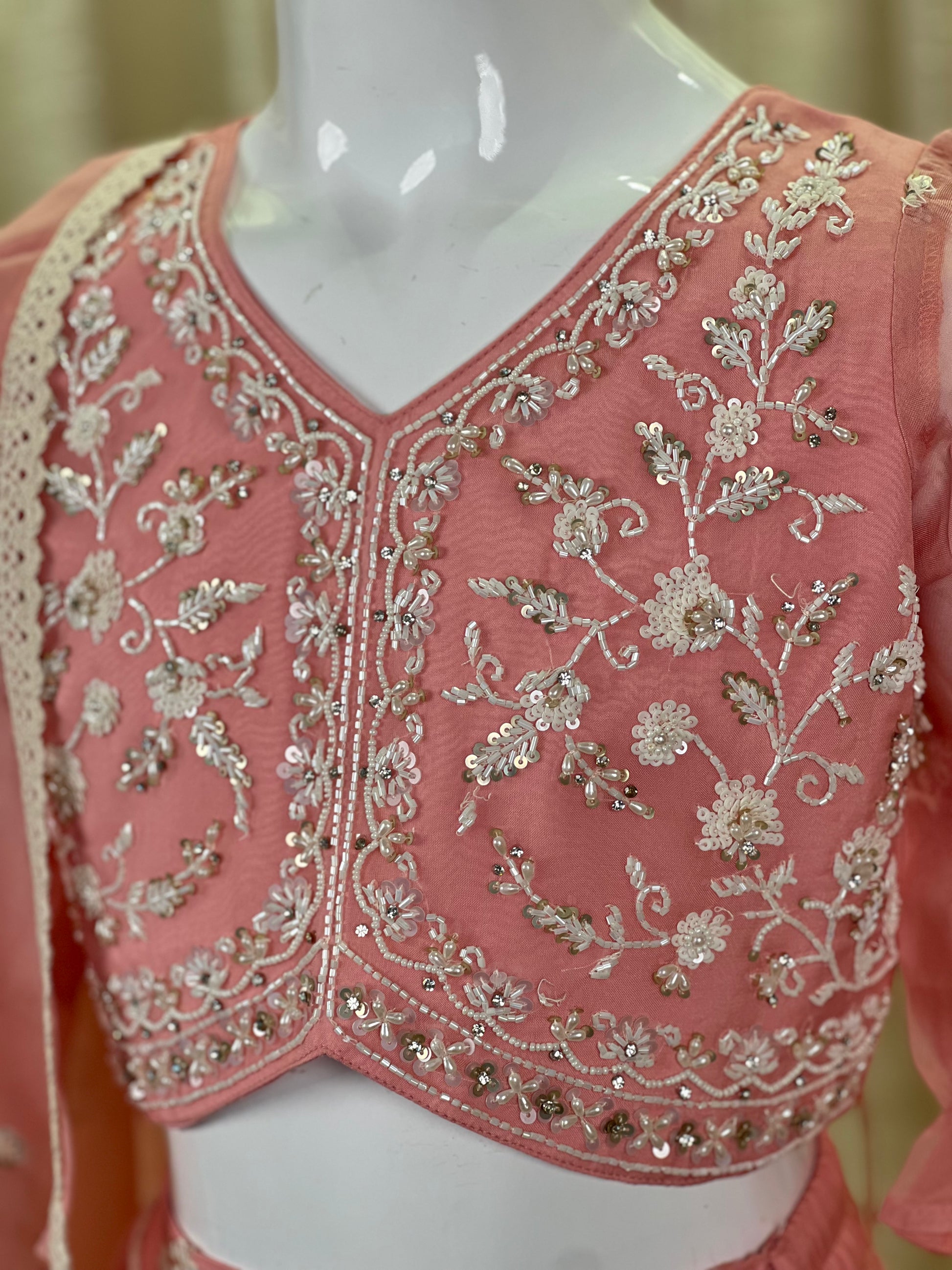This charming peach lehenga set features delicate embroidery with white thread and sequin work, creating a soft and elegant look. The set includes a sleeveless embroidered blouse with sheer puff sleeves, a flowy lehenga with a tasseled drawstring waist, and a matching organza dupatta detailed with pearl-like accents and lace edging. Lightweight and festive, this outfit is perfect for traditional celebrations, weddings, and special occasions.
