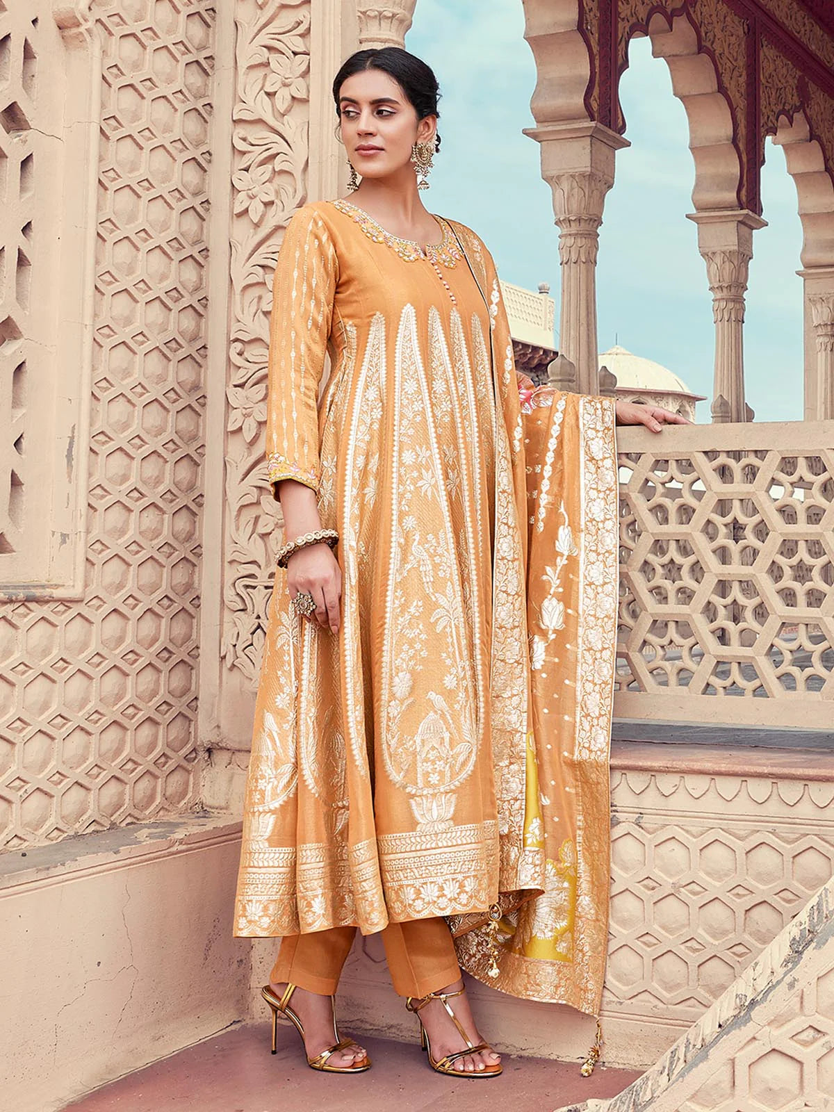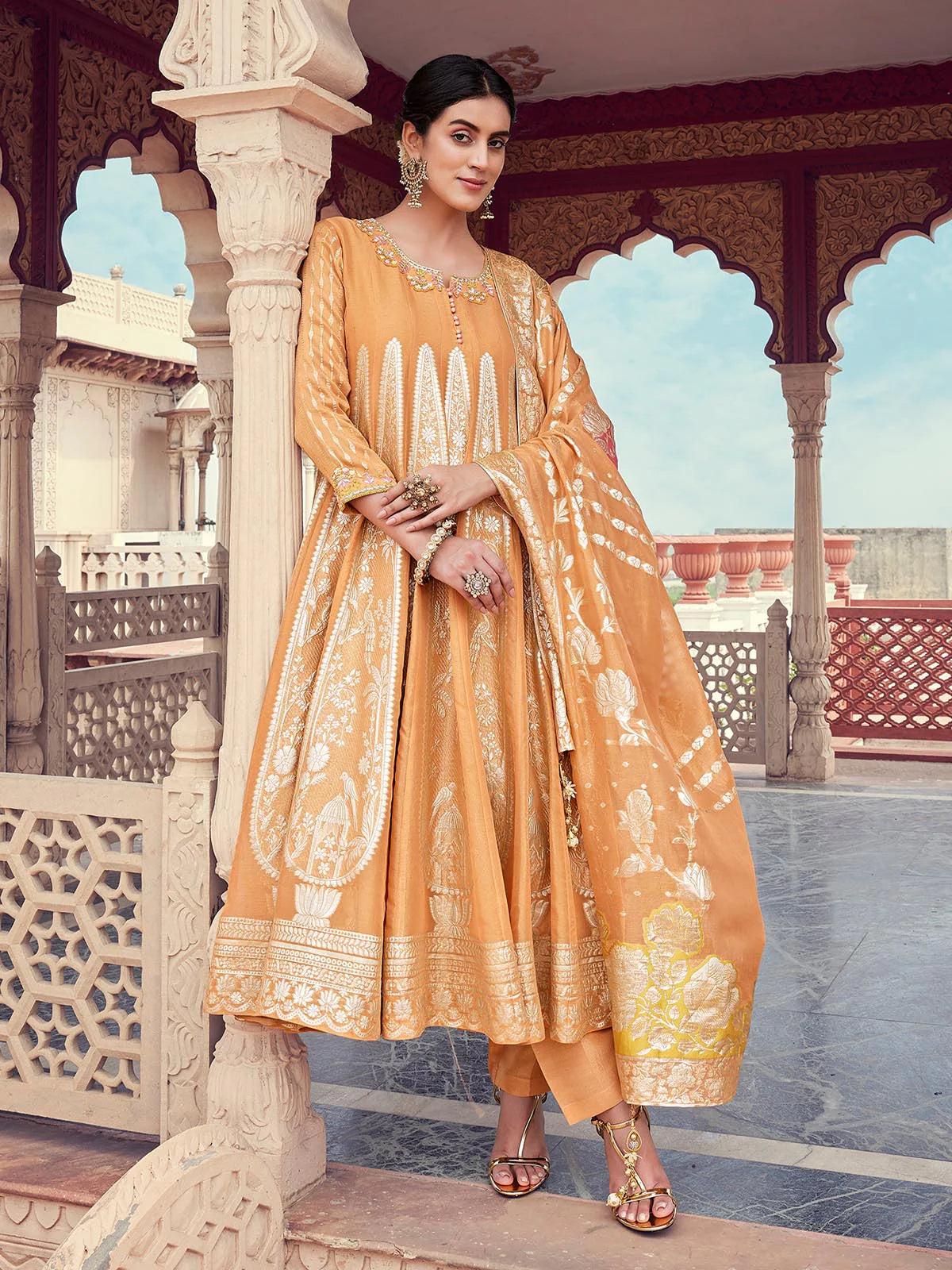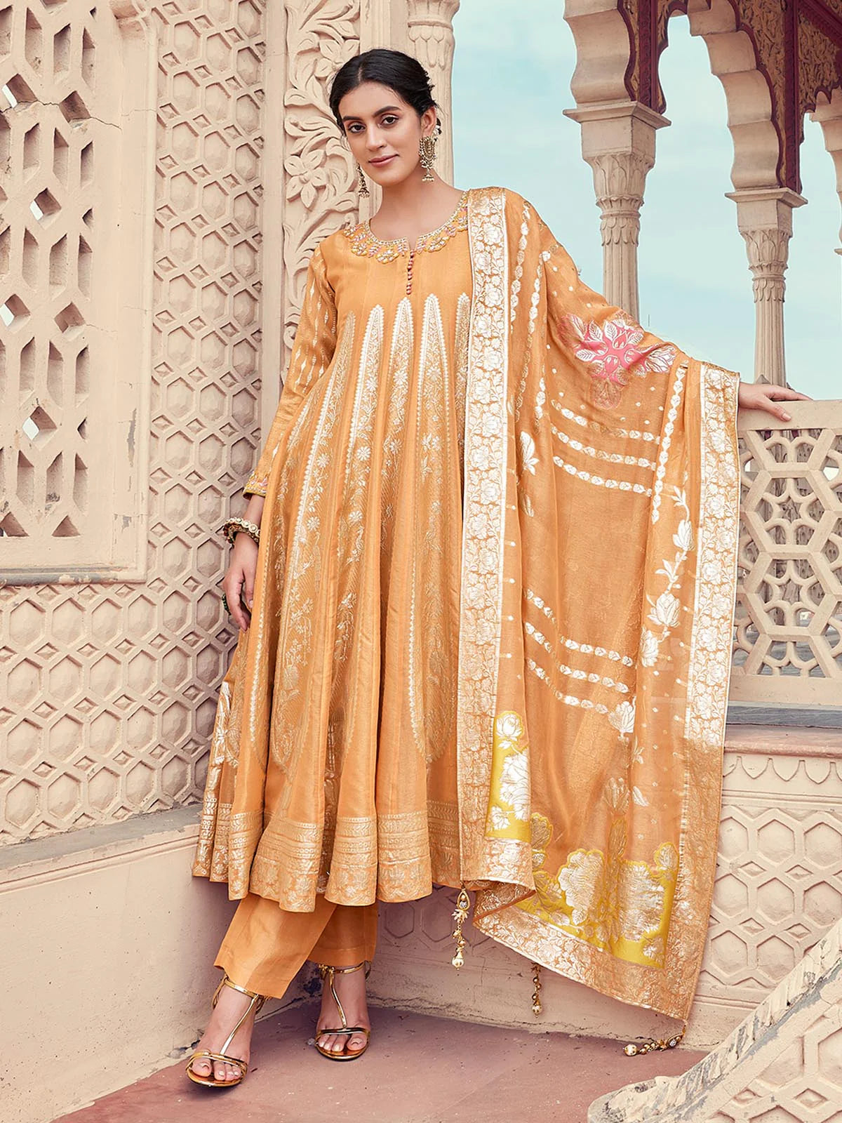 As she enters the festive gathering, her peach anarkali cascades around her, made from a refined blend of organza and jacquard woven floral motifs. The zardosi-embroidered yoke catches the light, adding a touch of sparkle. With every twirl, the anarkali's graceful flare pairs effortlessly with peach silk pants and a dupatta featuring floral jacquard patterns, finished with charming tassels.