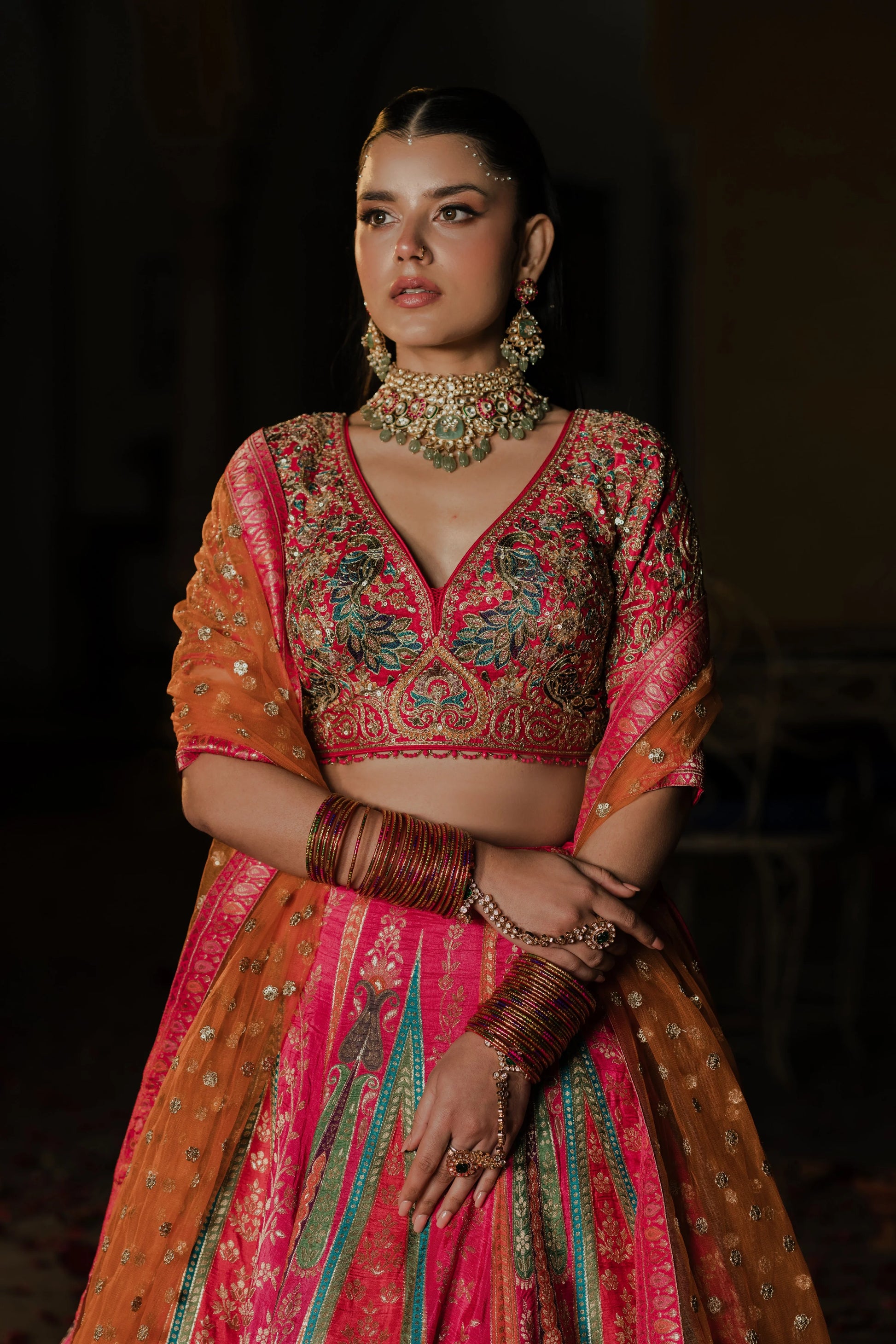 Step into a world of regal charm with this exquisite Pink lehenga set, intricately crafted to celebrate heritage craftsmanship. The V-neck blouse features elaborate hand-embroidered floral motifs in resham, sequins, and zardosi work, highlighted with hints of green and metallic hues on a rich coral base. The blouse is styled with half sleeves and finished with delicate bead edging, adding a traditional yet refined touch.