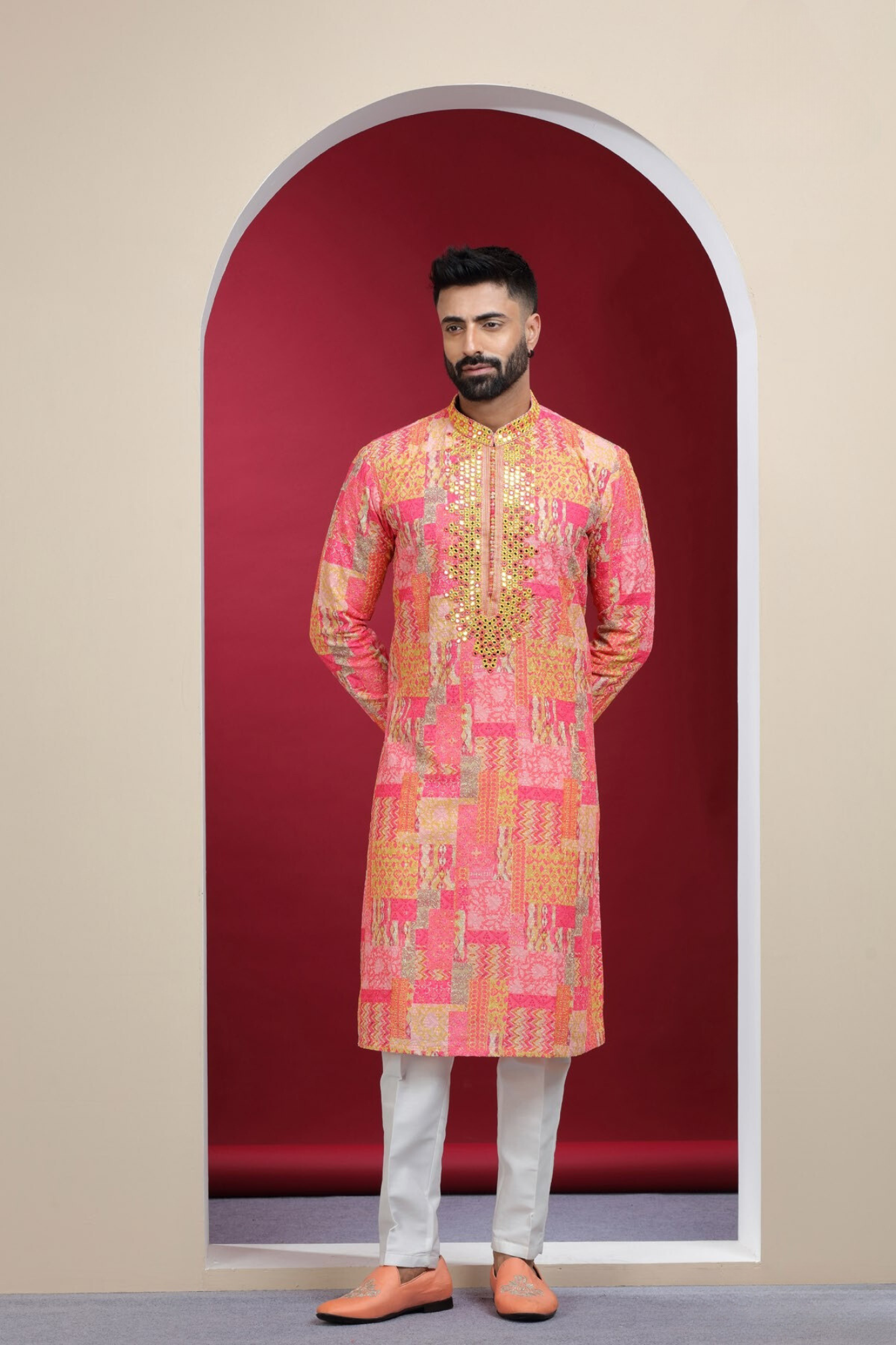 Get ready to stand out in this Pink Mirror Work & Printed Kurta Set! With intricate mirror work and a stylish printed design, this set is perfect for any occasion. Express your unique style and turn heads with this fun and quirky outfit. Available now!