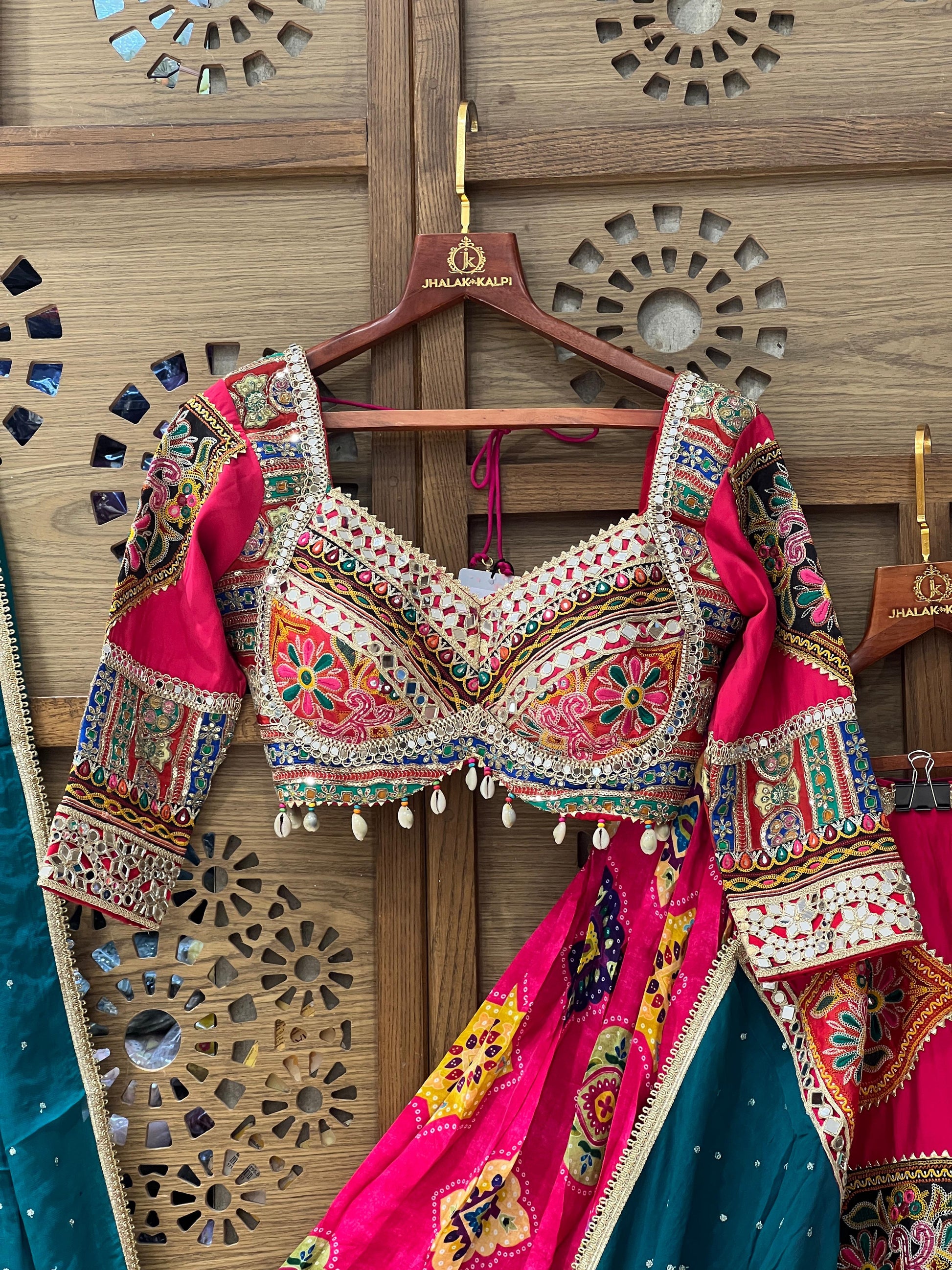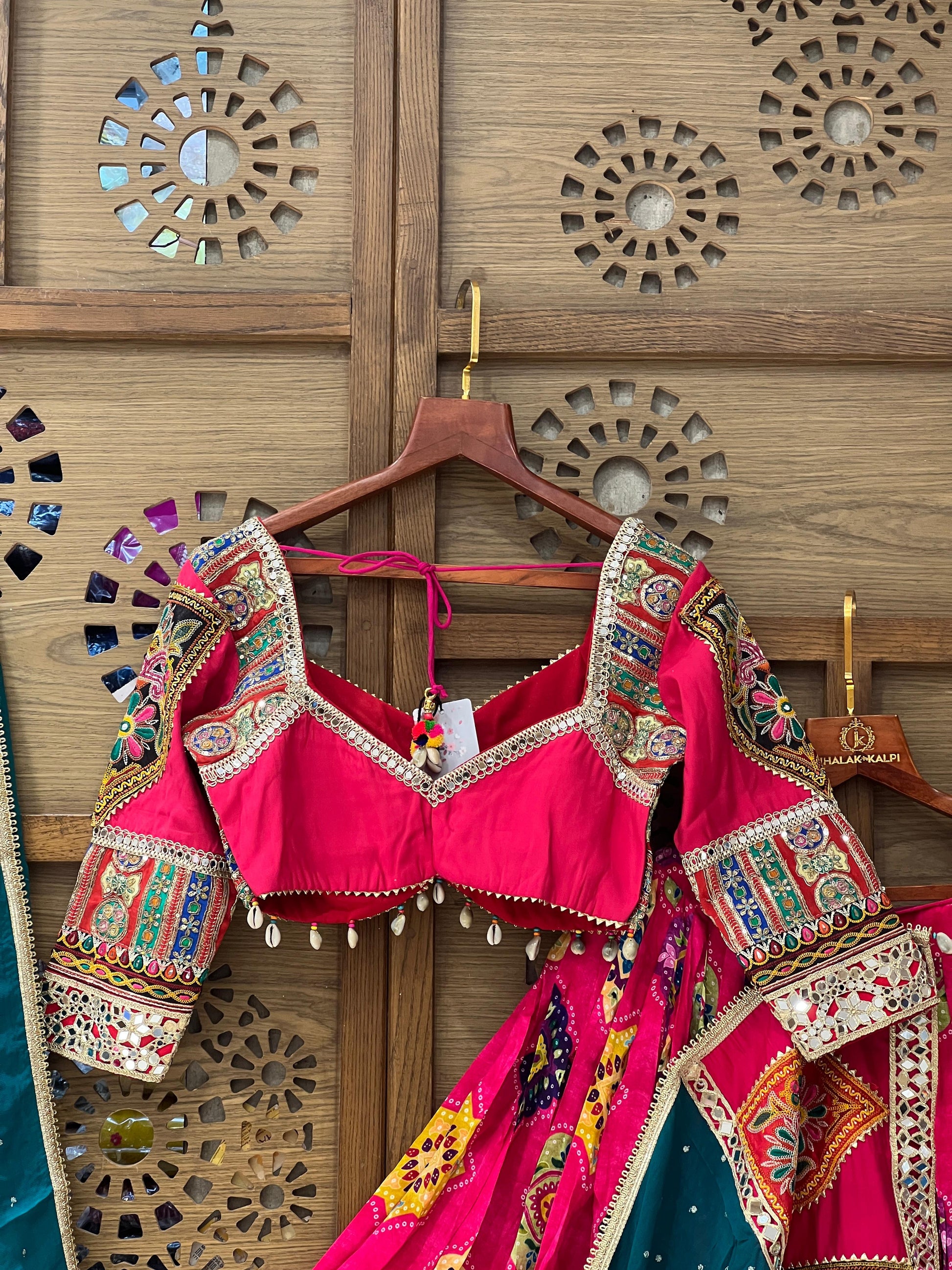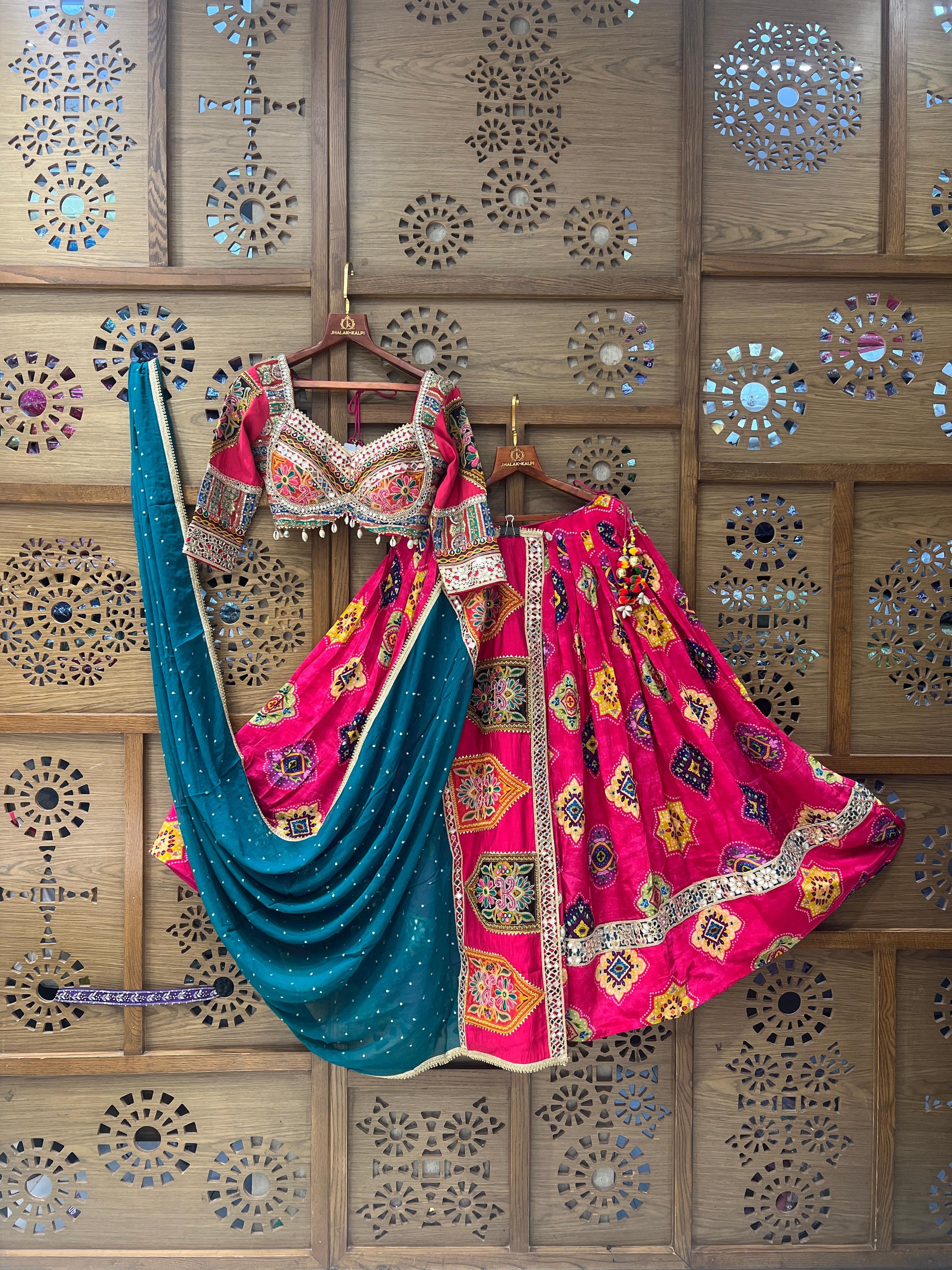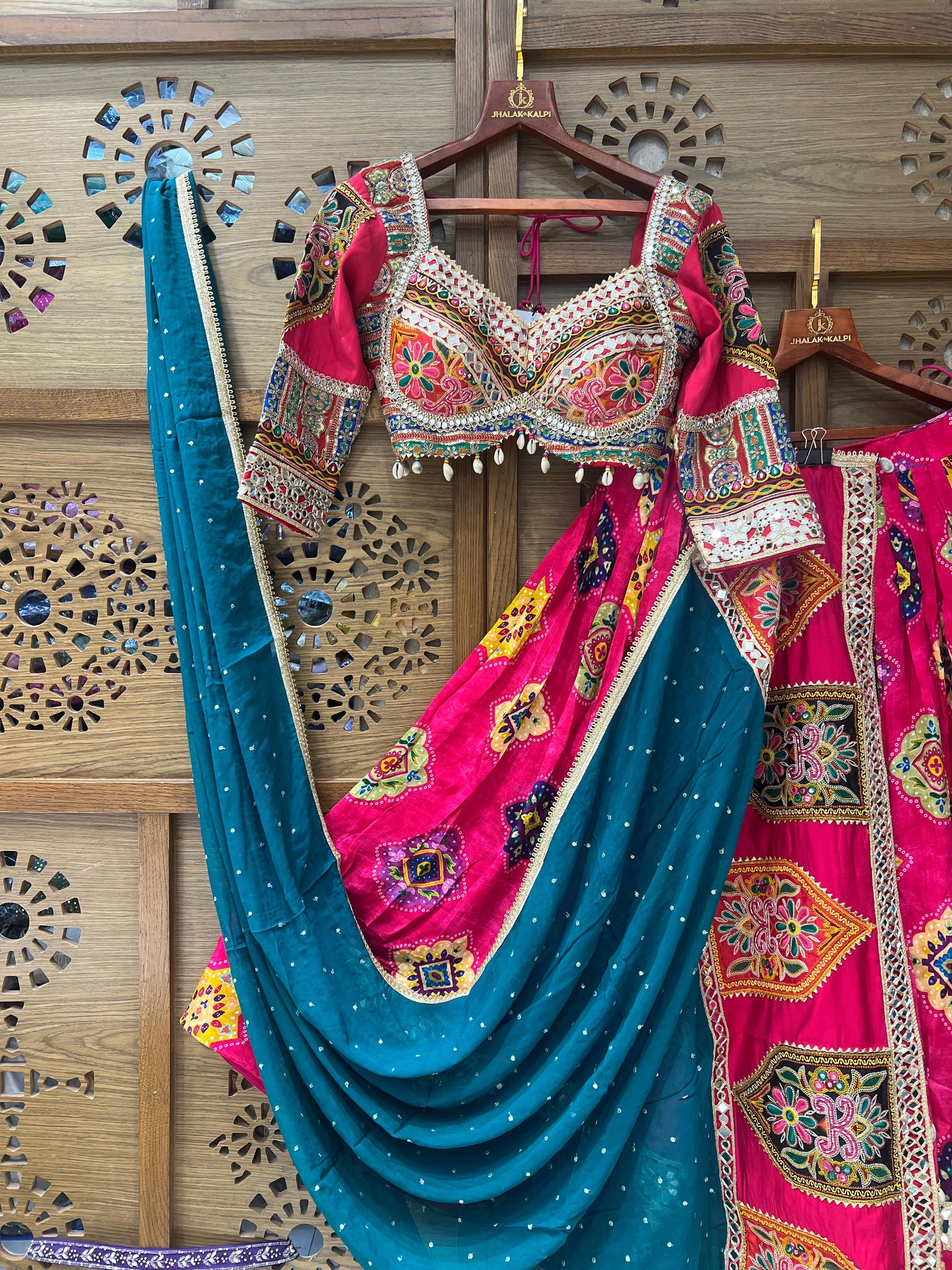 Dazzle this festive season in this vibrant pink chaniya choli set, adorned with intricate Kutchi-inspired embroidery and mirror work. The richly designed blouse features detailed threadwork and traditional motifs, paired with a flared pink skirt highlighted with colorful embroidered patches and a touch of mirror embellishments. A contrasting teal dupatta with delicate detailing completes the look, making it an ideal choice for Navratri, weddings, and grand festive celebrations.