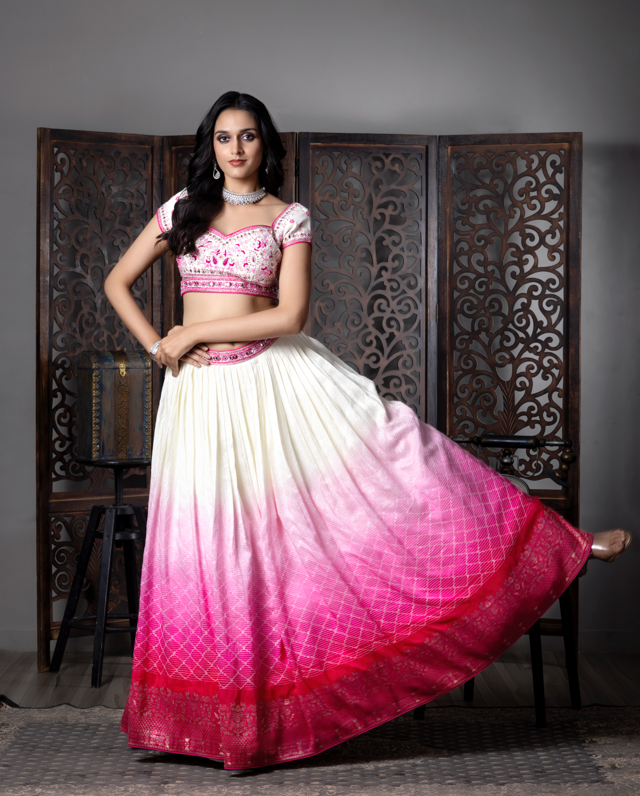 Look pretty in pink with our Pink & White Banarasi touch Lehnga Choli! This unique lehenga choli features beautiful embroidery on the blouse for a touch of elegance. Get ready to turn heads in this playful and stylish outfit.