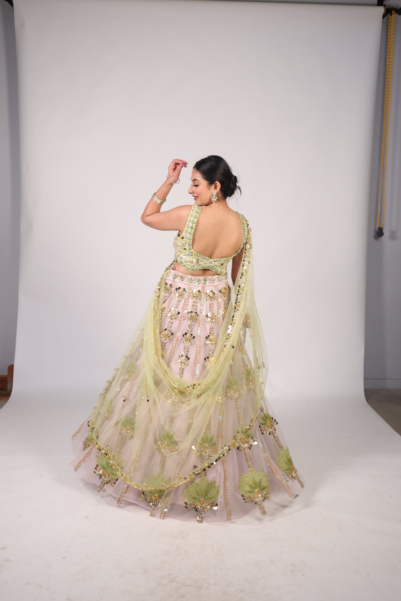 Pistachio Green & Blush Pink Hand-Embroidered Festive Lehenga Choli